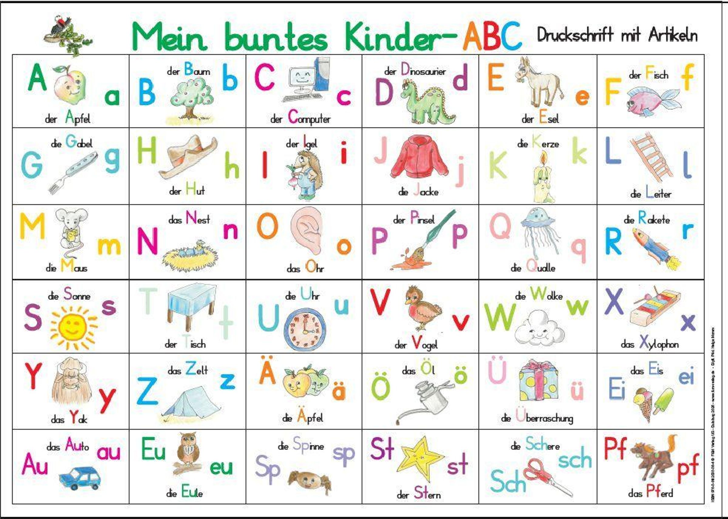 Mein buntes Kinder-ABC Lernposter DINA 4 in Druckschrift mit Artikeln laminiert So macht das ABC-Lernen Spaß!