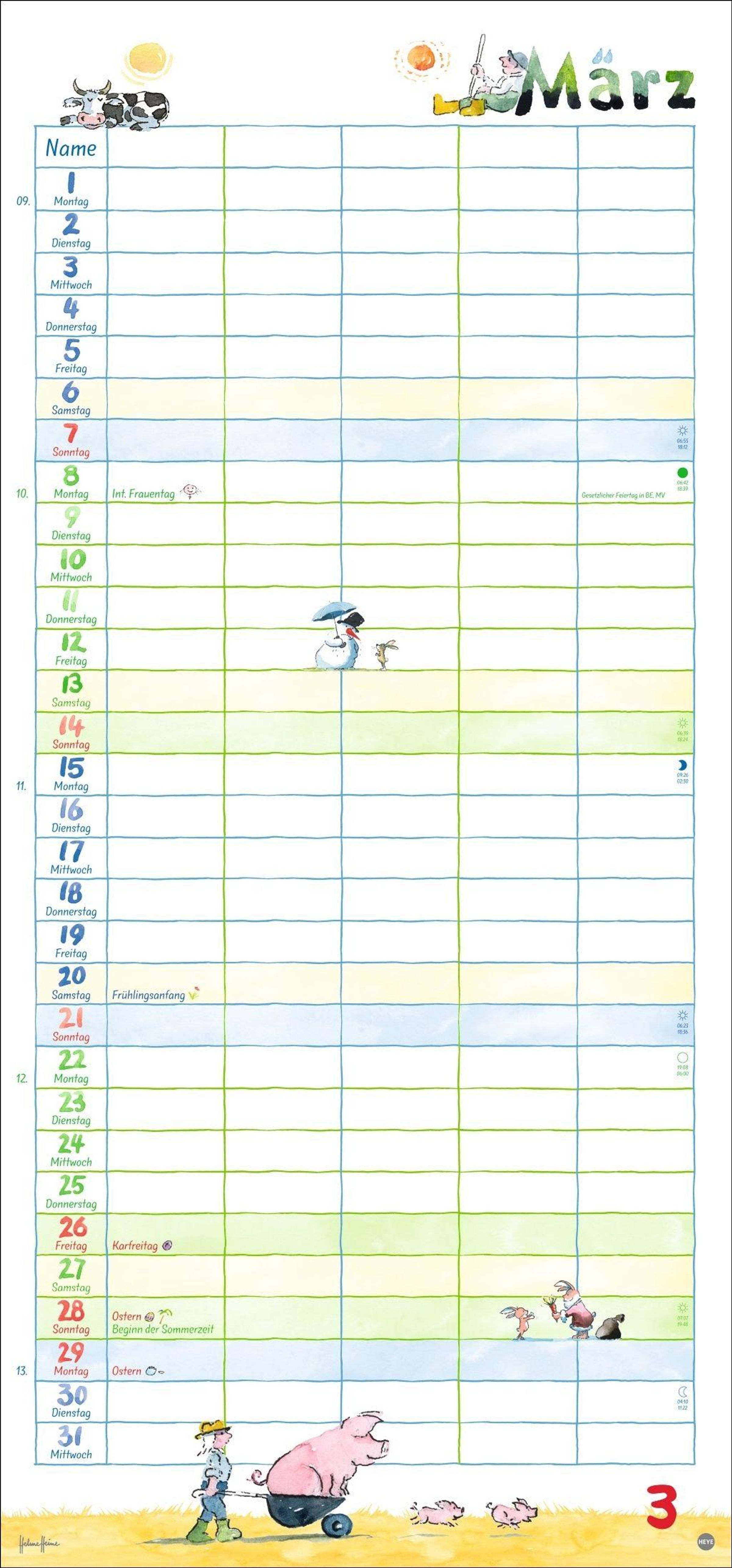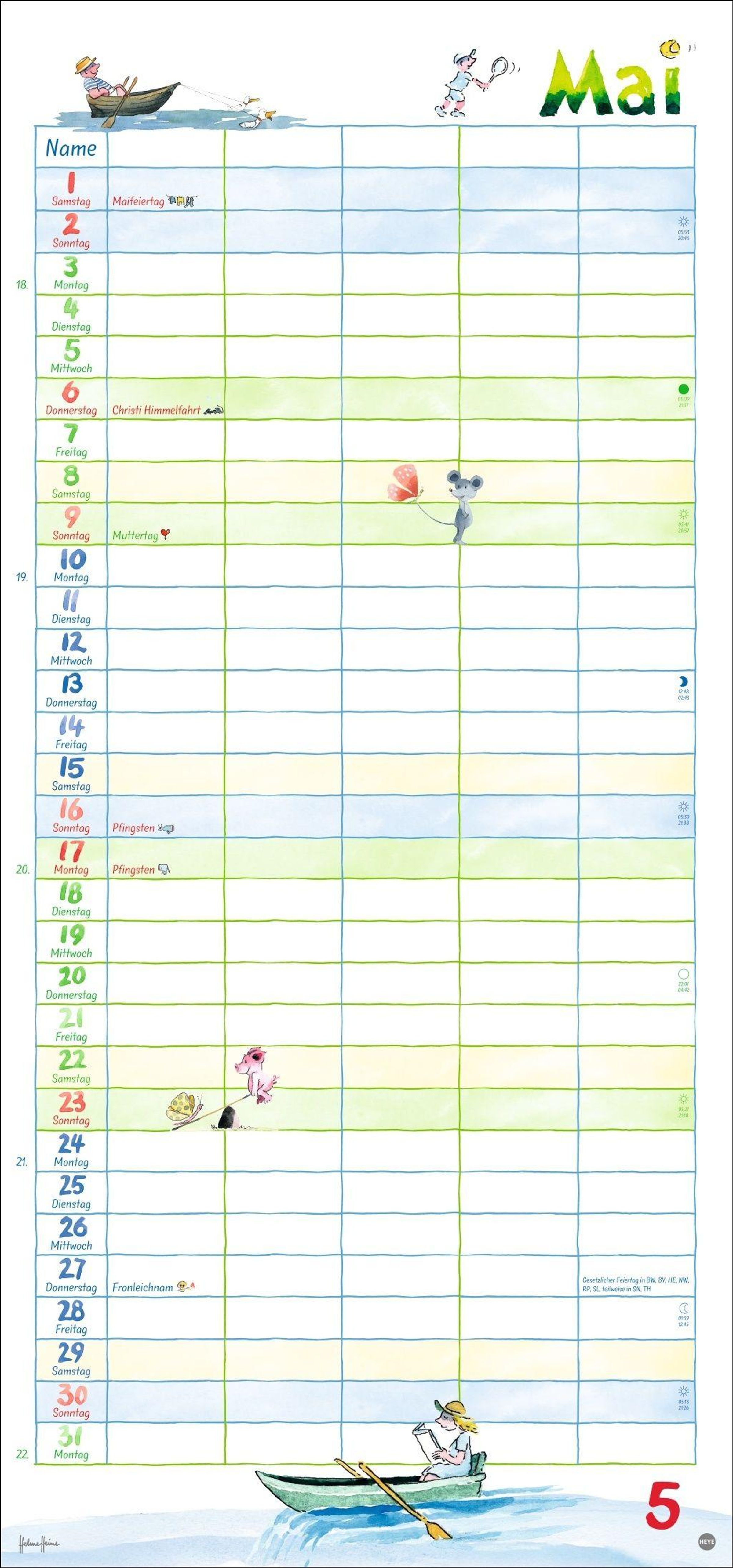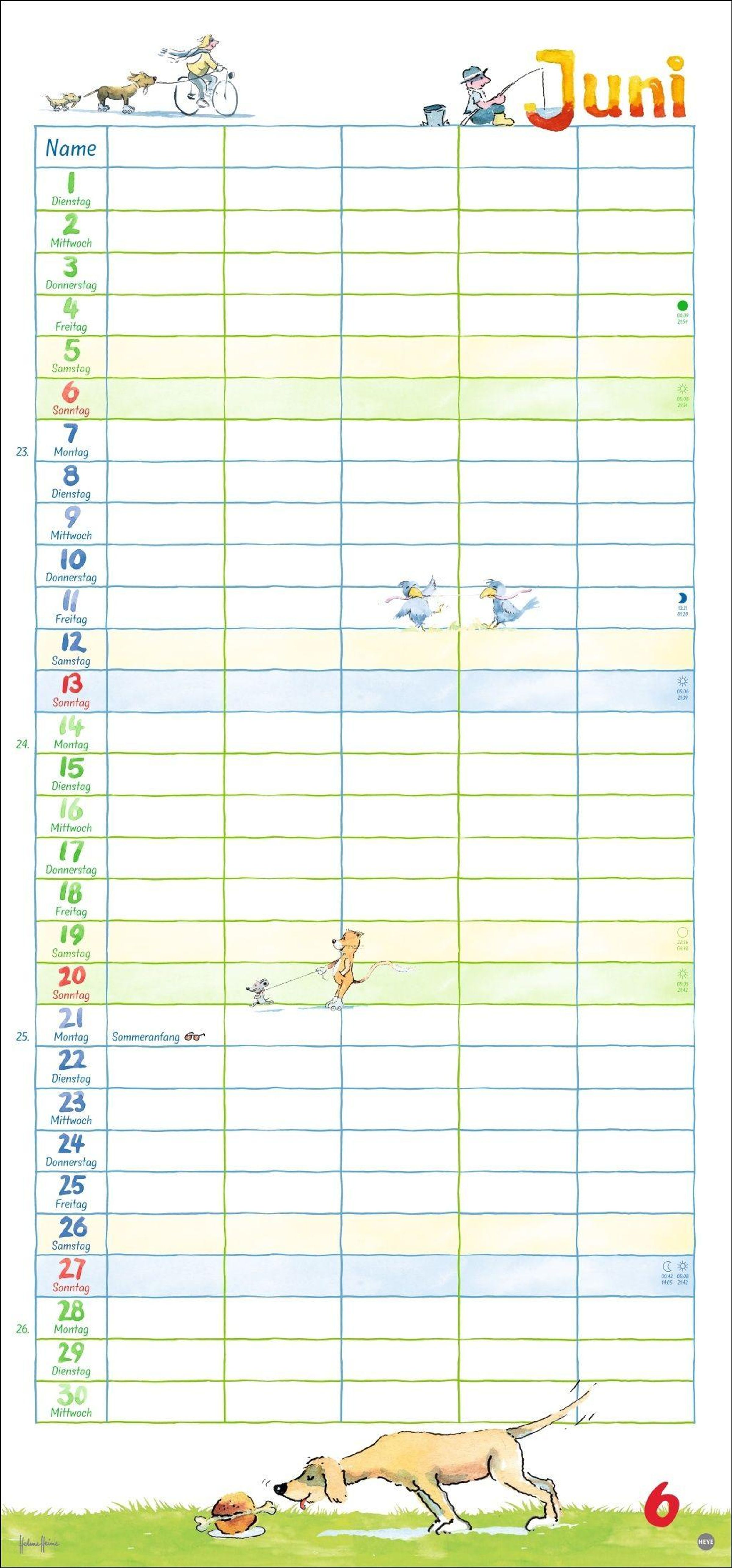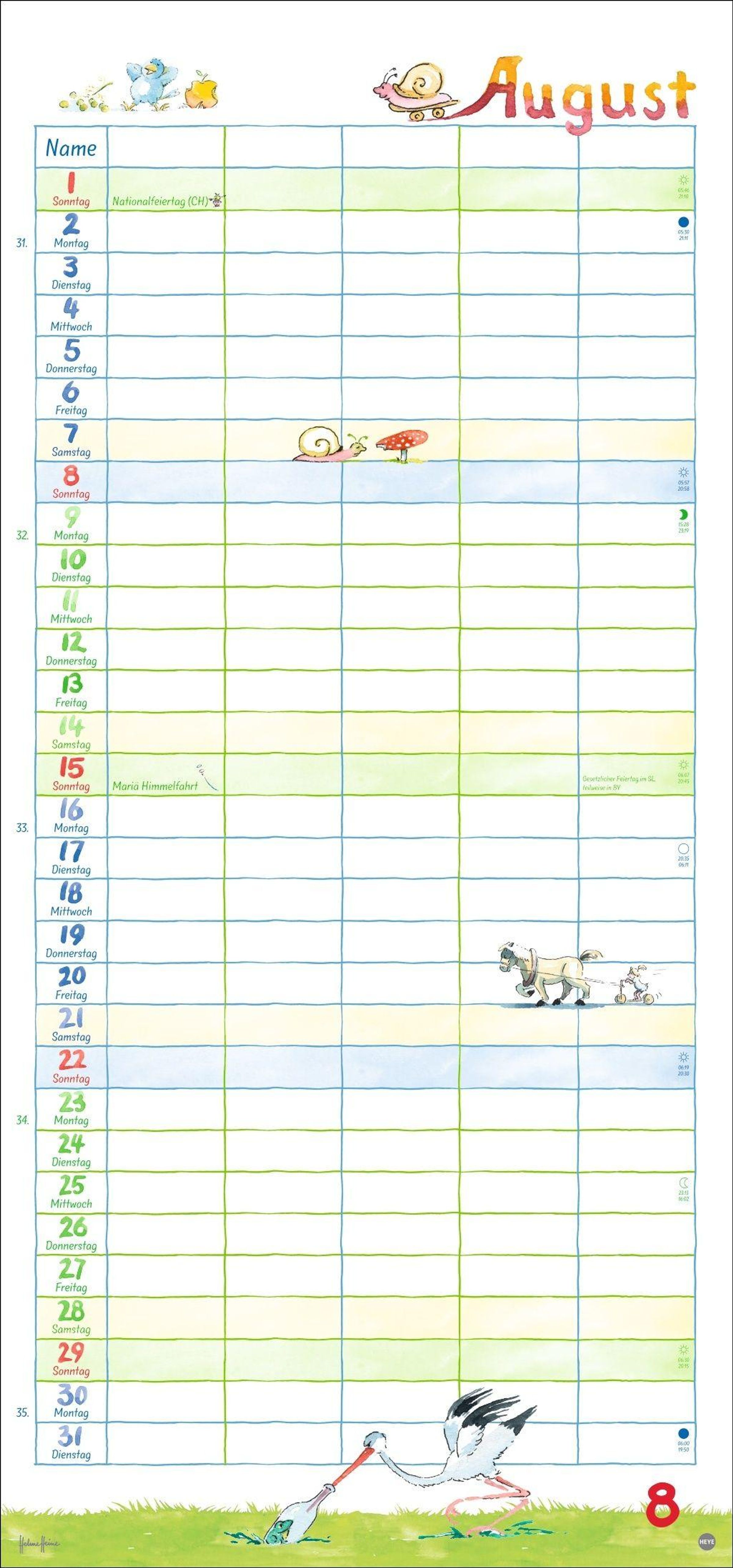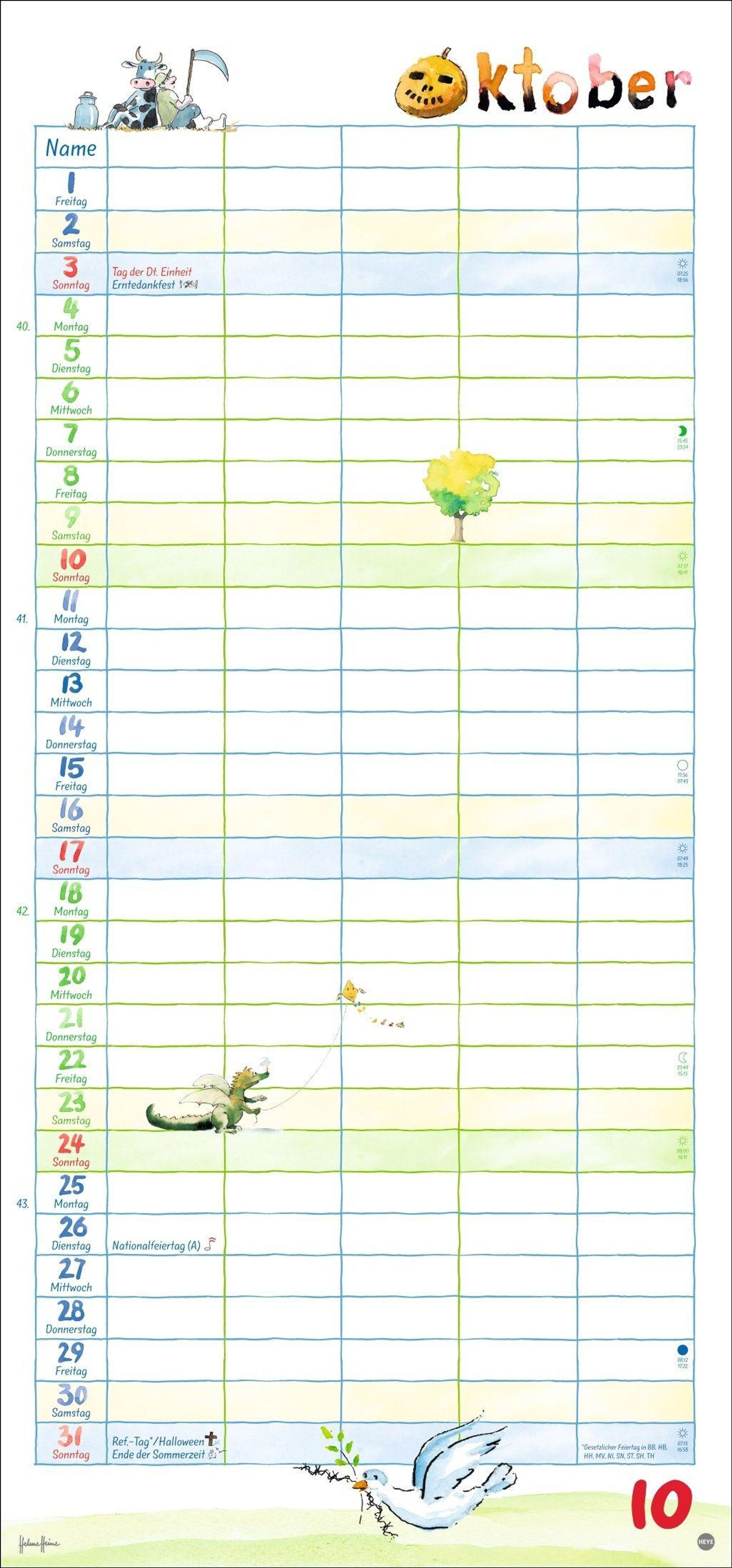 - Familienkalender mit 5 Spalten. Liebevoll illustrierter Familien-Wandkalender mit Schulferien und Stundenplänen.