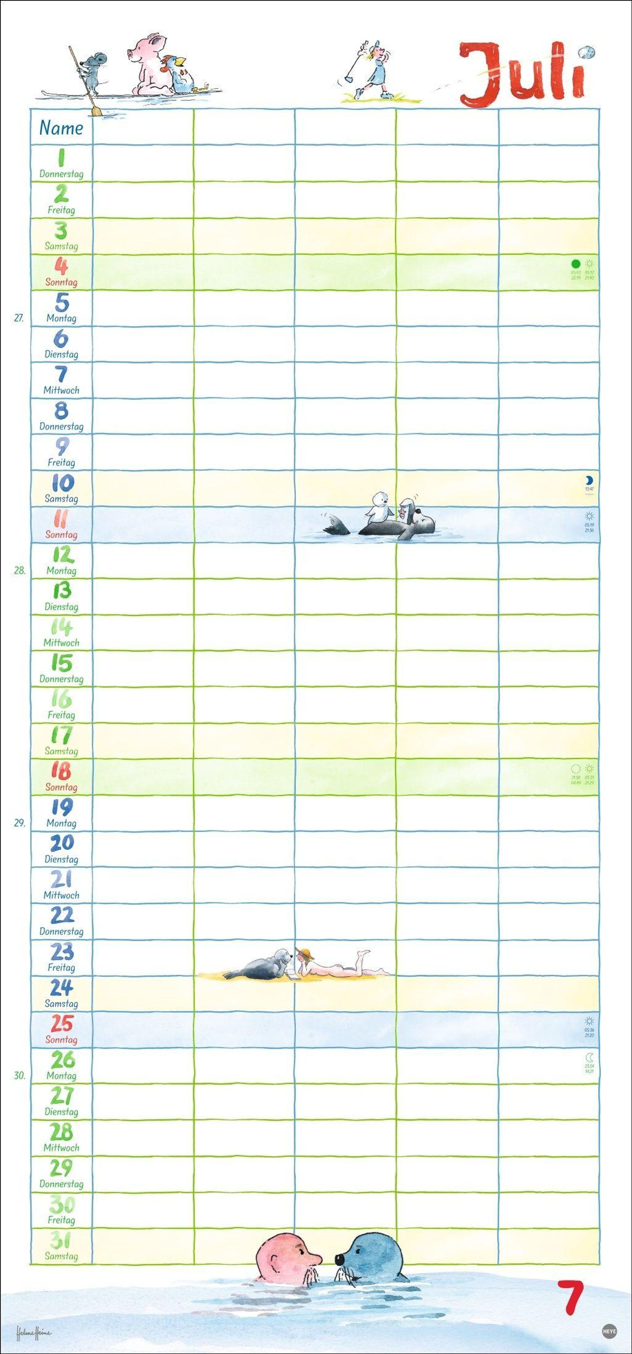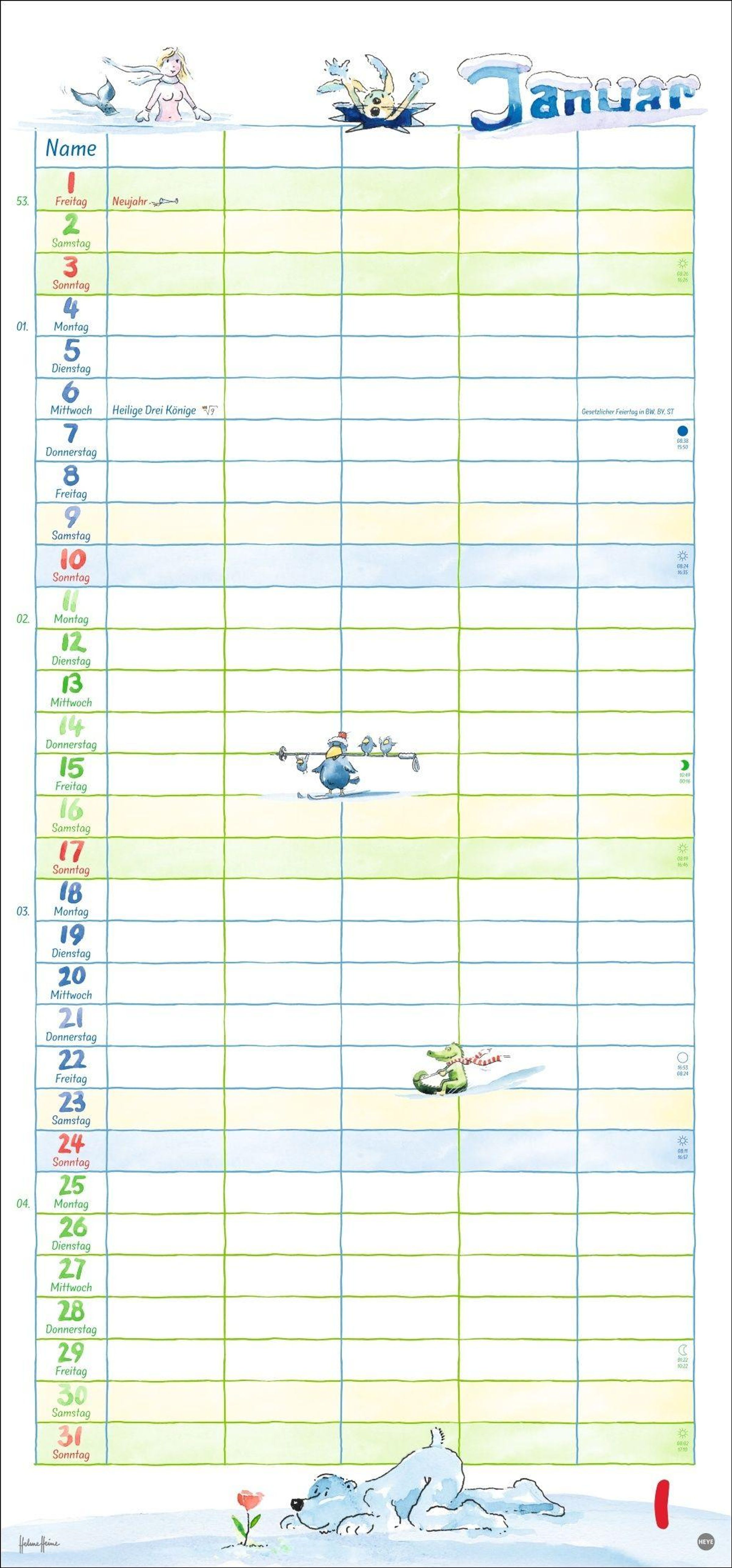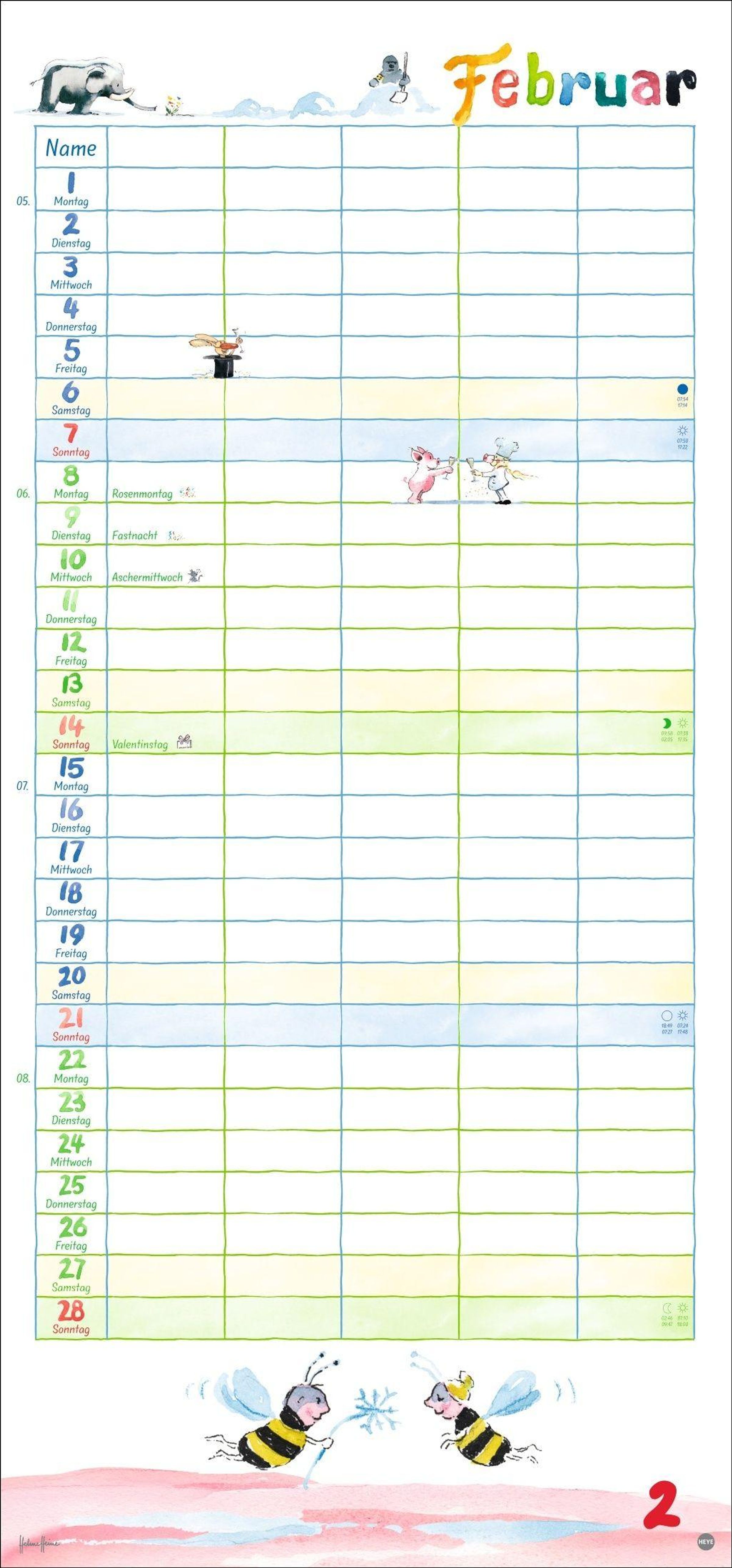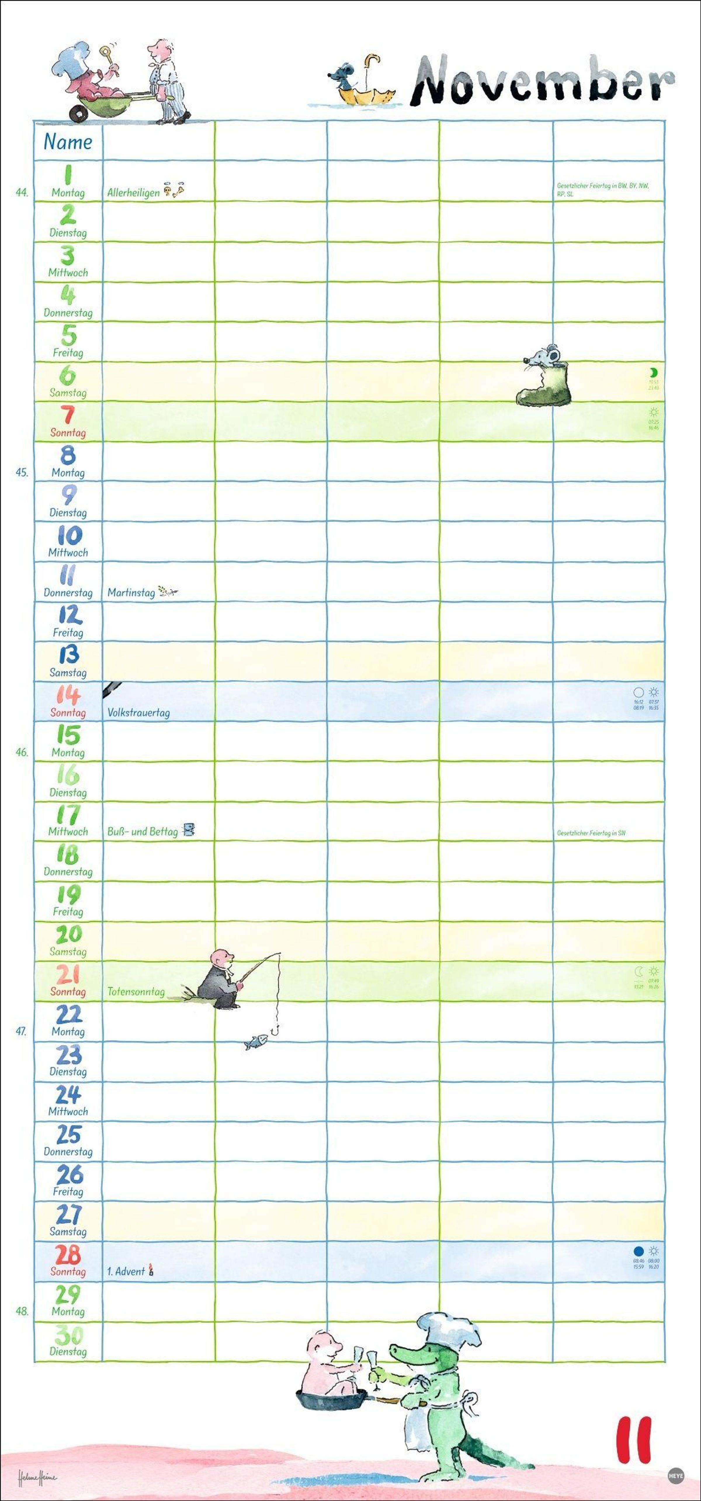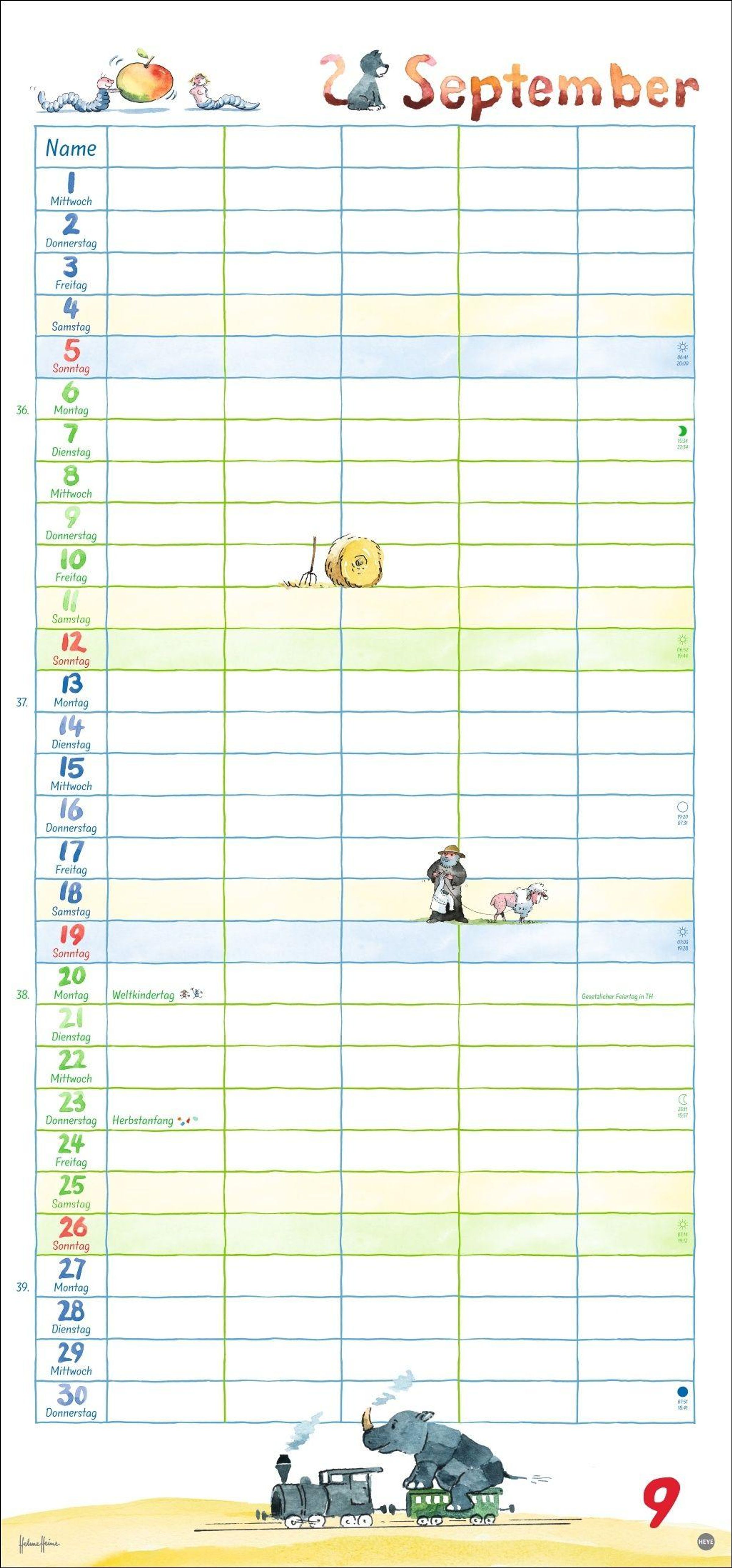 - Familienkalender mit 5 Spalten. Liebevoll illustrierter Familien-Wandkalender mit Schulferien und Stundenplänen.