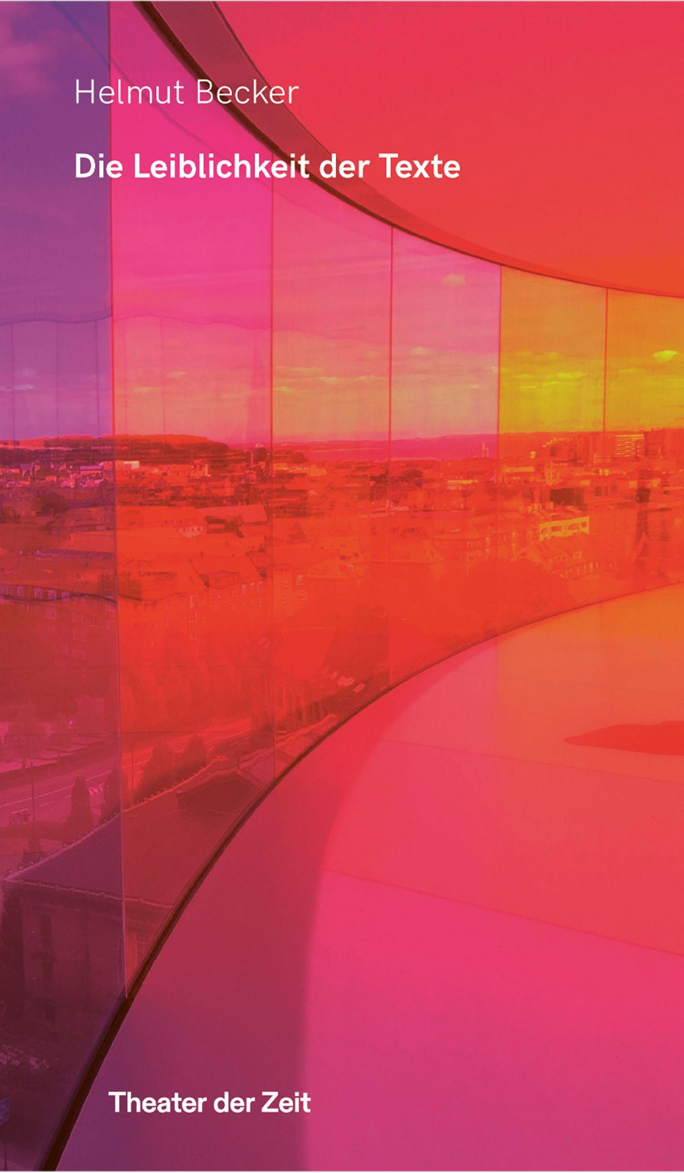 "Helmut Becker - Die Leiblichkeit der Texte - Theater der Zeit" über einer farbig getönten Glaswand mit Stadtansicht., Buch