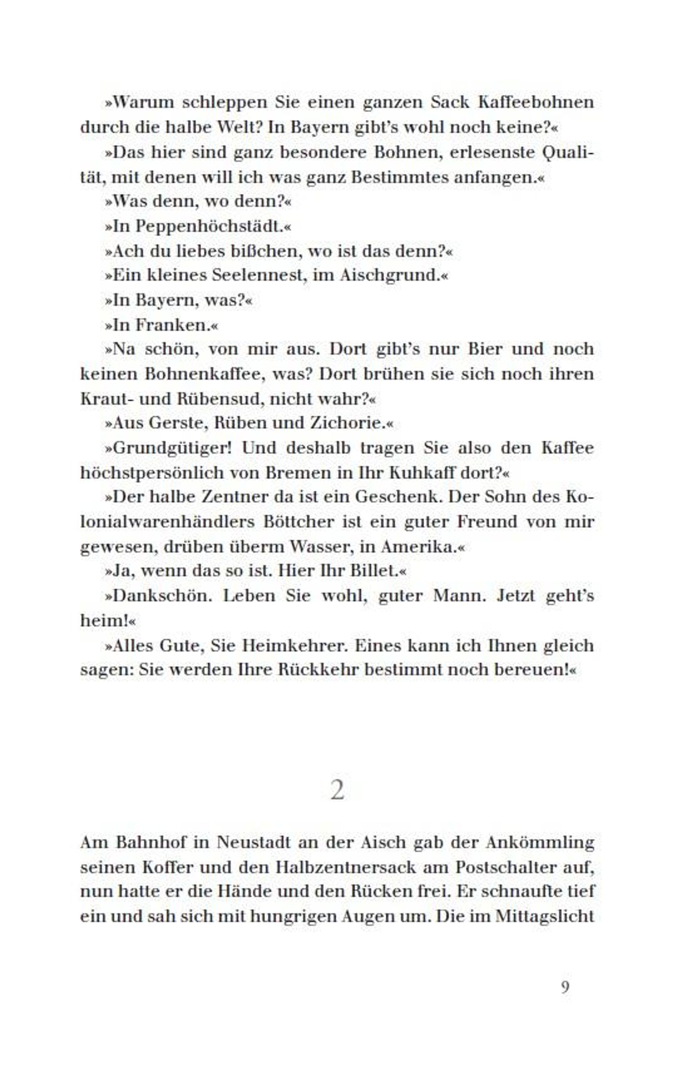 Auf der Suche nach einem besseren Leben wandert Bauernsohn Michael Wegmann nach Amerika aus. 1867 kehrt er als gereifter Mann in seinen fränkischen Geburtsort zurück. Mit im Gepäck: ein Sack Kaffeebohnen, ein Klumpen Gold - und der Traum, in der Provinz ein außergewöhnliches Kaffeehaus zu eröffnen. Von den Einheimischen zuerst teils beneidet, teils belächelt, entwickelt sich Wegmanns Lokal bald zu einem Anziehungspunkt. Die unterschiedlichsten Menschen können hier ihre Erfahrungen miteinander teilen und sich ihren kargen Alltag mit Köstlichkeiten versüßen. Gesellschaftliche Umbrüche wie persönliche Tragödien werfen jedoch immer wieder ihre Schatten auf den Ort, an dem Geschichte und Geschichten sich treffen. Kann das Kaffeehaus die Wirren der Zeit überstehen und Wegmann sich seinen Lebenstraum bewahren? Der historische Roman für Franken - opulent, poetisch, episodenreich und dramatisch.
