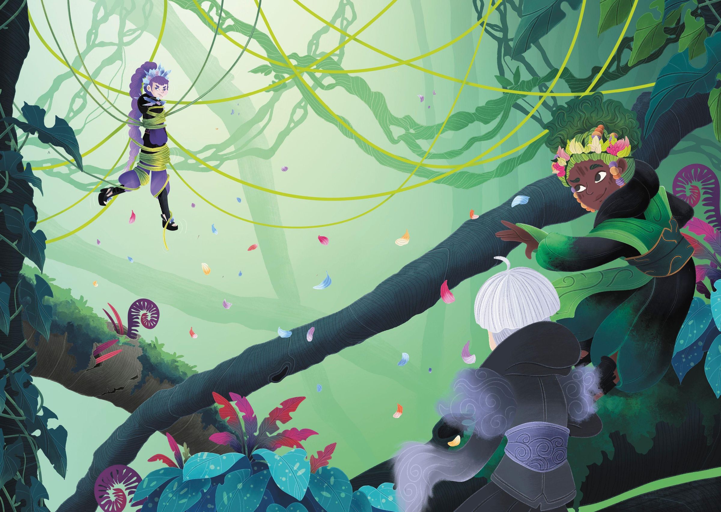 „Ninja School: Die erste Prüfung“. Bunte Illustration mit Ninjas in einer Waldkulisse. Verleger: Ueberreuter., Buch