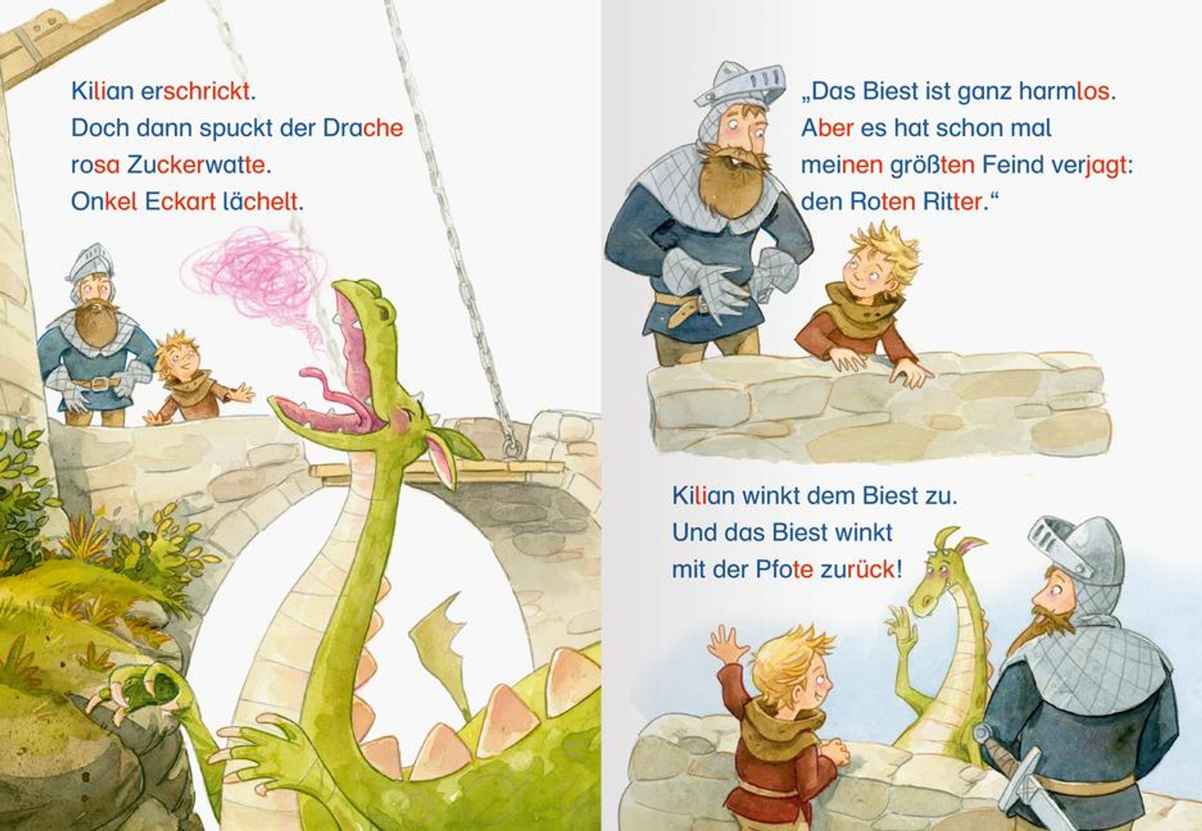 Kilian ist glücklich: Er darf bei seinem Onkel Eckart zur Ritterschule gehen. Bei seinen Streifzügen durch die Burg trifft er Johanna, die sich versteckt: Für Mädchen ist die Schule nämlich nicht erlaubt. Als eines Tages der Rote Ritter die Burg angreifen will, kann die tapfere Johanna beweisen, was in ihr steckt: Gemeinsam mit Kilian und dem Zuckerwatte speienden Drachen verteidigt sie die Ritterburg!