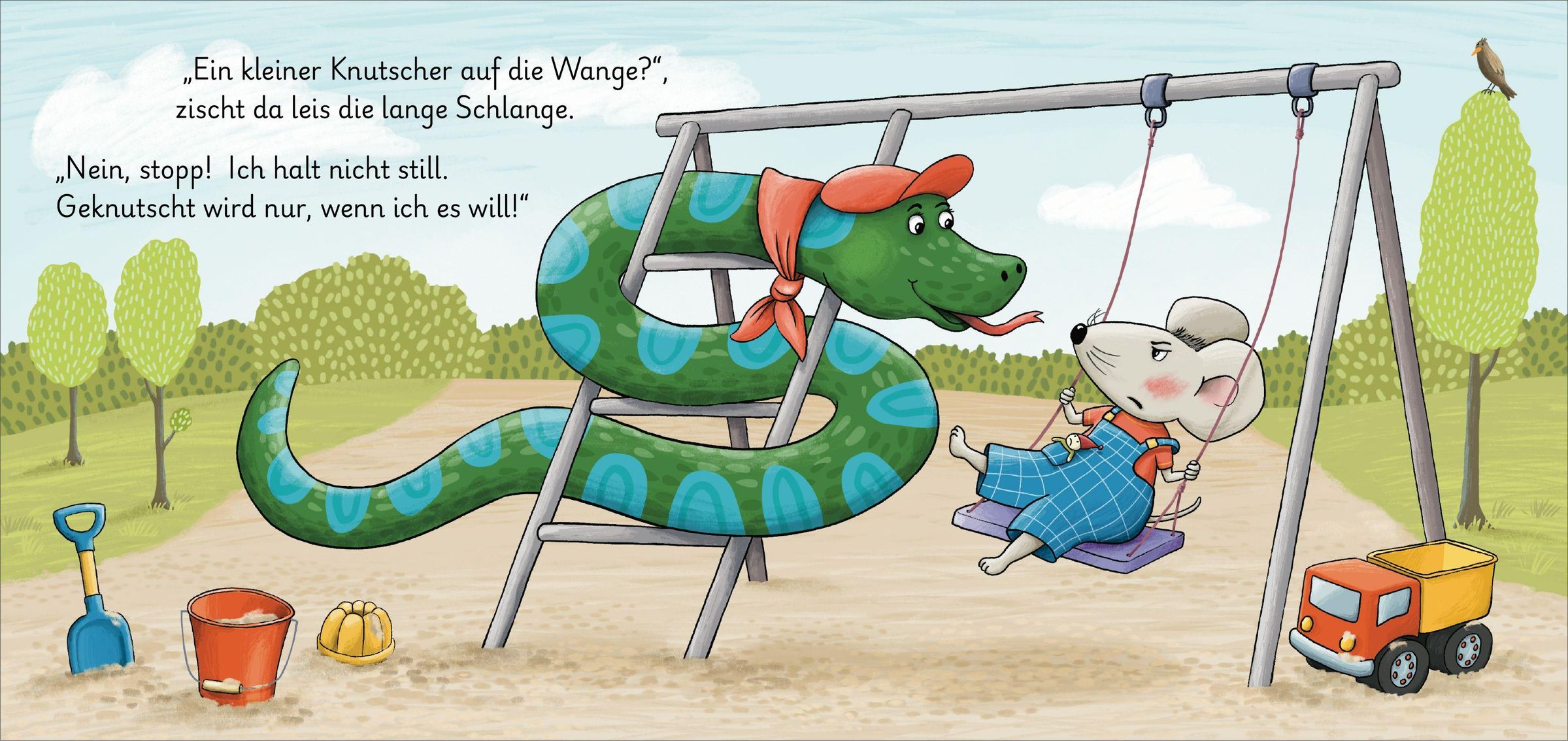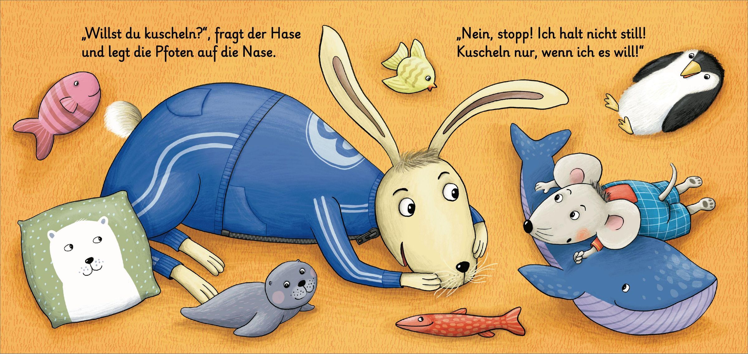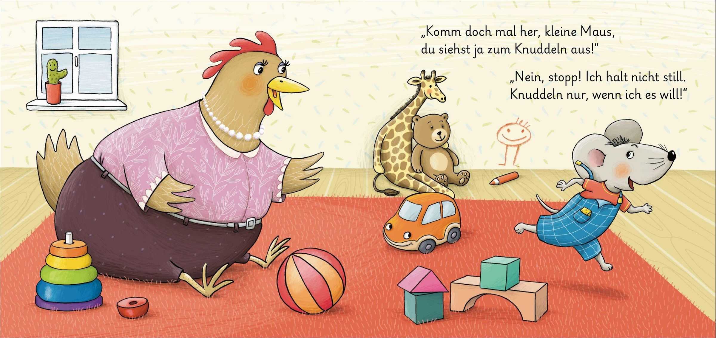 Ständig wird die kleine Maus geknuddelt, geschmust und geküsst. Doch die kleine Maus möchte das überhaupt nicht, denn sie hält nur still, wenn sie entscheidet: "Ja, ich will!" Ab 18 Monaten.