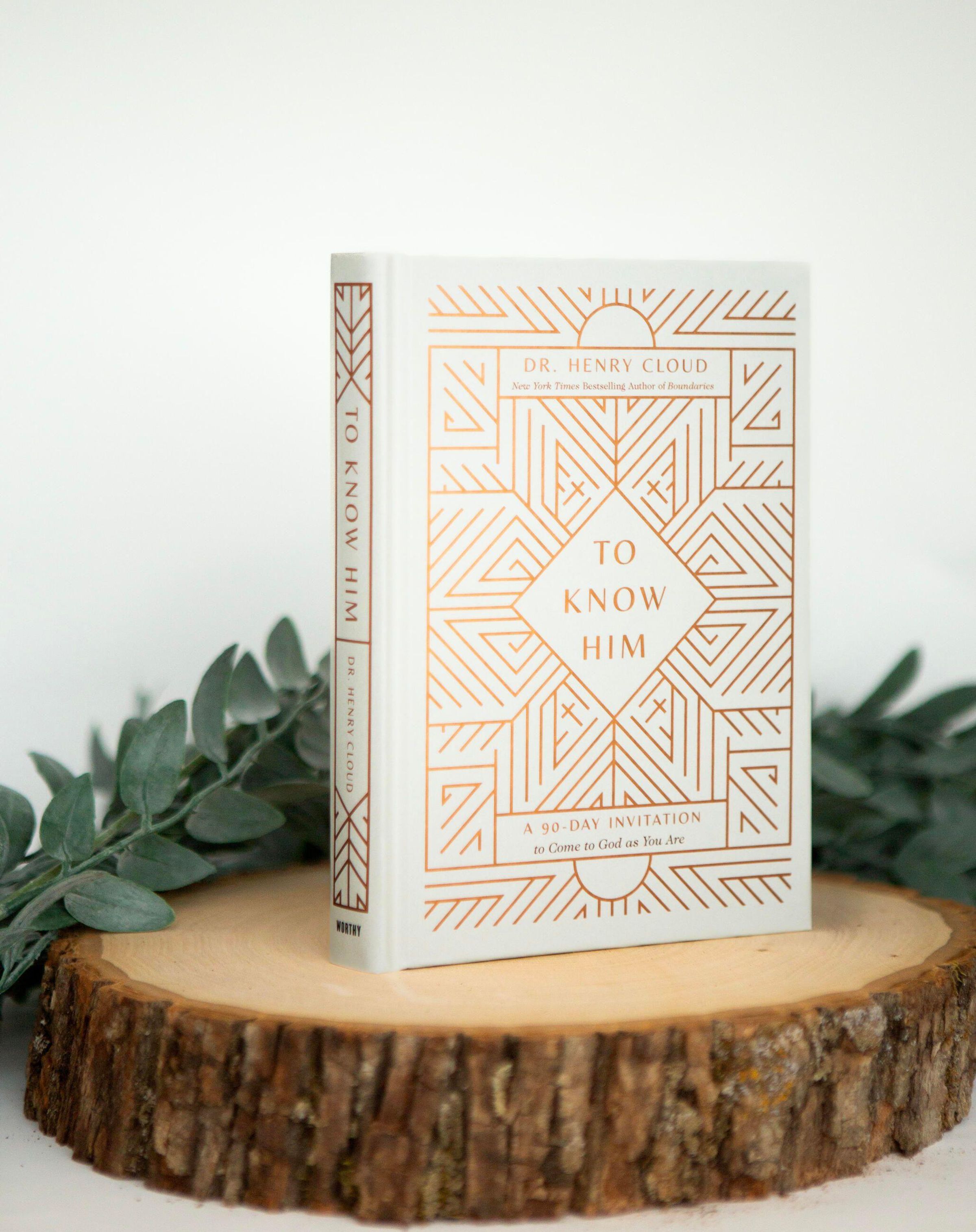 „TO KNOW HIM. A 90-Day Invitation to Come to God As You Are.“ Geometrisches Muster mit braunem Text auf hellem Hintergrund., Buch