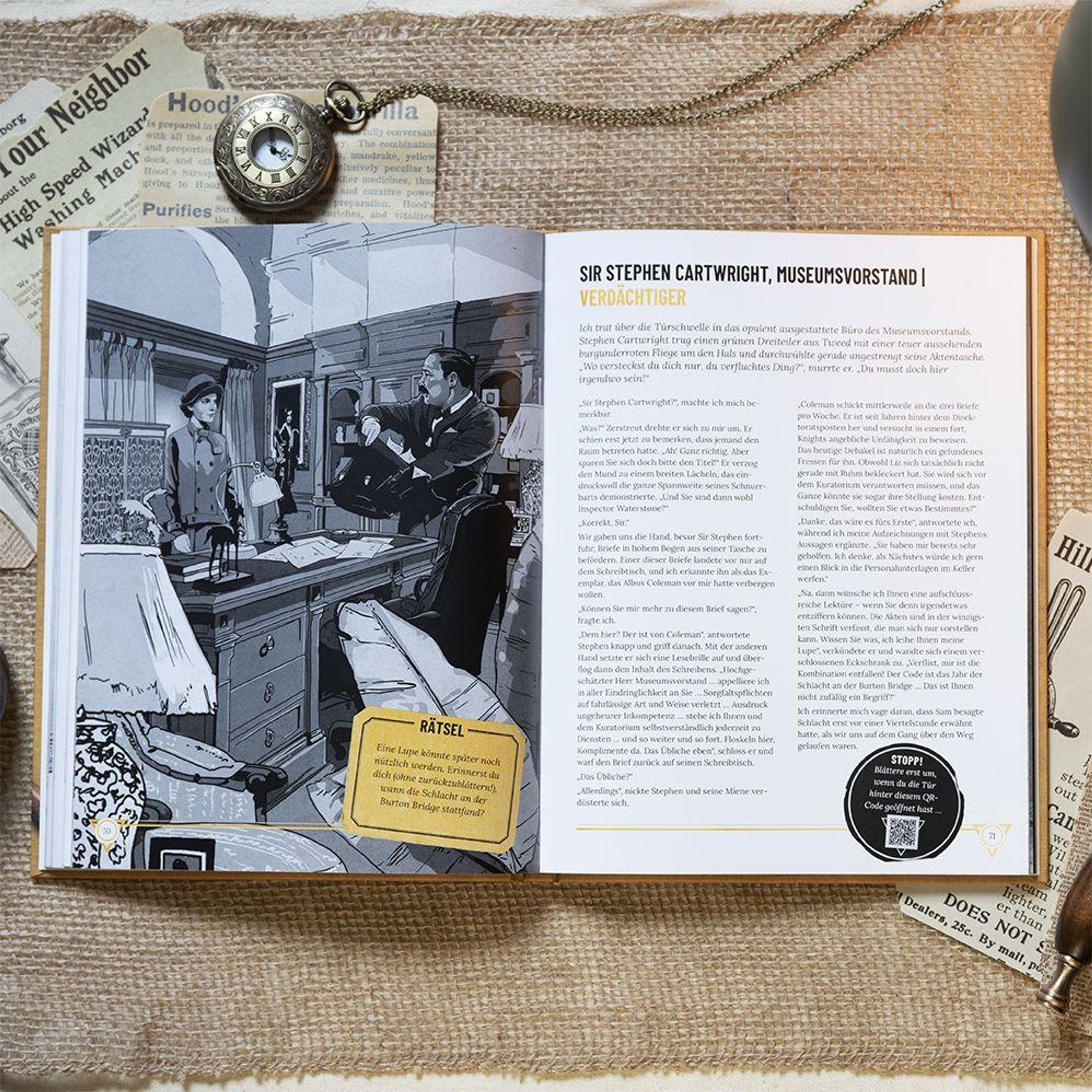 - Extra Spannung mit Smartphone: Öffne Türen, indem du Zahlenkombinationen im Buch ermittelst und über QR-Codes eingibst