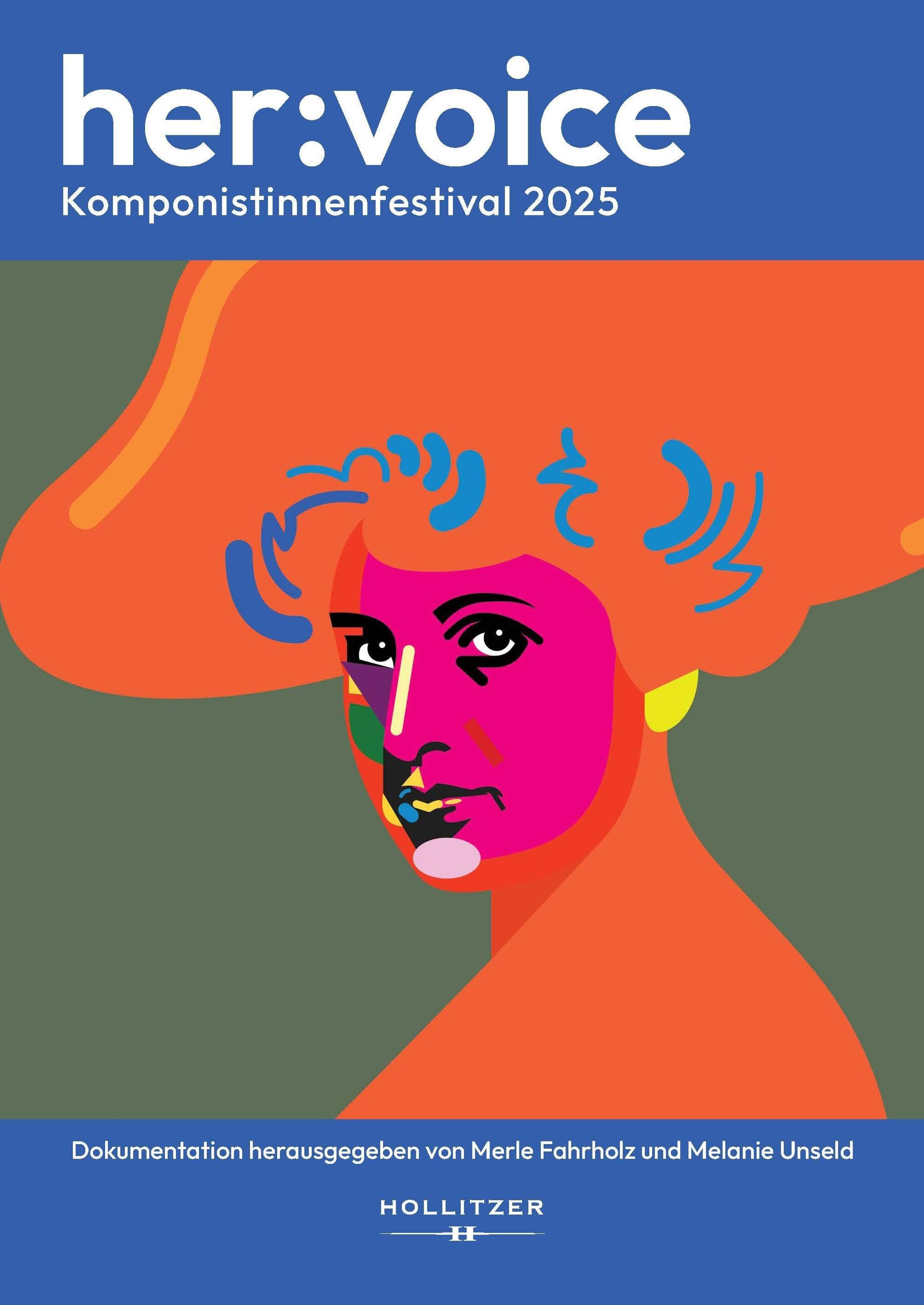 her:voice Komponistinnenfestival 2025. Buntes Porträt in kräftigen Farben mit markanten Linien., Buch