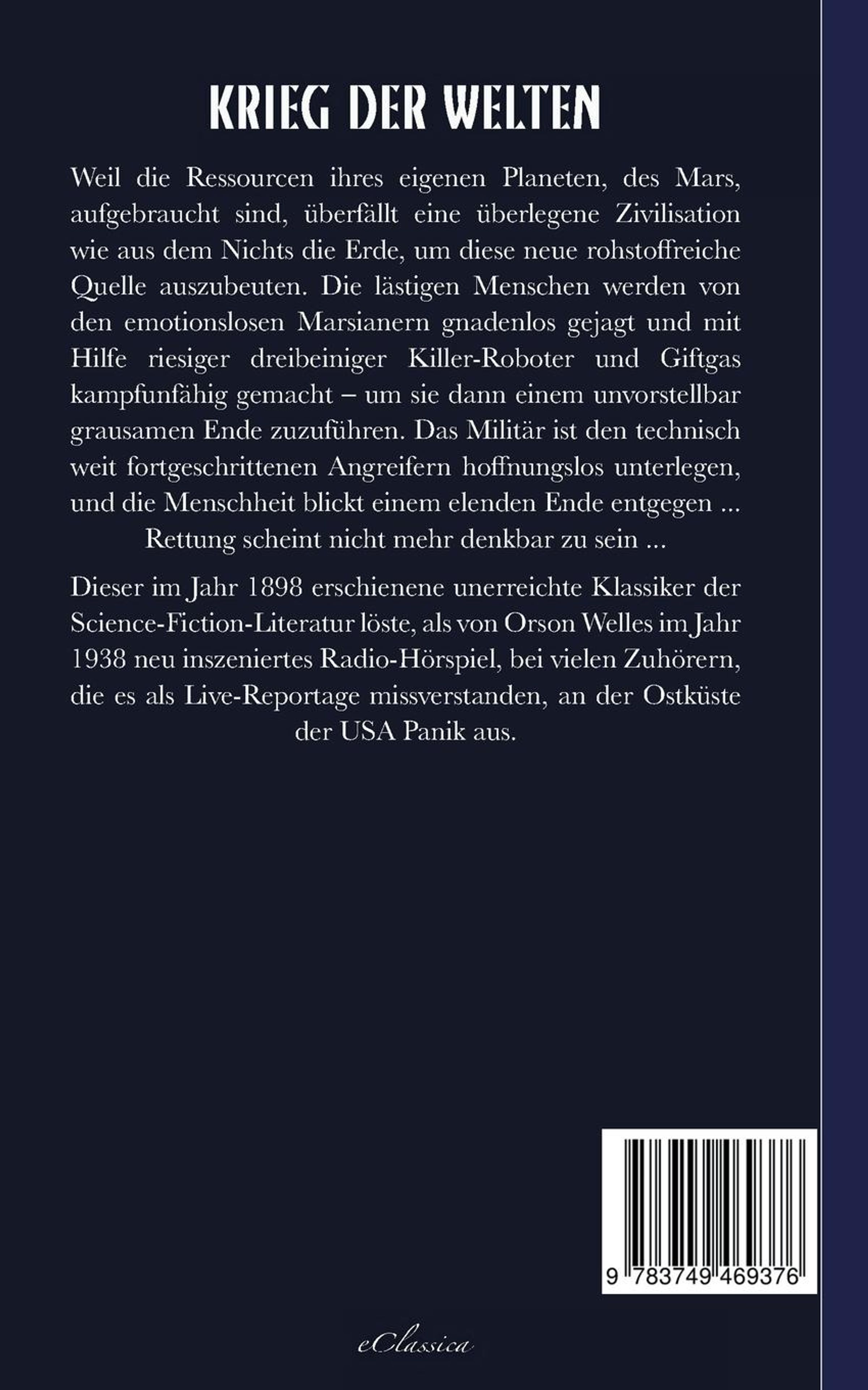 H. G. Wells: Der Krieg der Welten | Neuerscheinung 2019, neu editiert, in aktualisierter Rechtschreibung | Weil die Ressourcen ihres eigenen Planeten, des Mars, aufgebraucht sind, überfällt eine überlegene Zivilisation wie aus dem Nichts die Erde, um diese neue rohstoffreiche Quelle auszubeuten. Die lästigen Menschen werden von den emotionslosen Marsianern gnadenlos gejagt und mit Hilfe riesiger dreibeiniger Killer-Roboter und Giftgas kampfunfähig gemacht - um sie dann einem unvorstellbar grausamen Ende zuzuführen. Das Militär ist den technisch weit fortgeschrittenen Angreifern hoffnungslos unterlegen, und die Menschheit blickt einem elenden Ende entgegen ... Rettung scheint nicht denkbar zu sein ... | Dieser im Jahr 1898 erschienene unerreichte Klassiker der Science-Fiction-Literatur löste, als von Orson Welles im Jahr 1938 inszeniertes Radio-Hörspiel, bei vielen Zuhörern, die es als Live-Reportage missverstanden, an der Ostküste der USA Panik aus.