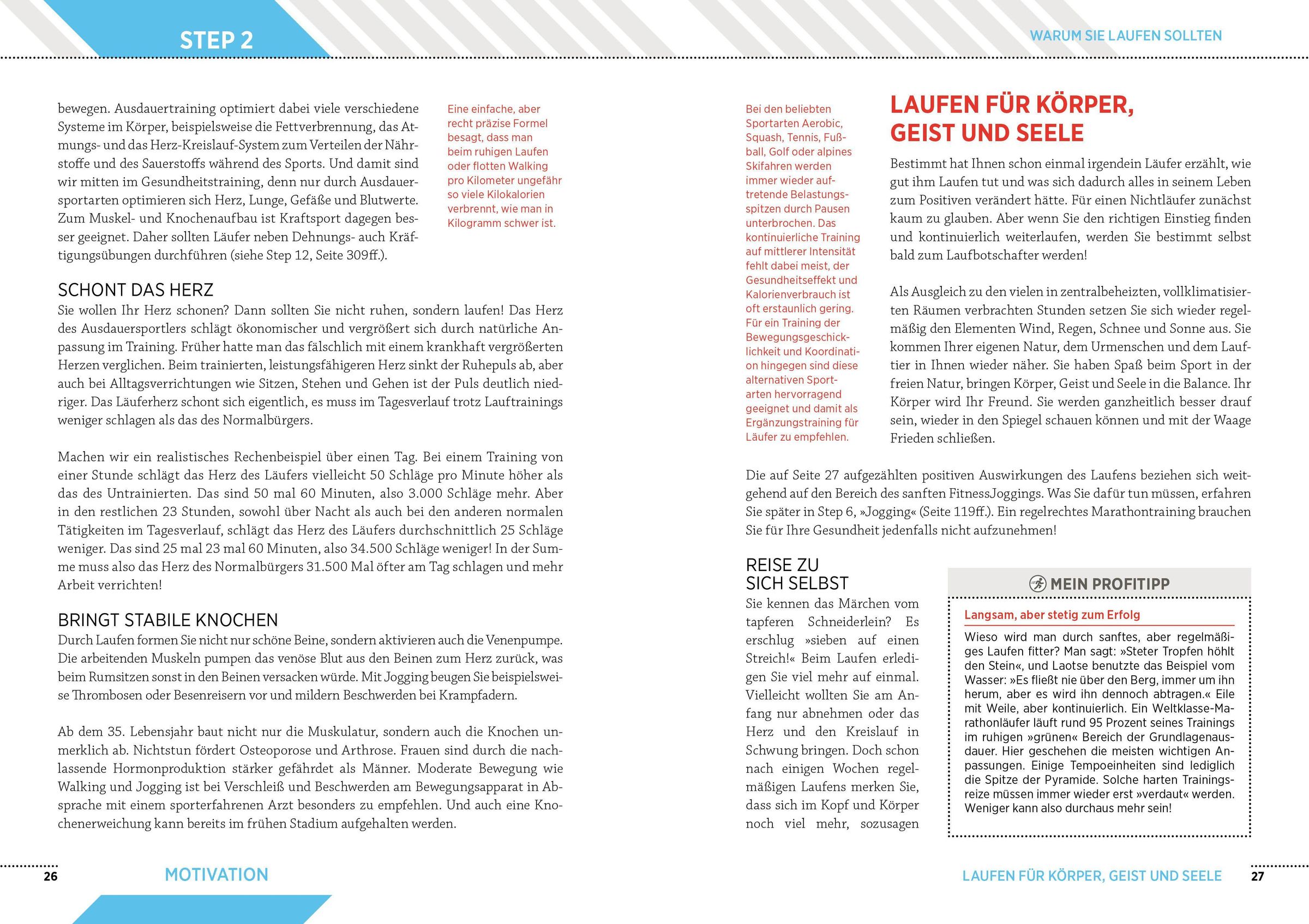 >Ergänzt wird das Buch durch Motivationstipps , Ratschläge wie man typische Läuferverletzungen vermeiden und behandeln kann, Hinweise zur richtigen Wettkämpfer-Ernährung und Tipps zum Abnehmendurch Laufen.