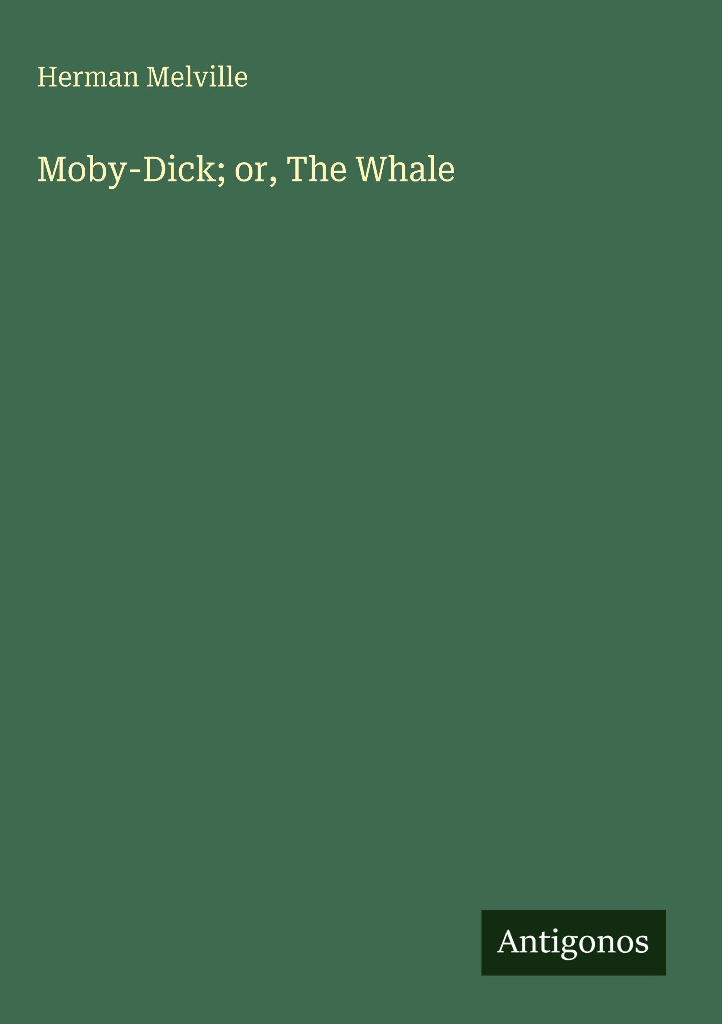 Grüner Hintergrund, gelber Text: „Herman Melville, Moby-Dick; or, The Whale“. Unten Rechts: Logo „Antigonos“., Buch
