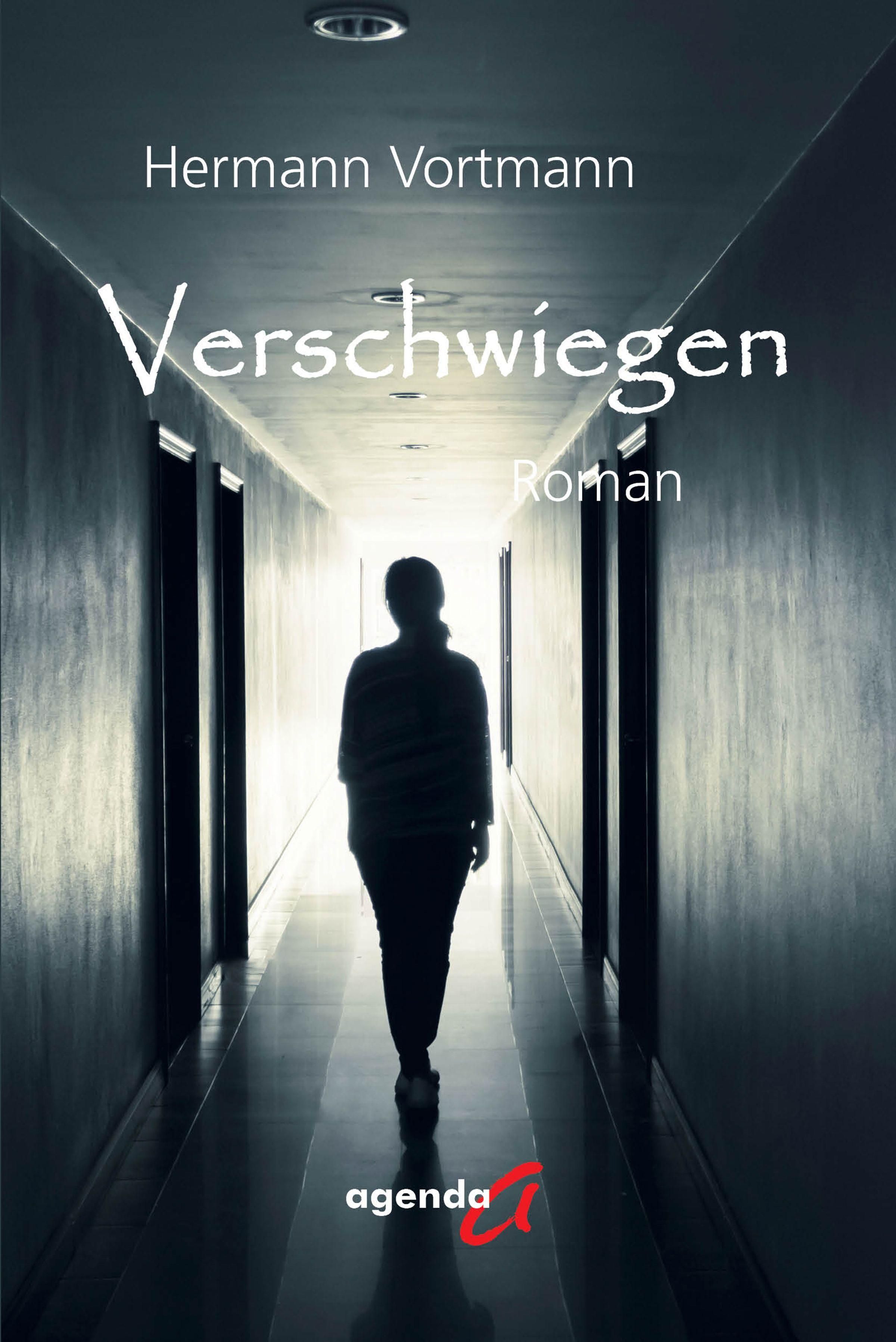 Verschwiegene. Silhouette einer Person in einem dunklen Flur. Text: Hermann Vortmann, Roman, Logo agenda., Buch