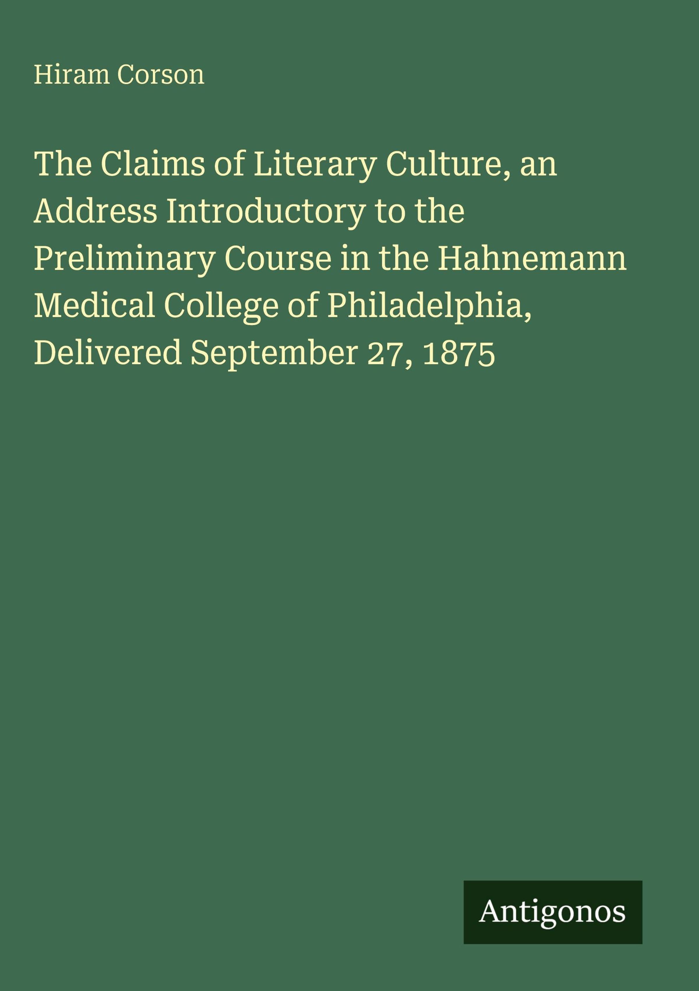The Claims of Literary Culture, an Address Introductory to the Preliminary Course in the Hahnemann Medical College of Philadelphia, Delivered September 27, 1875