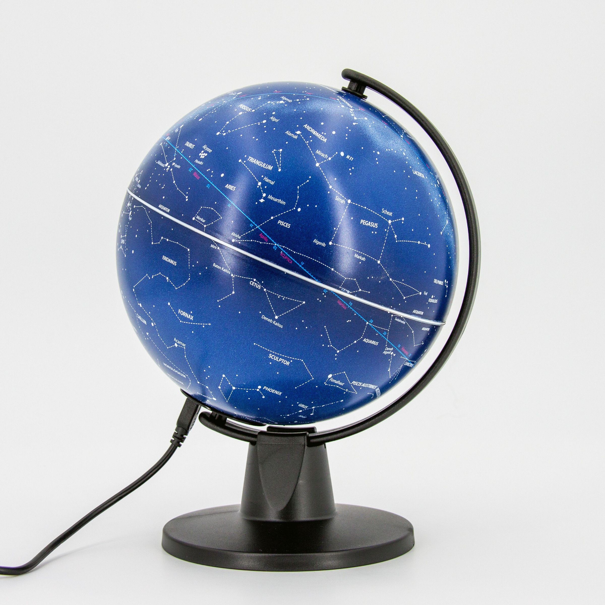 Weiße Texte auf blauem Untergrund: Sternbilder wie Pegasus, Pisces. Schwarzer Globusständer mit Kabel., Diverse