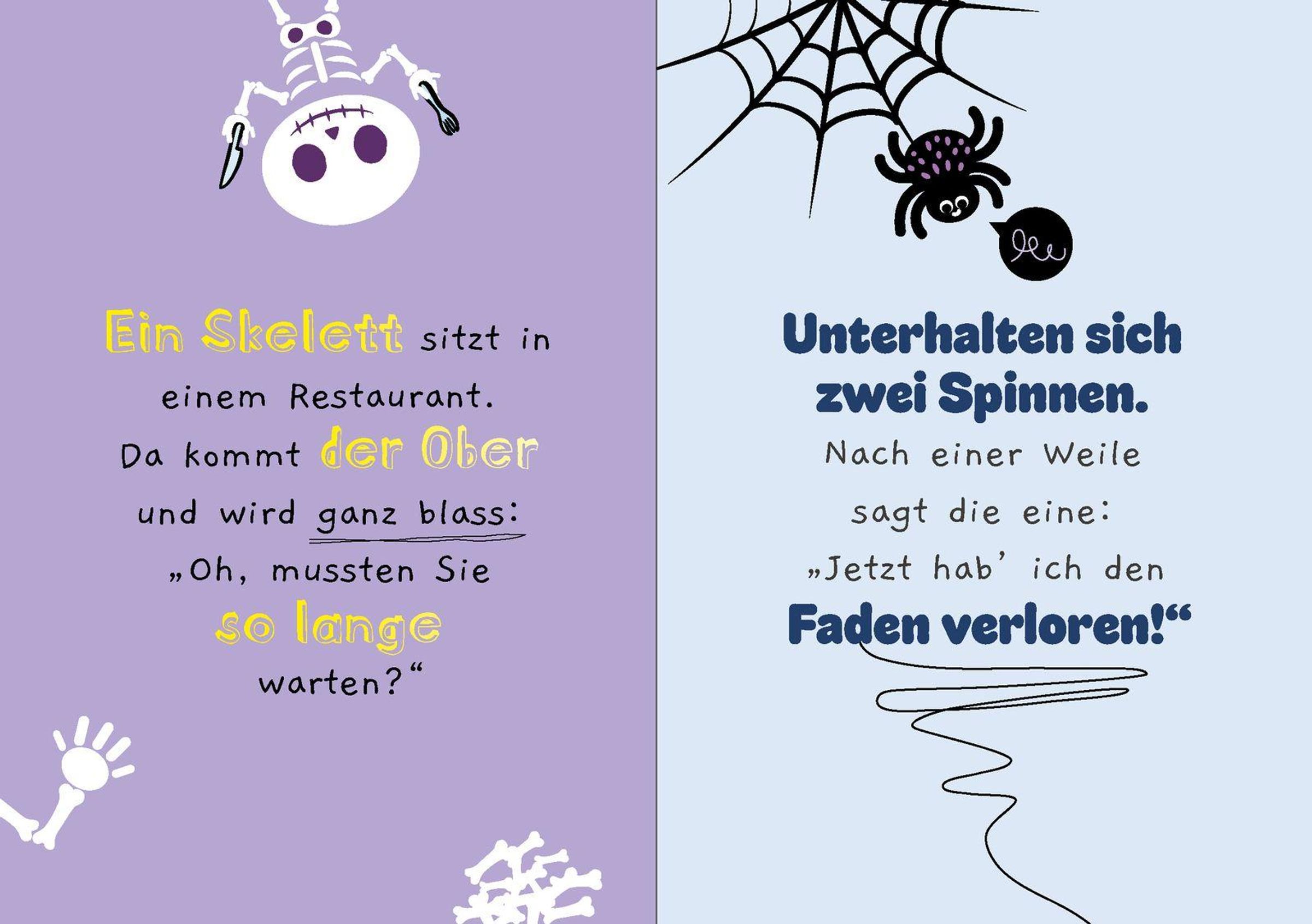 Wer sagt denn, dass Gruseln nicht auch wahnsinnig lustig sein kann? Mit diesem Büchlein entdecken Kinder den Spaß am Lesen mit den besten Halloween-Witzen zum Gruseln. Gerade für Leseanfänger*innen ist es ein riesiges Erfolgserlebnis, wenn sie die Witze und Scherzfragen selbst lesen, verstehen und weitererzählen können. Die übersichtliche Gestaltung mit nur einem Witz pro Seite überfordert nicht, sondern sorgt für schnelle Lacher und motiviert sofort zum Weiterblättern. Ob Skelette, Spinnen, Vampire oder Hexen - hier wird der Schrecken einfach weggekichert.