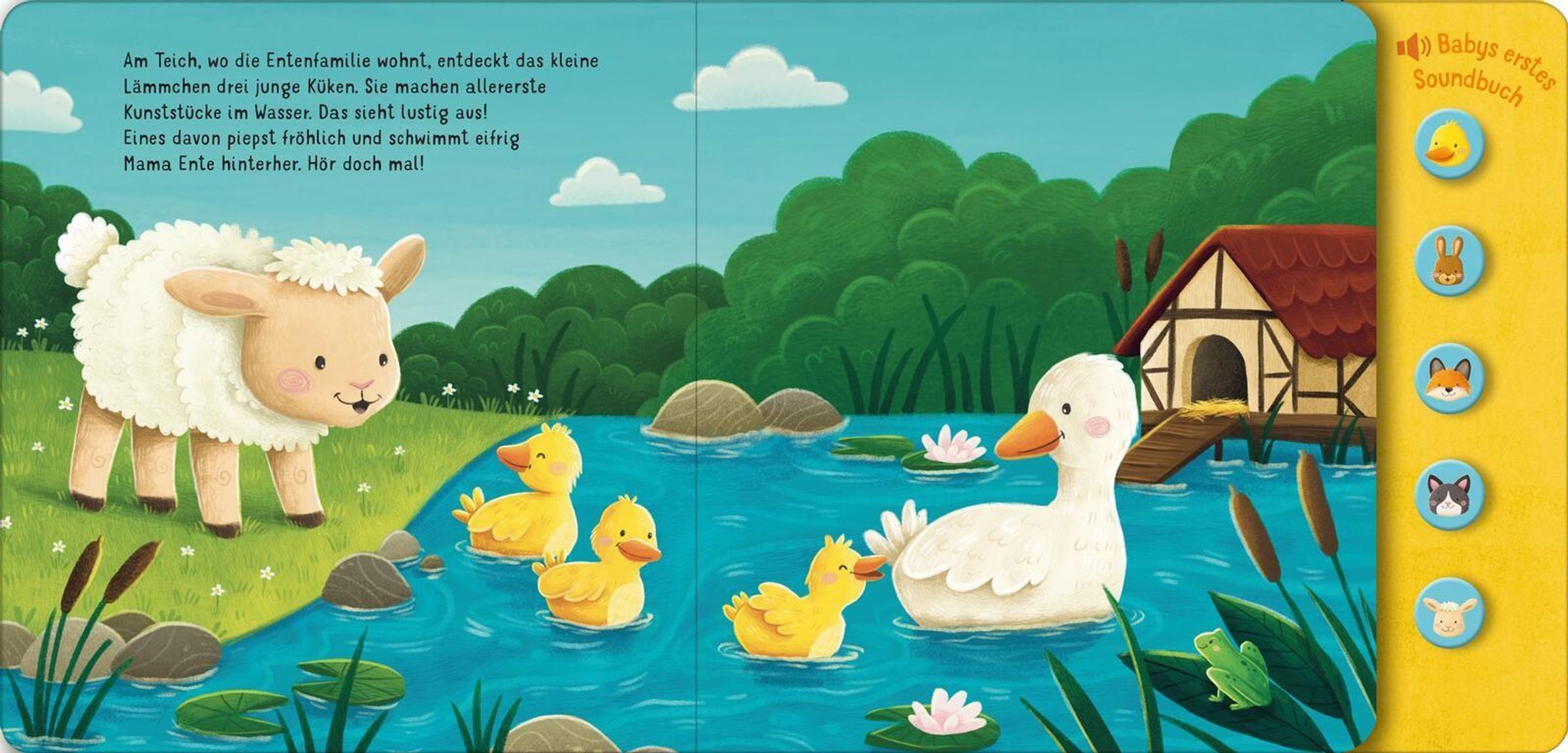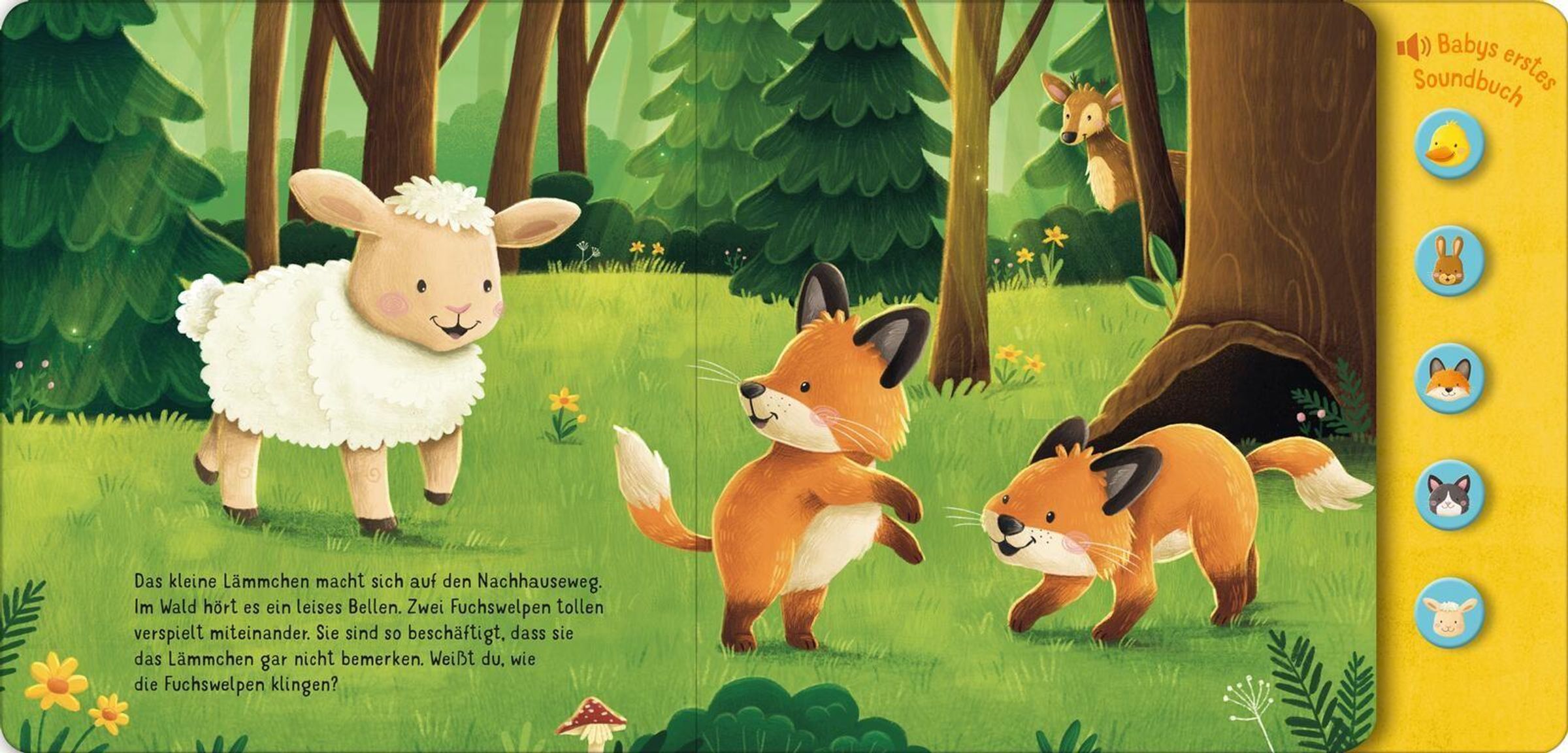 In diesem Soundbuch macht sich das kleine Lämmchen auf einen ersten Frühlingsspaziergang und begegnet dabei den unterschiedlichen Tierkindern. Das Entenküken piepst vergnügt im Teich, die Fuchswelpen tollen verspielt miteinander - und das Kätzchen? Das begleitet das kleine Lamm zu seiner Mama zurück in den Stall. Begleite das Lämmchen und lausche den Stimmern der Tierkinder.