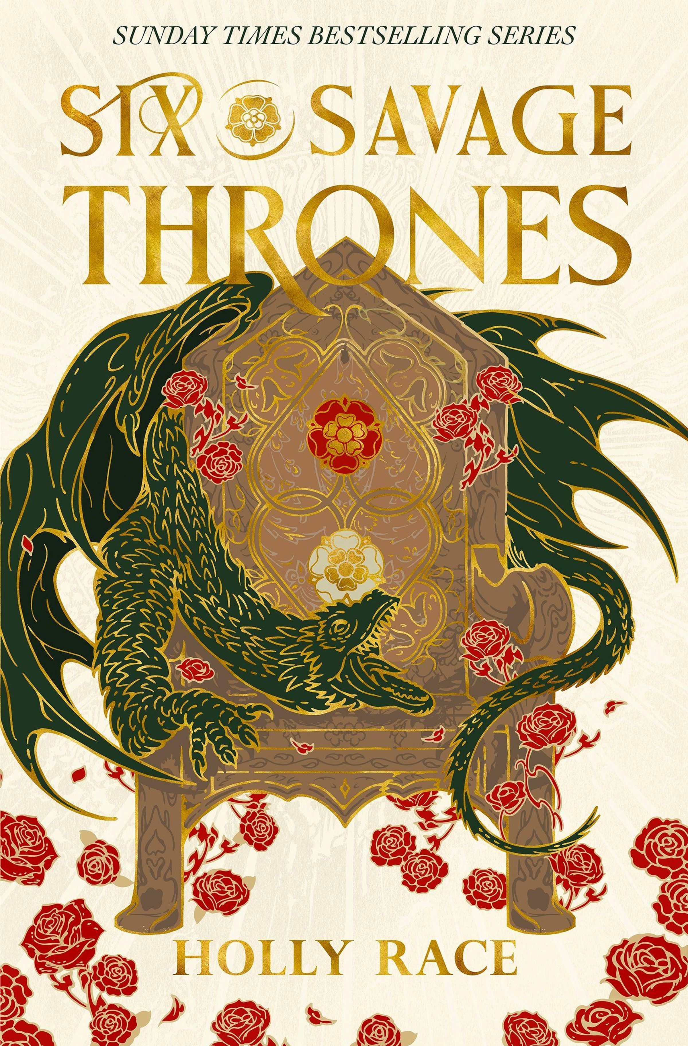 "SIX SAVAGE THRONES" und "HOLLY RACE" in Gold auf einem Thron mit grünem Drachen und roten Rosen., Buch