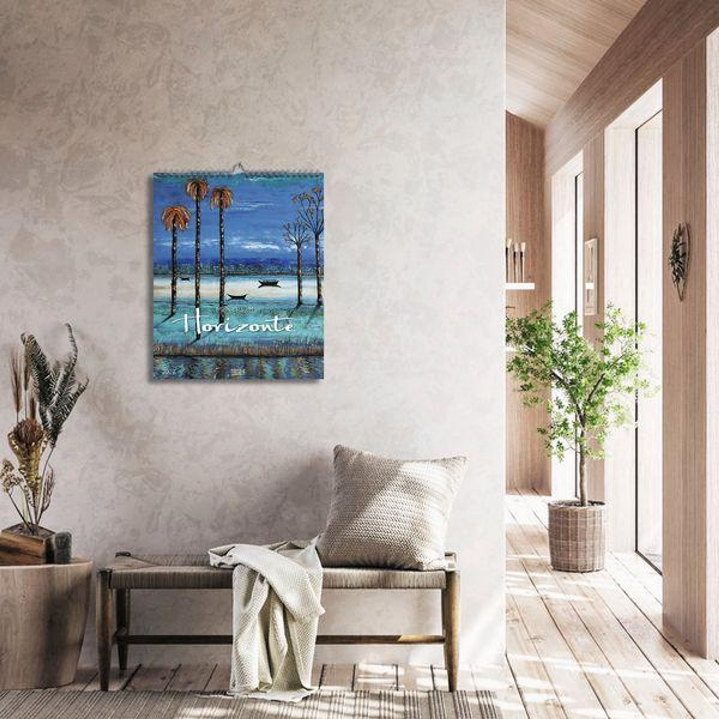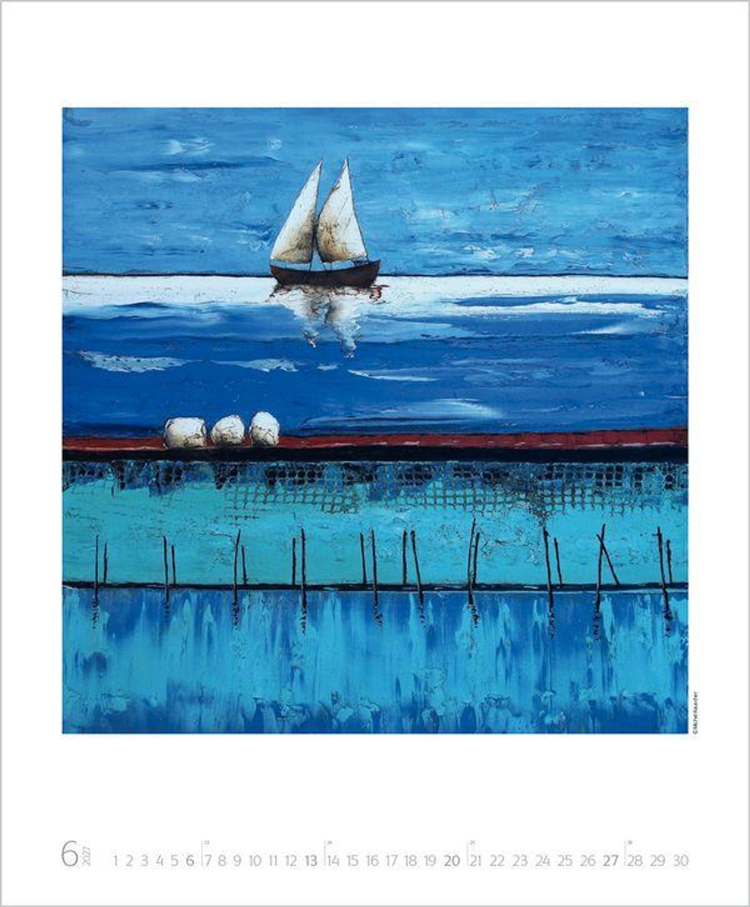 „Michel Rauscher Horizonte 2027“ zeigt Palmen und Boote vor einer blauen, malerischen Landschaft., Kalender