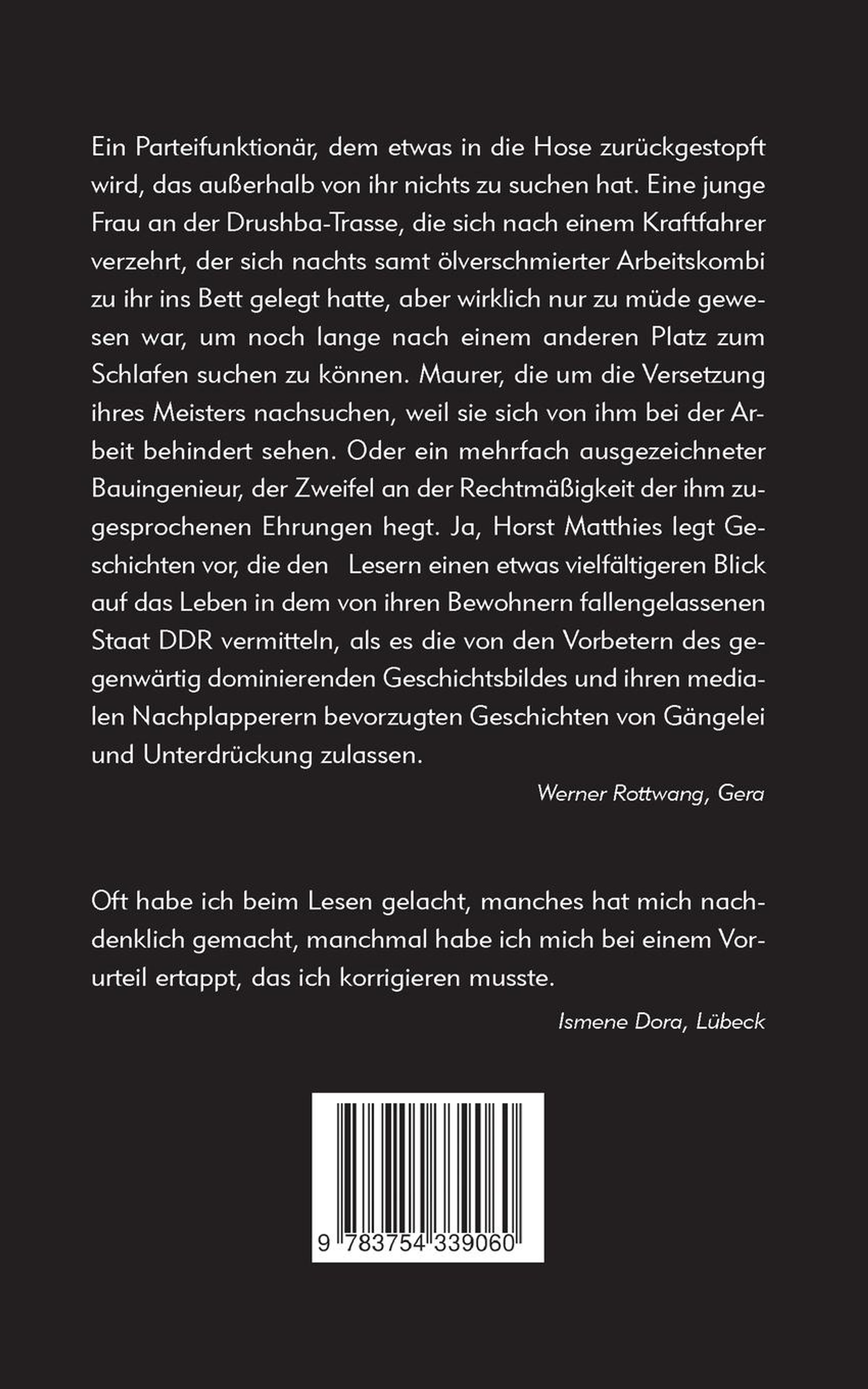 Stasi-Diktatur und Unrechtsastaat oder Feldversuch einer auf sozialere Beziehungen der Menschen gerichteten Lebensweise? - Hort ewigen Leidens oder Raum für ein lustvolles, von den Widersprüchen zwischen Ideal und Wirklichkeit bestimmtes Leben? - Was war das für eine Welt, die am 18. März 1990 von einer Mehrheit der wahlberechtigten Bewohner der DDR abgewählt wurde? Horst Matthies hat in seinen Schubladen gekramt und bisher unveröffentlichte Texte sowie Geschichten aus Büchern zusammengetragen, die vor dem Schluckauf der Geschichte erschienen sind, wie er die Ereignisse von 1989 / 90 nennt. Mancher dieser Texte könnte heute manchen Lesern weh tun, mancher ihnen ein nachsichtiges Lächeln abnötigen, mancher auch Anlass für ein bauchkrümmendes Gelächter geben. Erhellend aber dürften sie in jedem Fall sein.