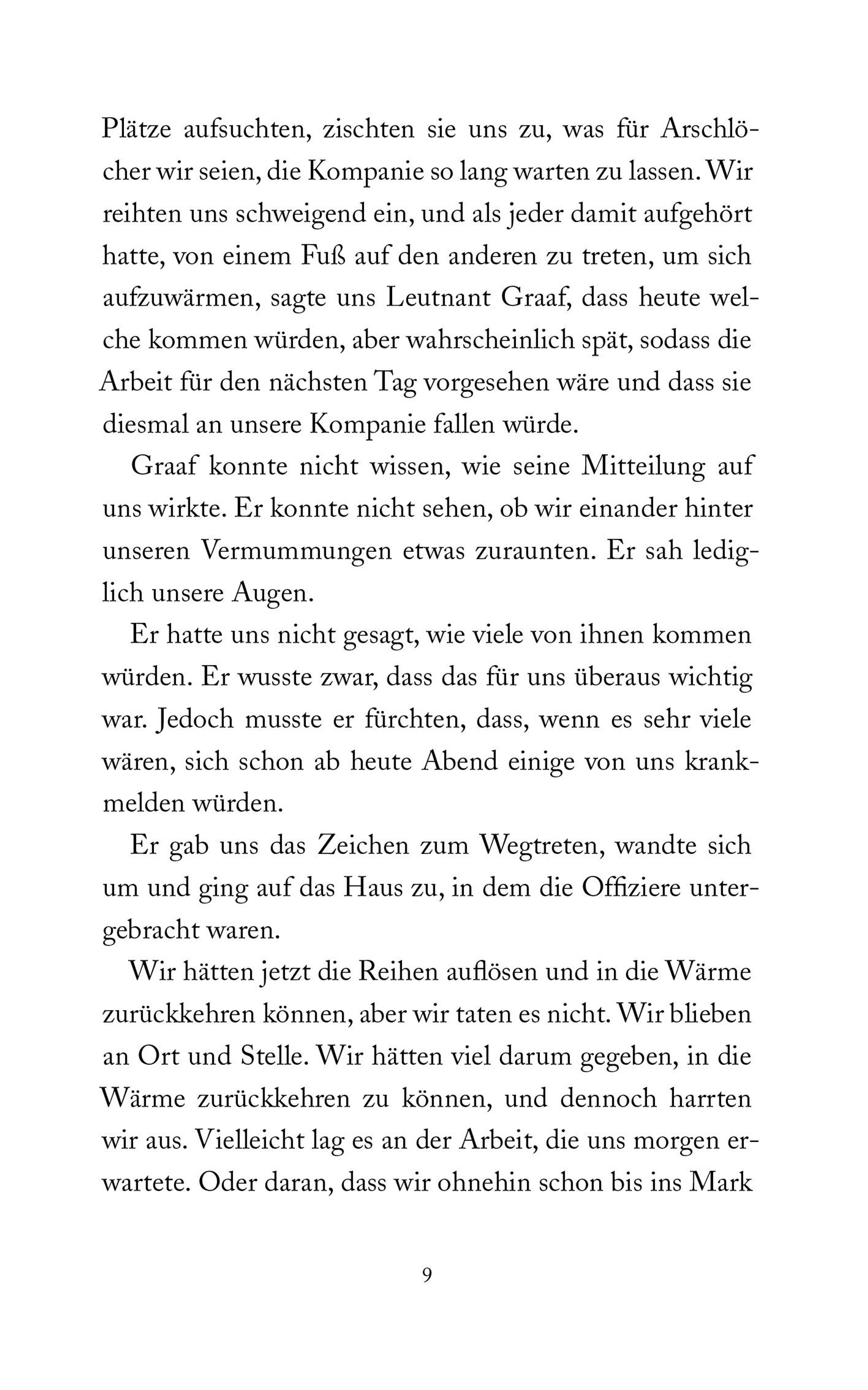 Noch vor der Tagwache begeben sich drei Wehrmachtssoldaten auf den Weg, um in der verschneiten Umgebung versteckte Juden zu finden. Für sie eine Möglichkeit, den täglichen Erschießungen im Lager zu entgehen. Nachdem sie einen jungen Mann gefangen genommen haben, suchen sie auf dem Rückweg in einem verlassenen Haus Schutz vor dem Hunger und der quälenden Kälte, die all ihr Denken überlagern. Während sie darauf warten, dass das Feuer im Ofen brennt und die Suppe kocht, treten ihre persönlichen Bedürfnisse und Sorgen allmählich in den Hintergrund; und das unfassbare Grauen, in dem sie stecken, bekommt ein neues Gewicht. - Auf kleinem Raum erzählt Hubert Mingarelli von zweifelhaften Gnadenakten, undenkbarer Schuld und der Banalität des Bösen, schlicht und eindringlich.