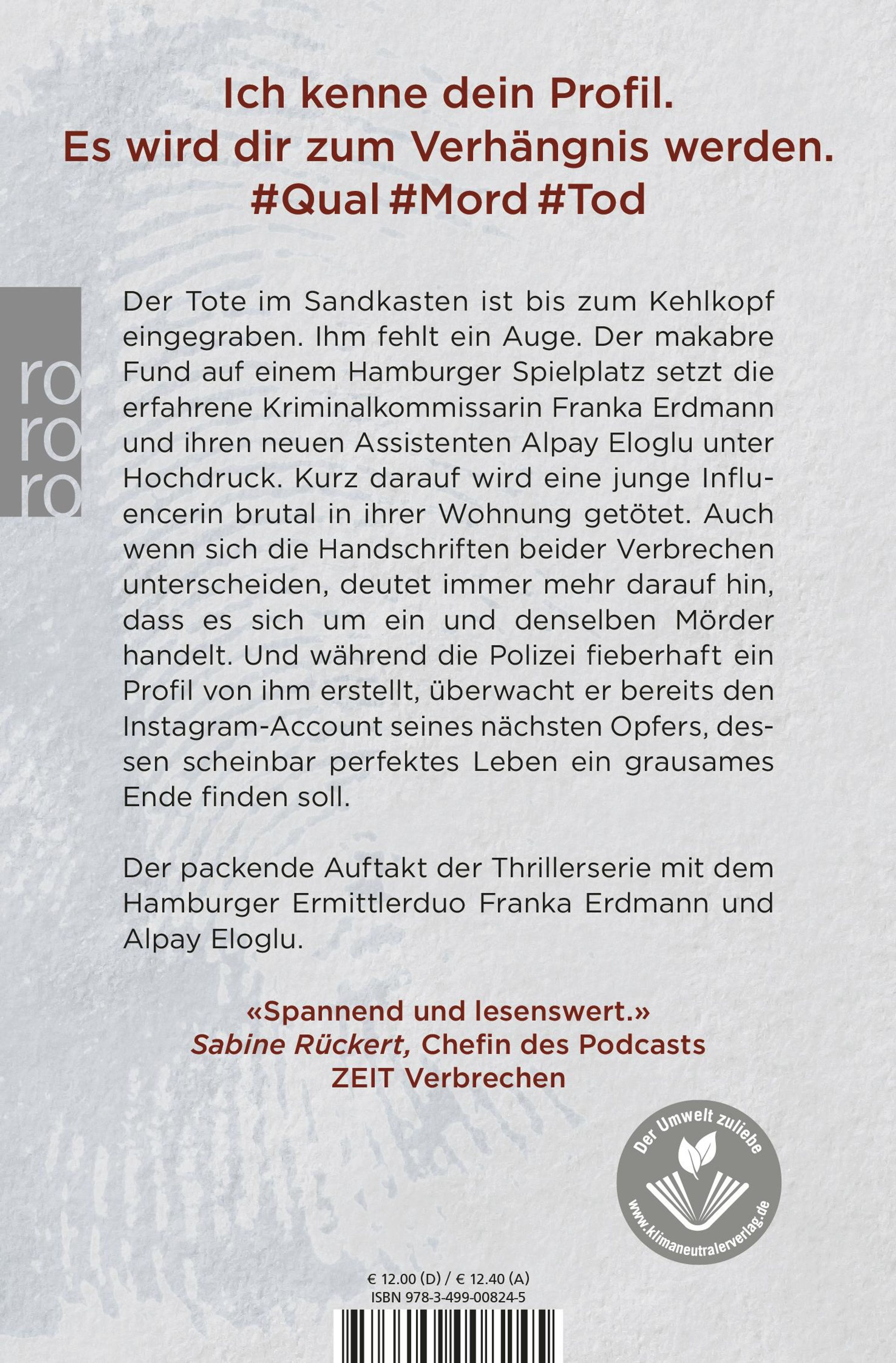 Der Tote im Sandkasten ist bis zum Kehlkopf eingegraben. Ihm fehlt ein Auge. Der makabre Fund auf einem Hamburger Spielplatz setzt die erfahrene Kriminalkommissarin Franka Erdmann und ihren neuen Assistenten Alpay Eloglu unter Hochdruck. Kurz darauf wird eine junge Influencerin brutal in ihrer Wohnung getötet. Auch wenn sich die Handschriften beider Verbrechen unterscheiden, deutet immer mehr darauf hin, dass es sich um denselben Mörder handelt. Und während die Polizei fieberhaft ein Profil von ihm erstellt, überwacht er bereits den Instagram-Account seines nächsten Opfers, dessen scheinbar perfektes Leben ein grausames Ende finden soll.