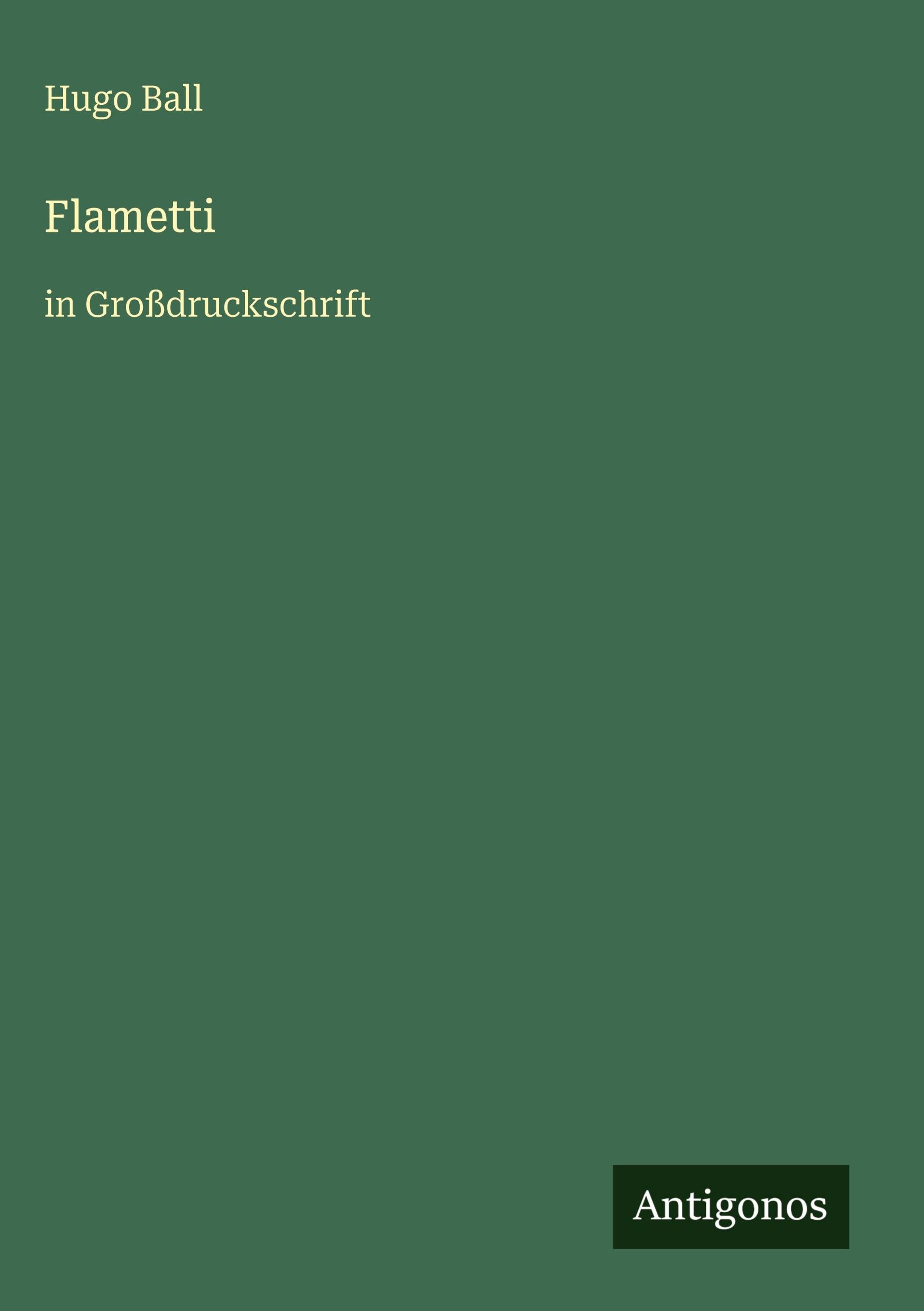 "Hugo Ball, Flametti, in Großdruckschrift." Grüner Hintergrund, unten rechts ein schwarzes "Antigonos" Logo., Buch