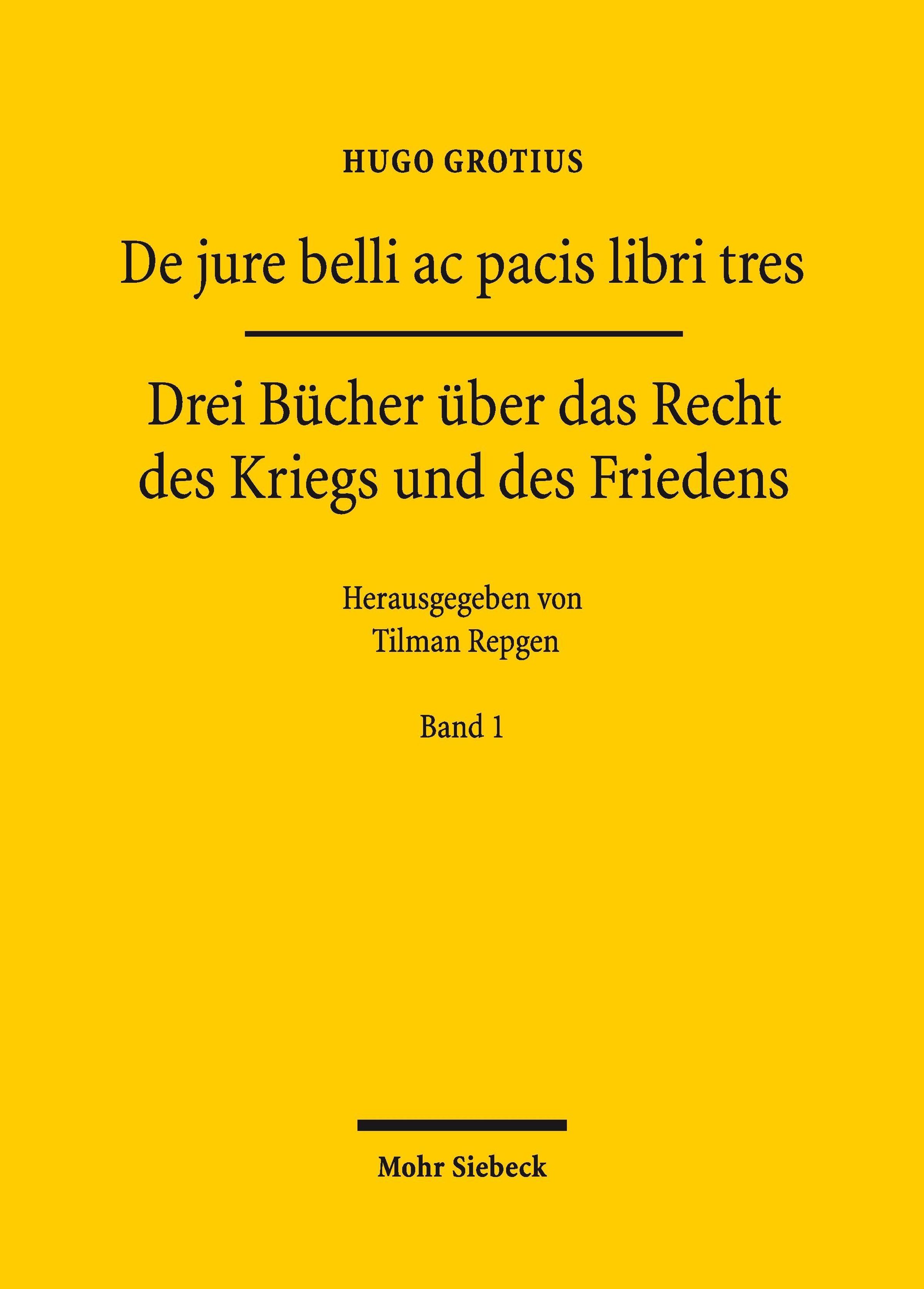 Text: "Hugo Grotius, De jure belli ac pacis libri tres, Drei Bücher über das Recht des Kriegs und des Friedens." Gelber Hintergrund., Buch