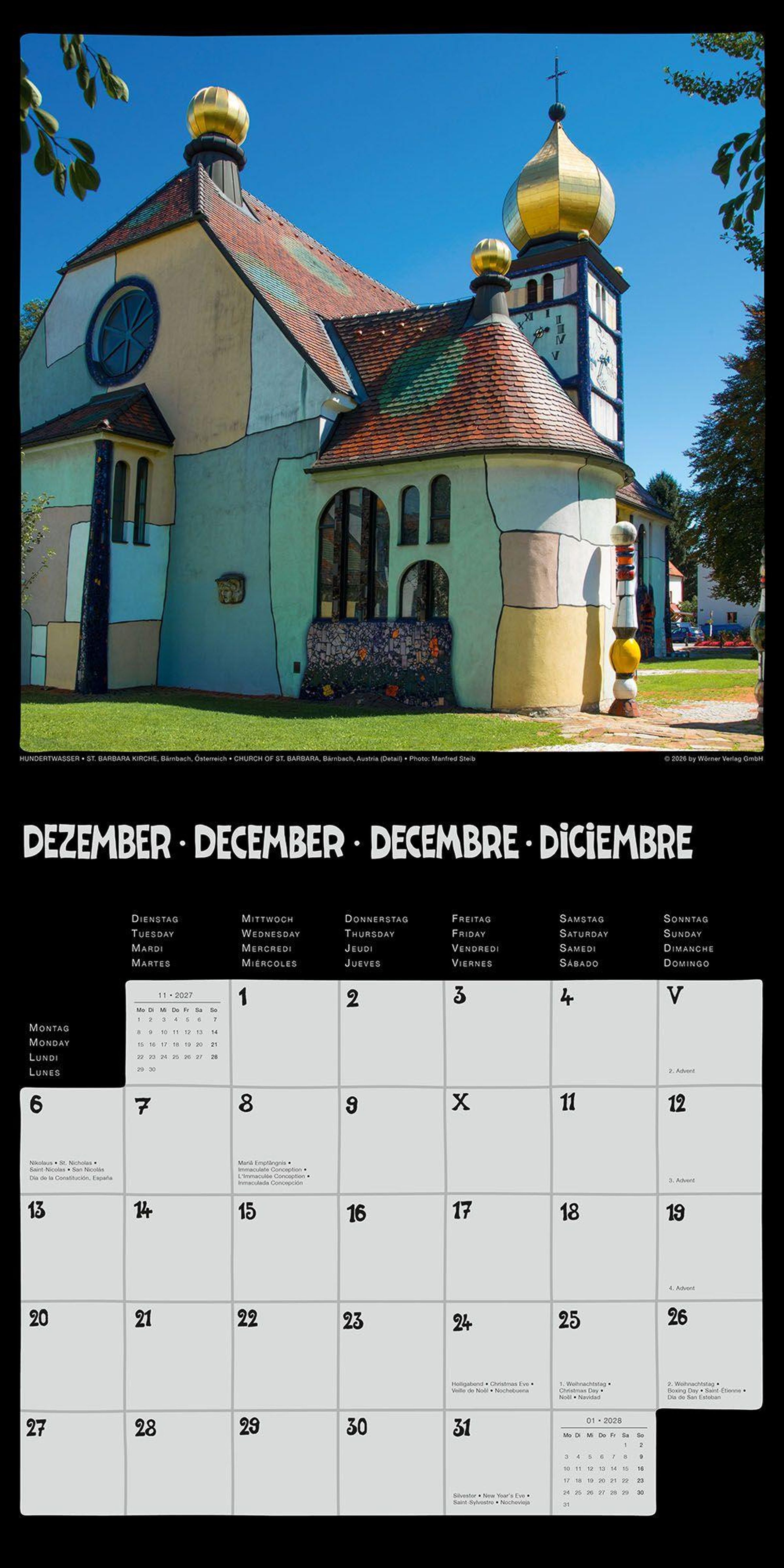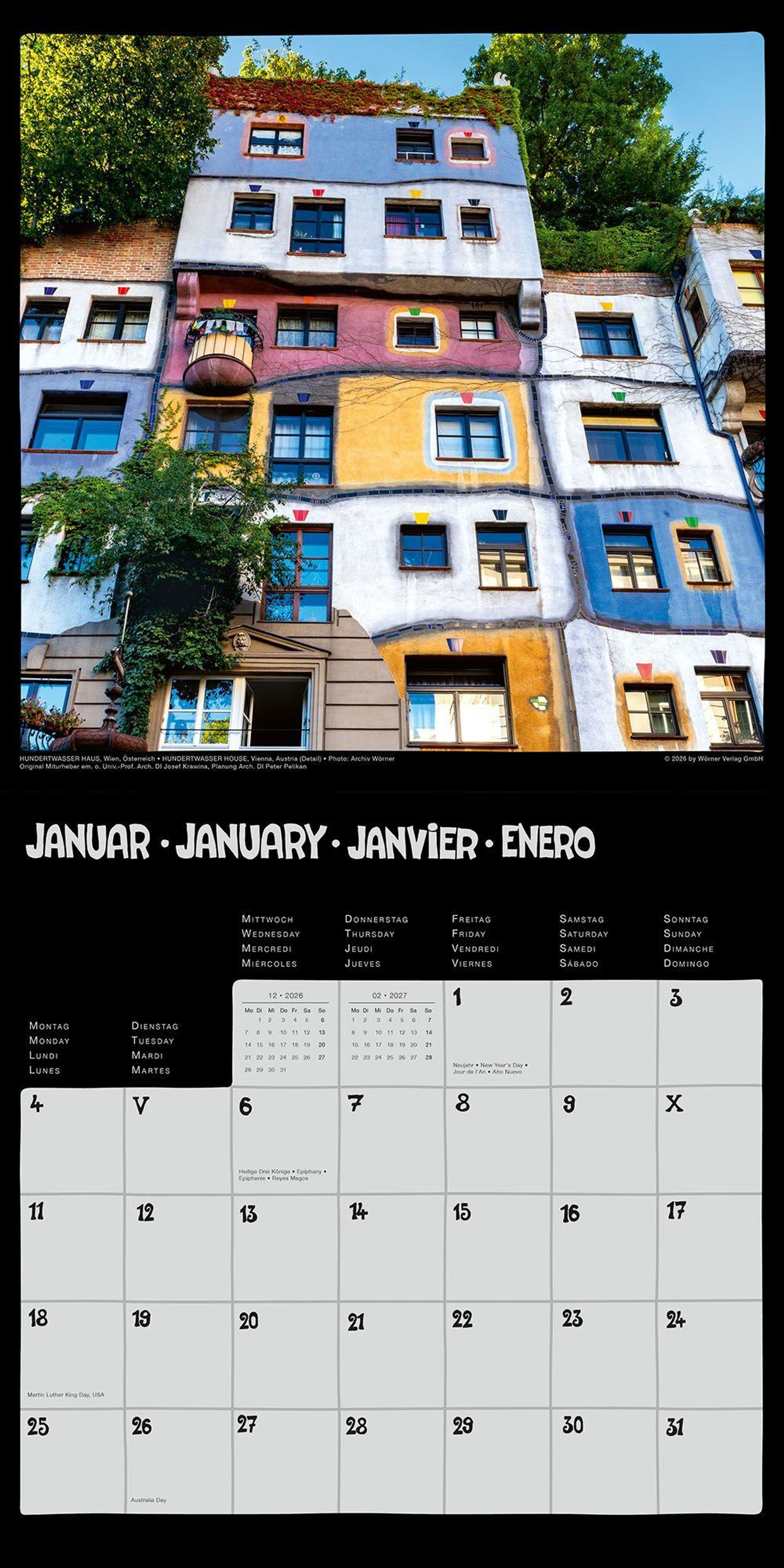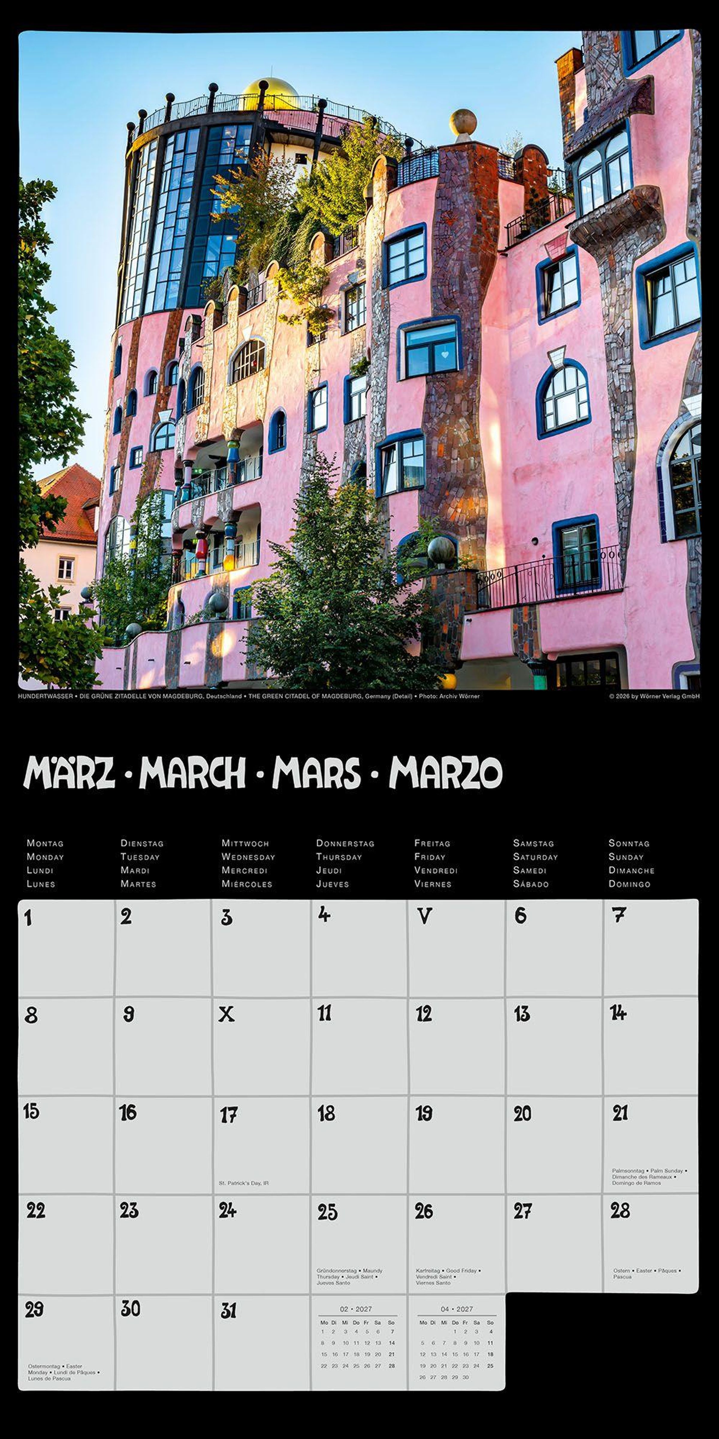 Der Hundertwasser Broschürenkalender Architektur 2027 im Format 30 x 30 cm ist mit der Hundertwasser Gemeinnützigen Privatstiftung abgestimmt. Dieser Kalender besticht durch eine besondere Auswahl brillanter Fotografien. Qualitätsmerkmale wie ein glanzfolienveredeltes Titelbild, ein 6-Farben-Premium-Offsetdruck und bis zu 250 g / m2 starkes FSC-zertifiziertes Papier unterscheiden diesen Kalender von der üblichen Massenware. Das viersprachige Kalendarium (DE, EN, FR, ES) ist attraktiv gestaltet und bietet reichlich Platz für tägliche Notizen. Wie alle unsere Hundertwasser Kalender wird auch dieser vollständig im qualitätsbewussten Deutschland hergestellt.