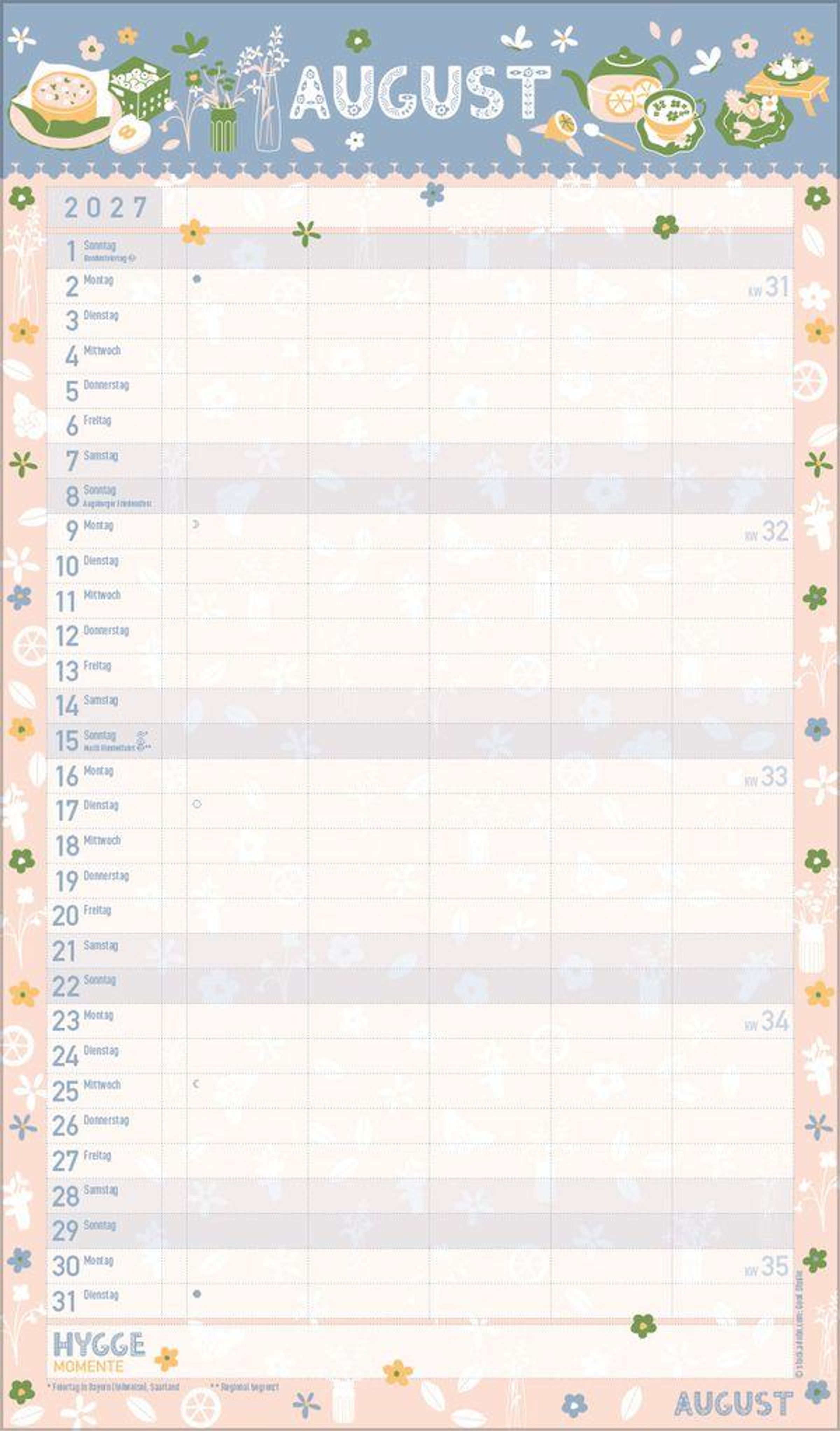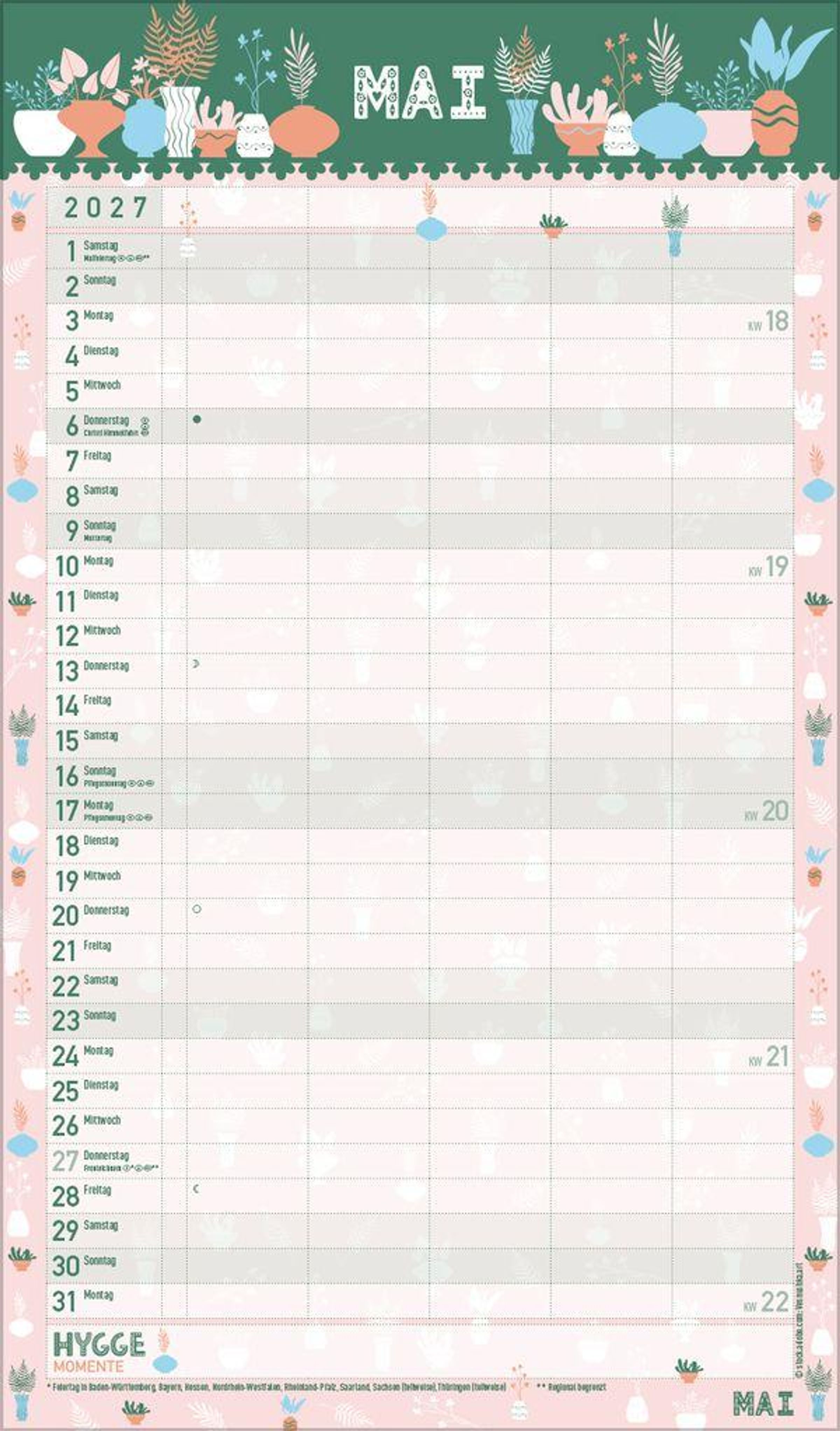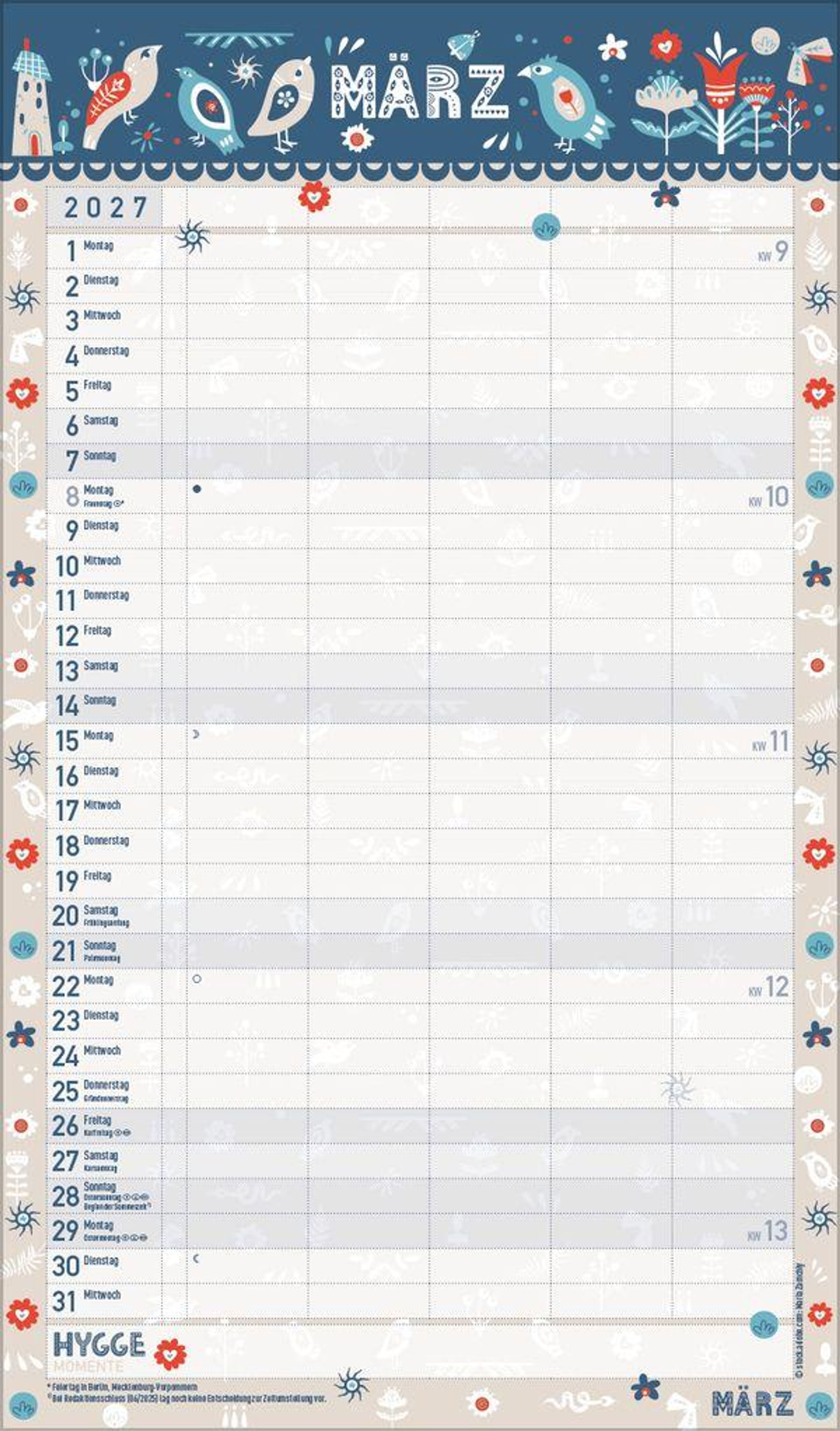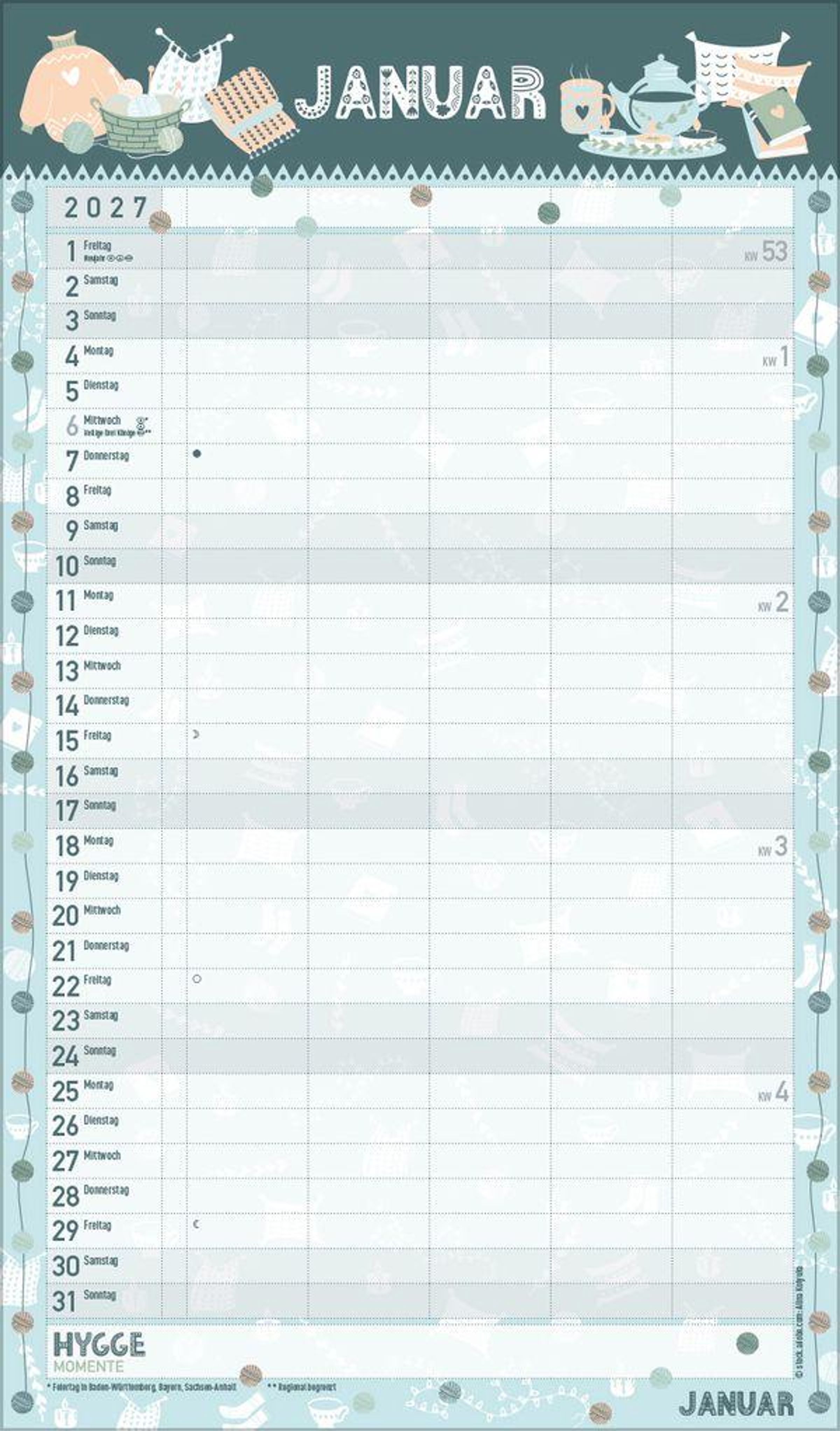 - Familienplaner, 5 große Spalten. Mit Ferienterminen, extra Spalte und Vorschau bis März 2027. Mit extra Platz für hyggelige Momente. Format: 27 x 46 cm