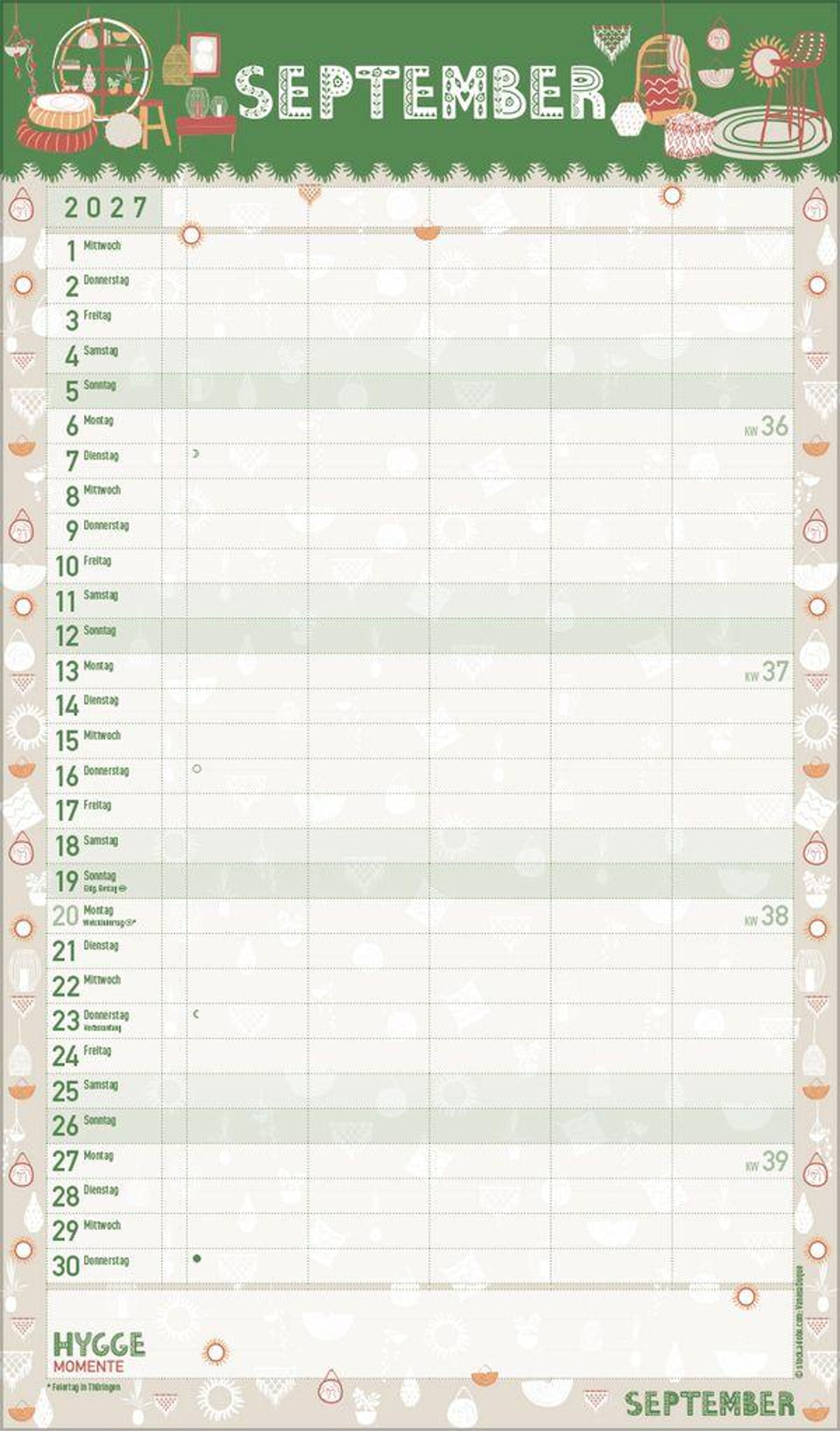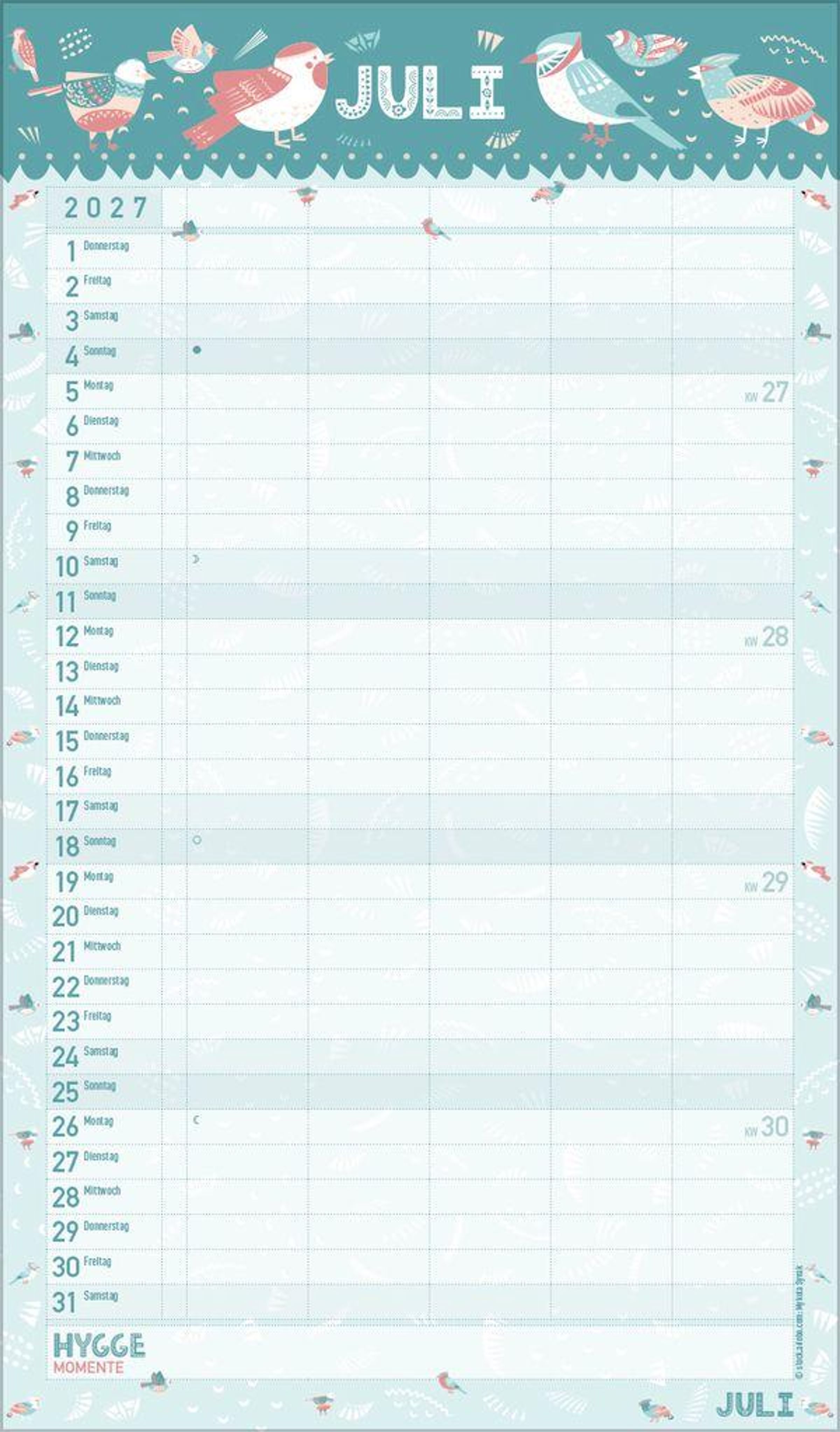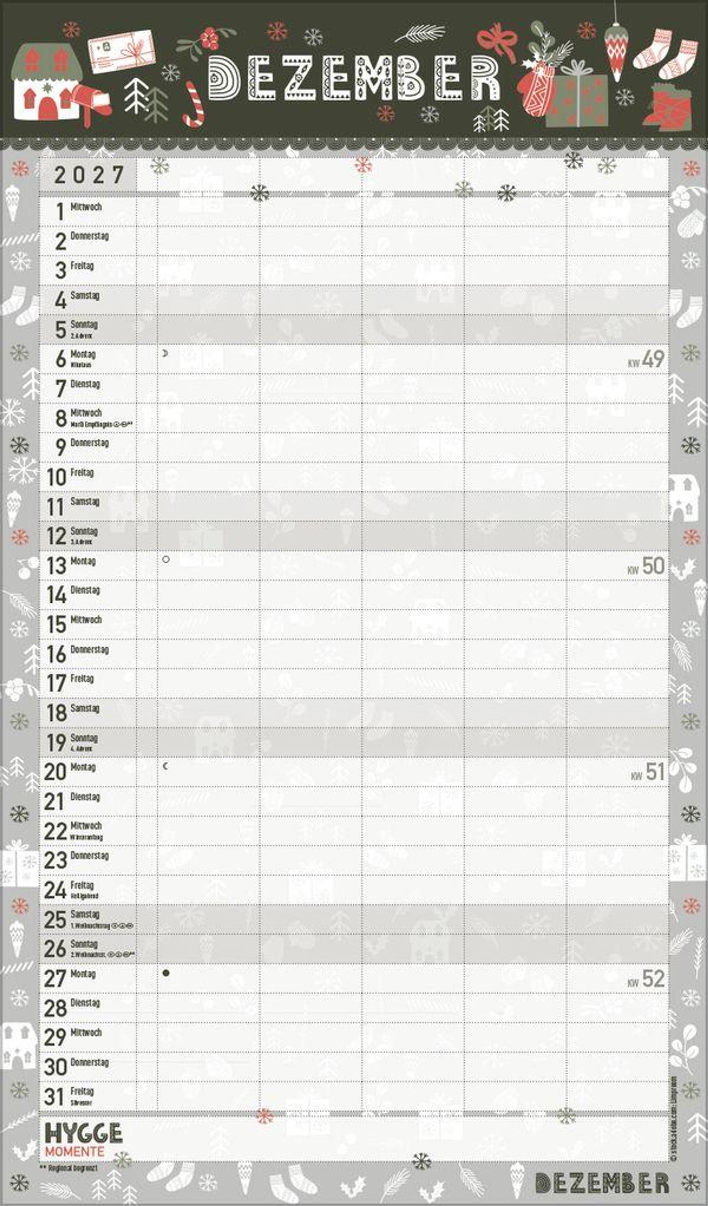 - Familienplaner, 5 große Spalten. Mit Ferienterminen, extra Spalte und Vorschau bis März 2027. Mit extra Platz für hyggelige Momente. Format: 27 x 46 cm