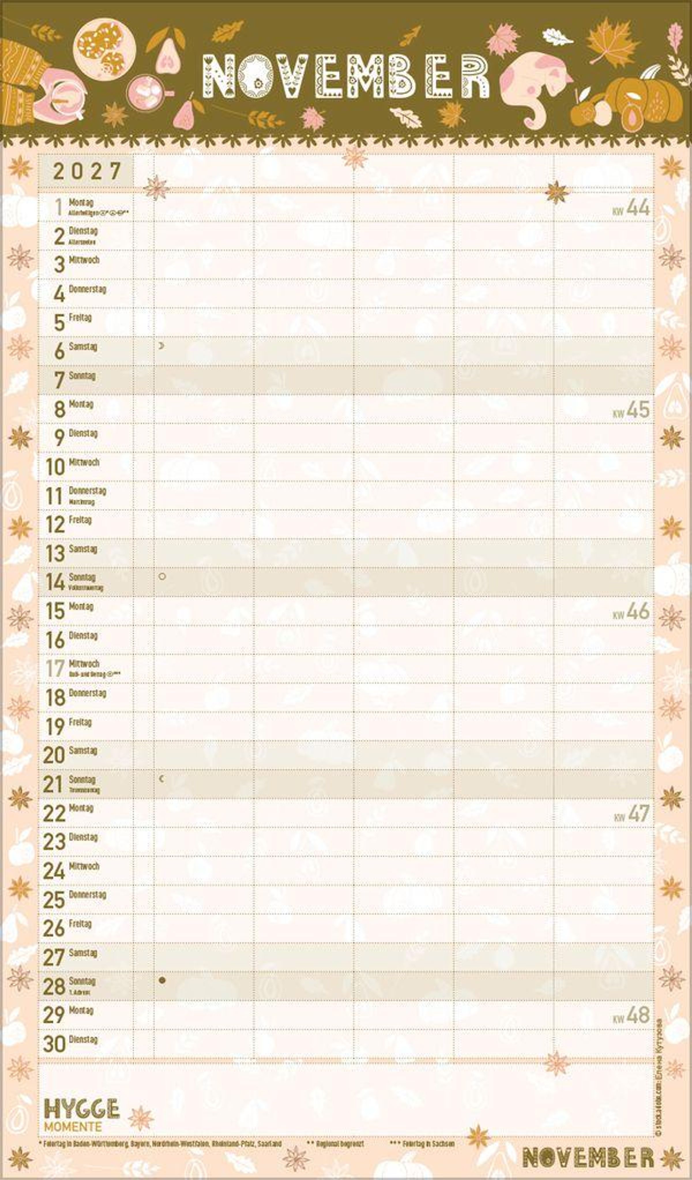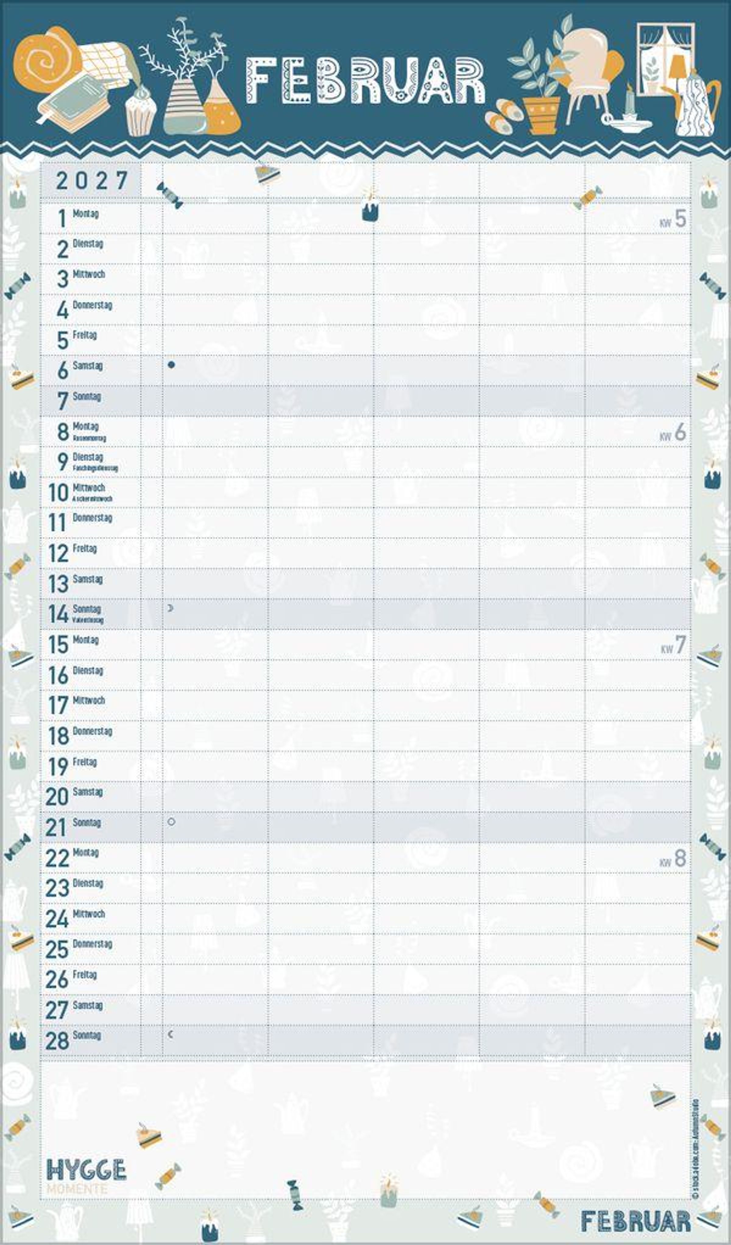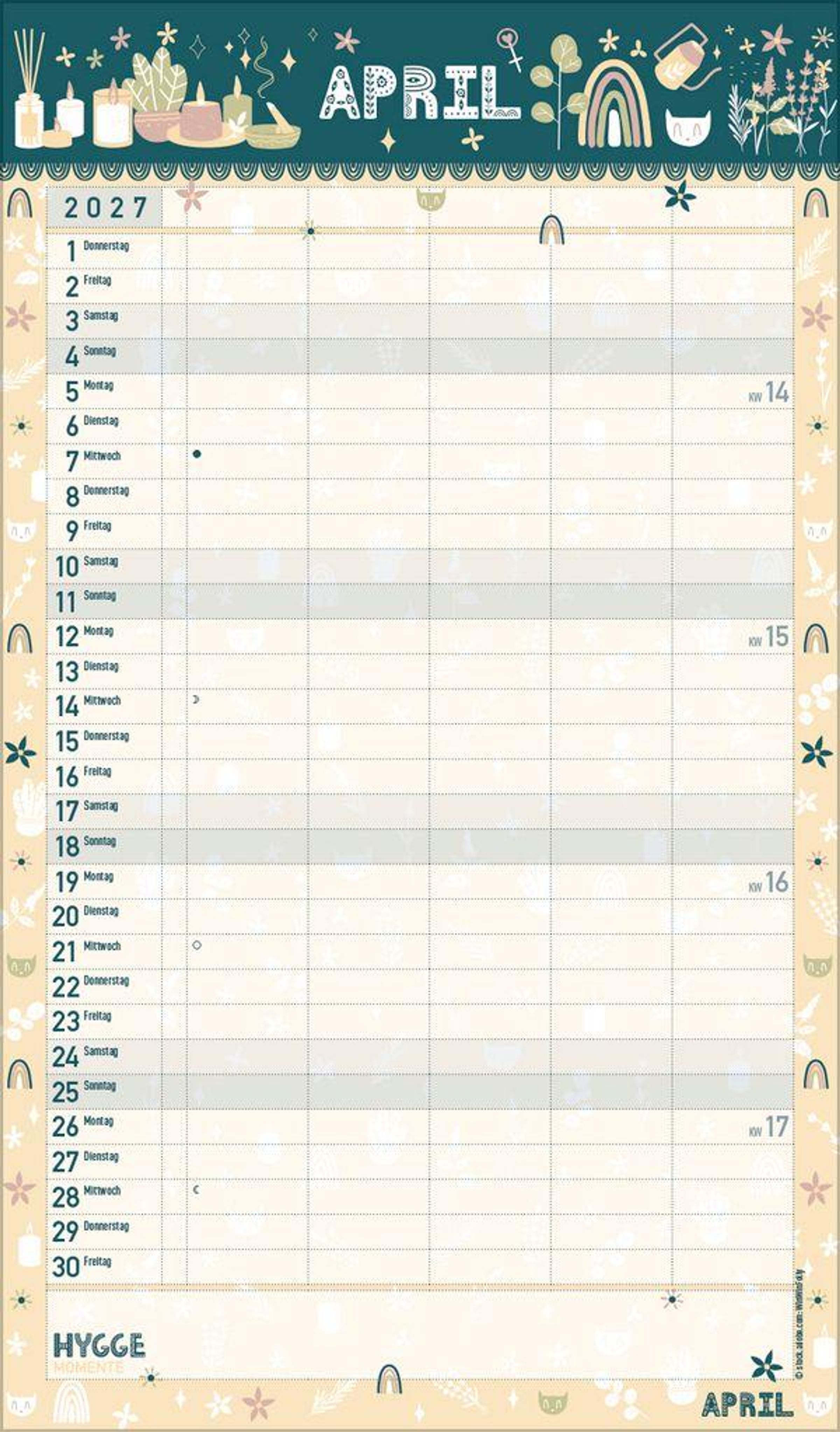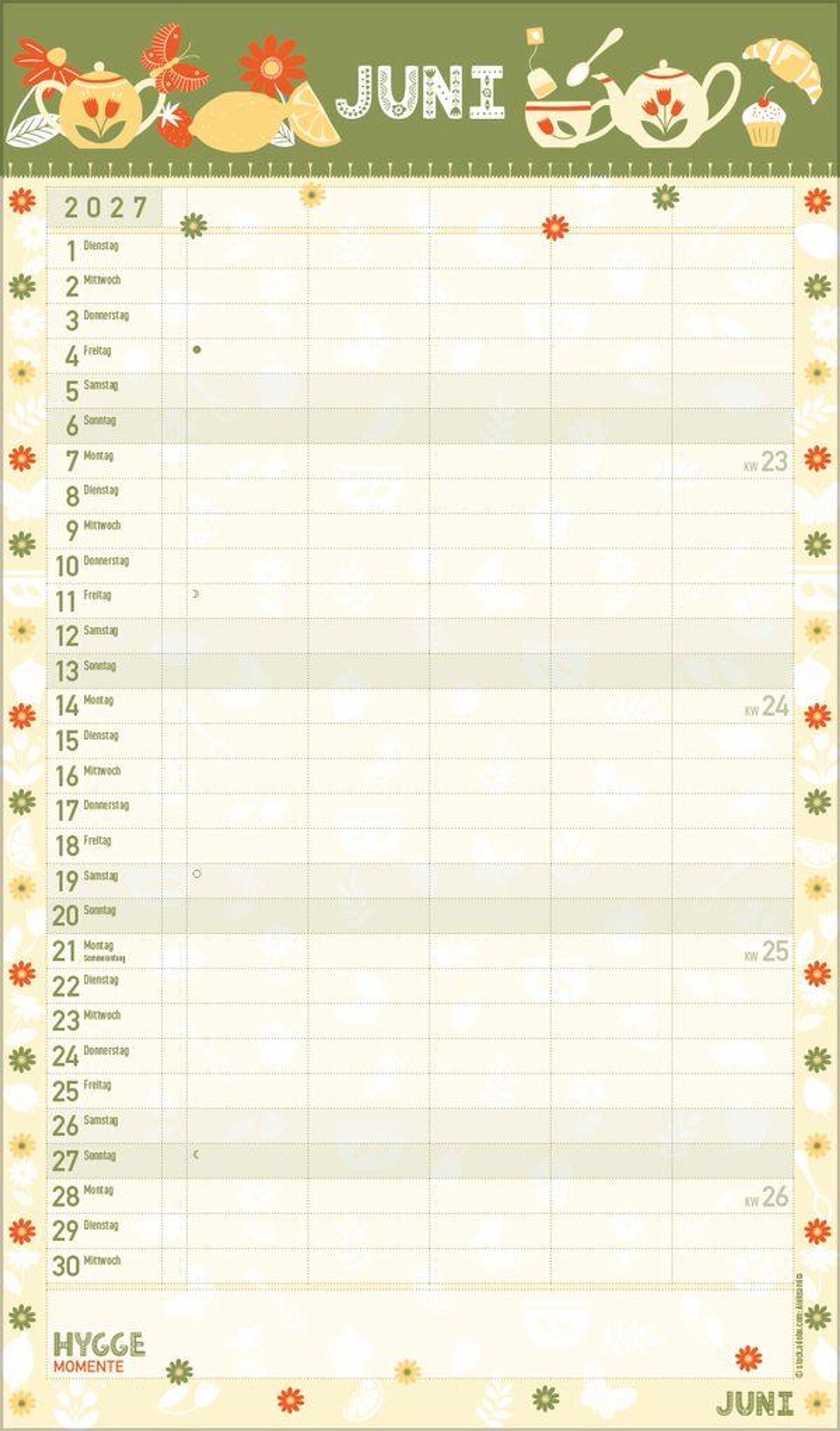 - Familienplaner, 5 große Spalten. Mit Ferienterminen, extra Spalte und Vorschau bis März 2027. Mit extra Platz für hyggelige Momente. Format: 27 x 46 cm