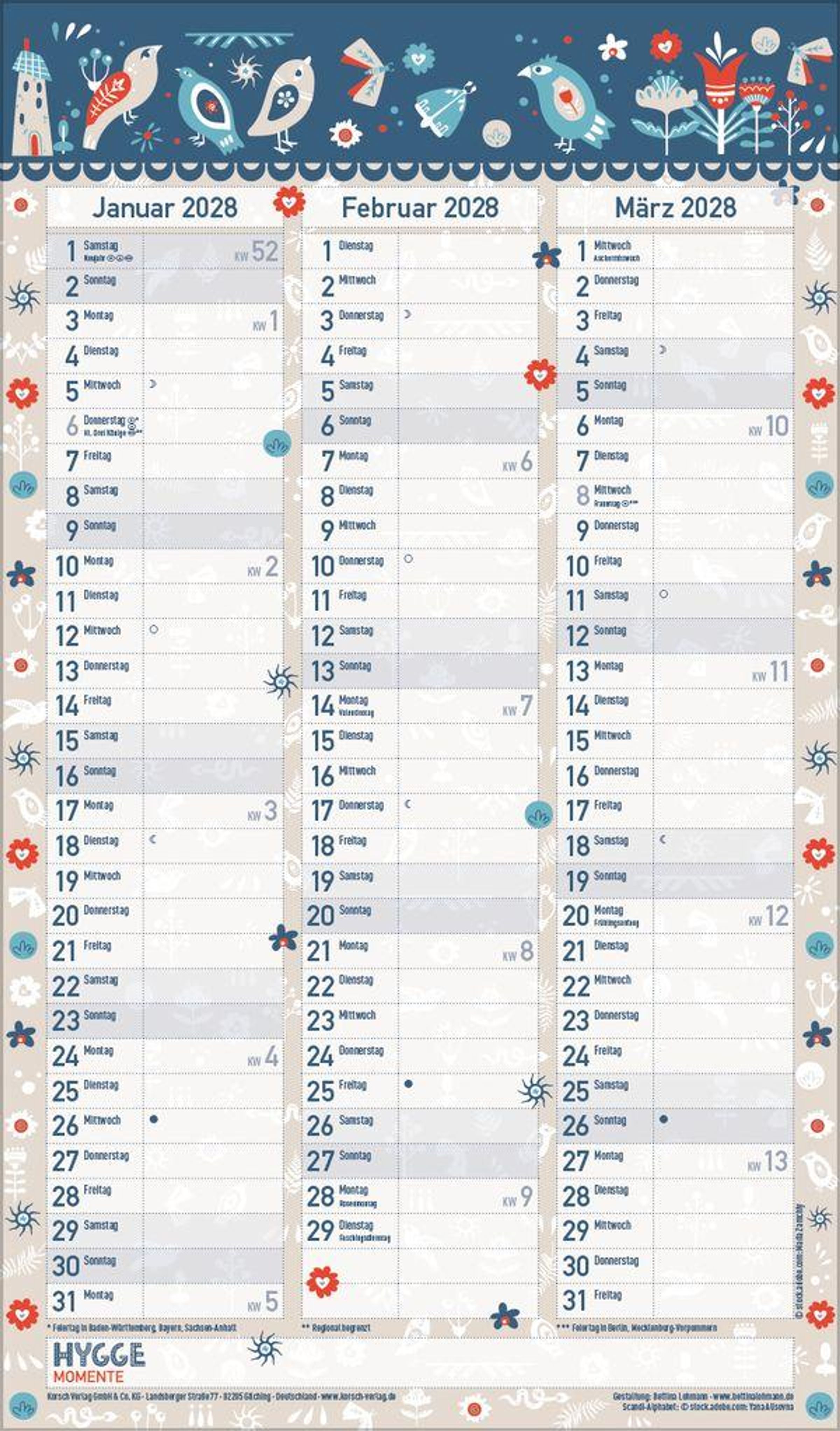Mach es dir gemütlich und nimm dir Zeit für alles Schöne im Leben - bei diesem mit viel Liebe zum Detail gestalteten Familienplaner ist die dänische Glücksformel "Hygge" Programm. Skandinavische Muster und Folklore-Elemente lassen jedes Monatsblatt hyggelig aussehen und sind farblich perfekt abgestimmt. Ein Familienplaner für alle, die das Besondere suchen und den skandinavischen Wohnstil lieben. Mit fünf Spalten plus Müllspalte, Ferienterminen und Vorschau bis März des Folgejahres sowie extra Platz zum Eintragen besonders hyggeliger Momente.