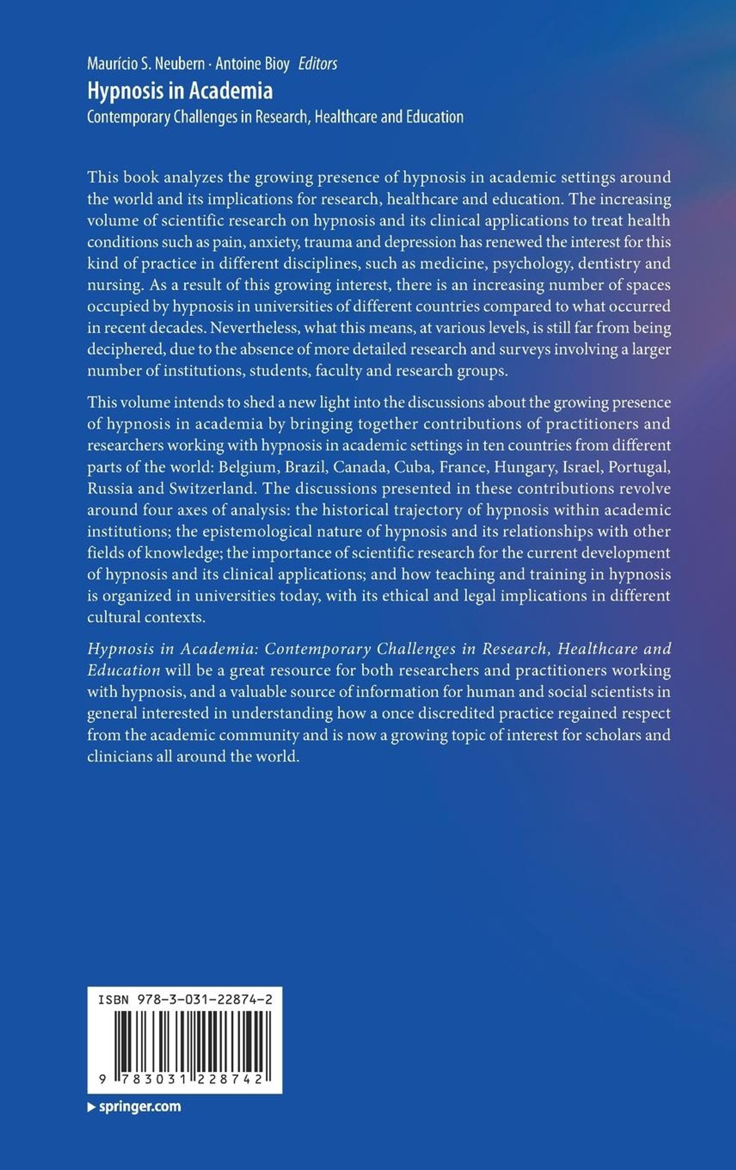 This volume intends to shed a new light into the discussions about the growing presence of hypnosis in academia by bringing together contributions of practitioners and researchers working with hypnosis in academic settings in ten countries from different parts of the world: Belgium, Brazil, Canada, Cuba, France, Hungary, Israel, Portugal, Russia and Switzerland. The discussions presented in these contributions revolve around four axes of analysis: the historical trajectory of hypnosis within academic institutions; the epistemological nature of hypnosis and its relationships with other fields of knowledge; the importance of scientific research for the current development of hypnosis and its clinical applications; and how teaching and training in hypnosis is organized in universities today, with its ethical and legal implications in different cultural contexts.