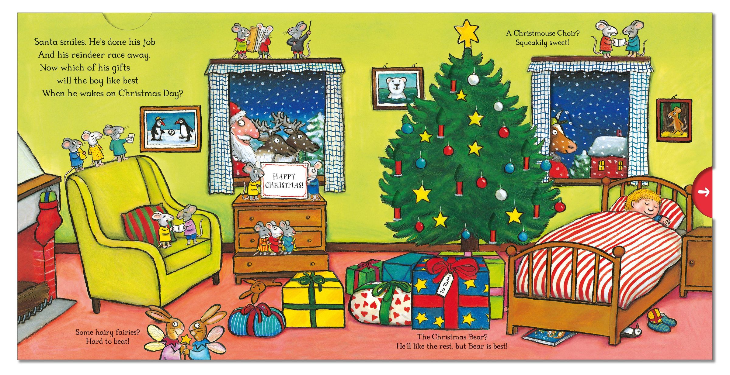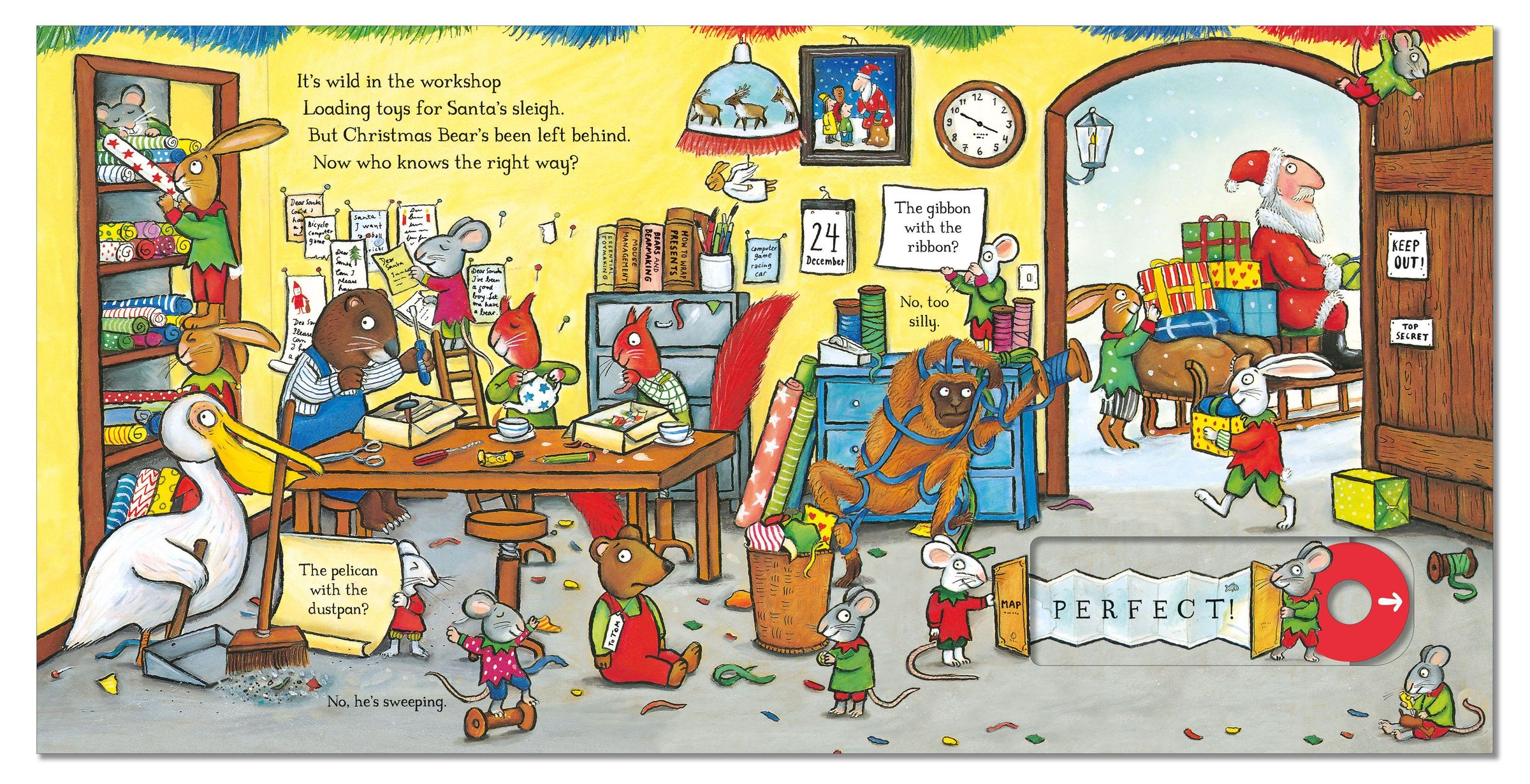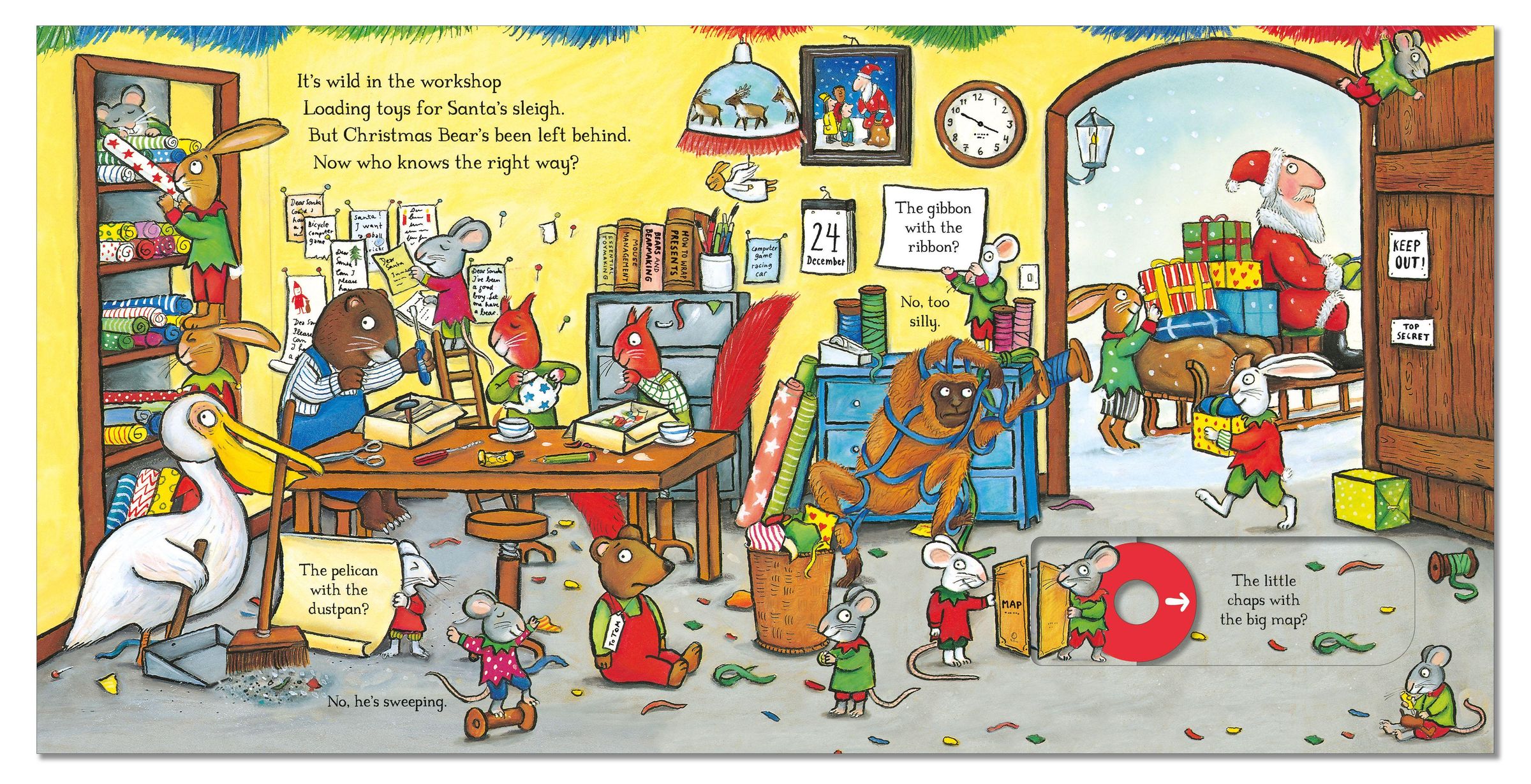 When Father Christmas sets off to deliver the presents, poor Bear is left behind in the workshop. How will he make it to Tom's house in time for Christmas morning? Push, pull and slide the scenes to find out, as he chases Santa's sleigh through icy seas and snowy forests, all the way from the North Pole to Tom's cosy bedroom.