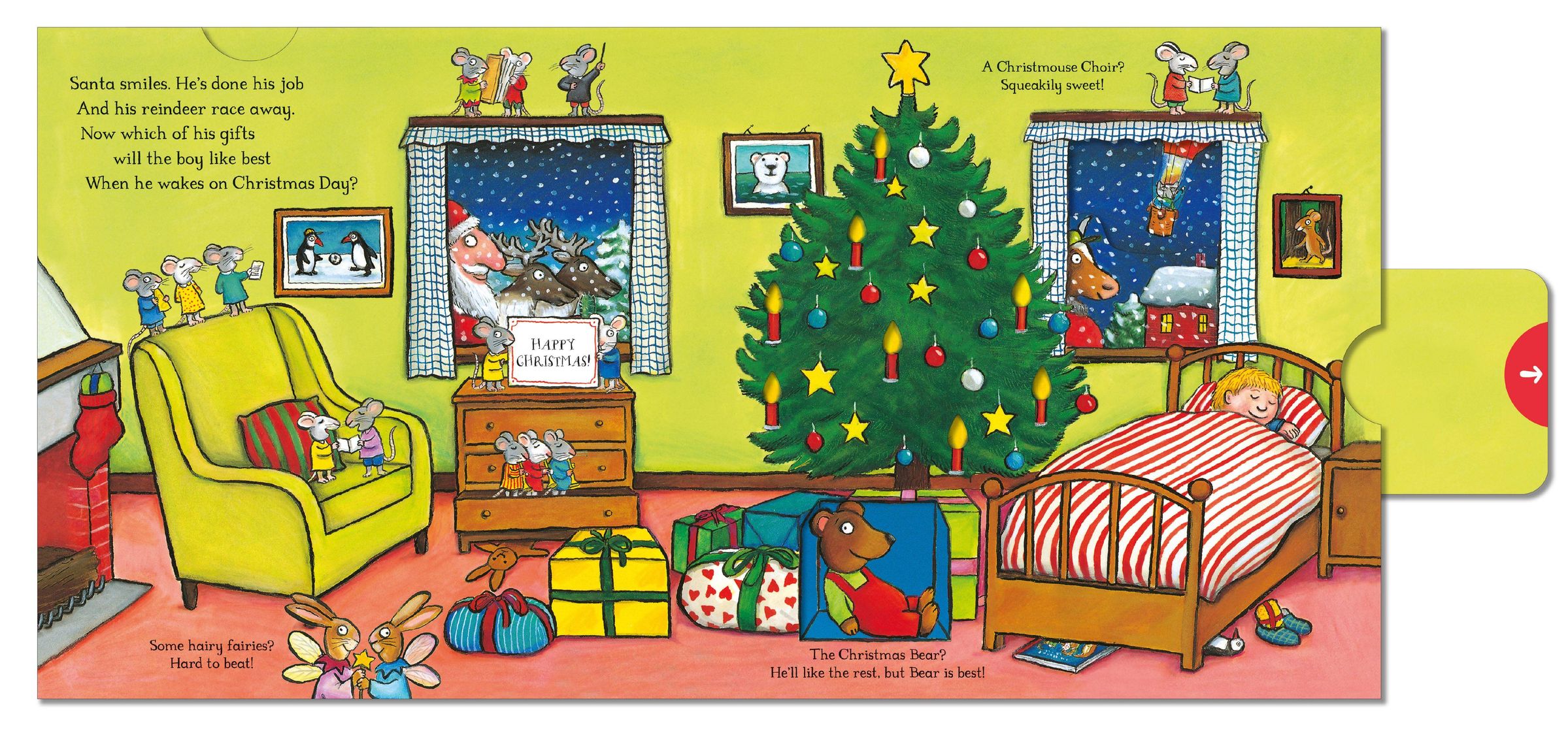 Join in the festive fun with this funny, rhyming Christmas adventure for preschoolers. With tabs to push, pull and slide on every page!