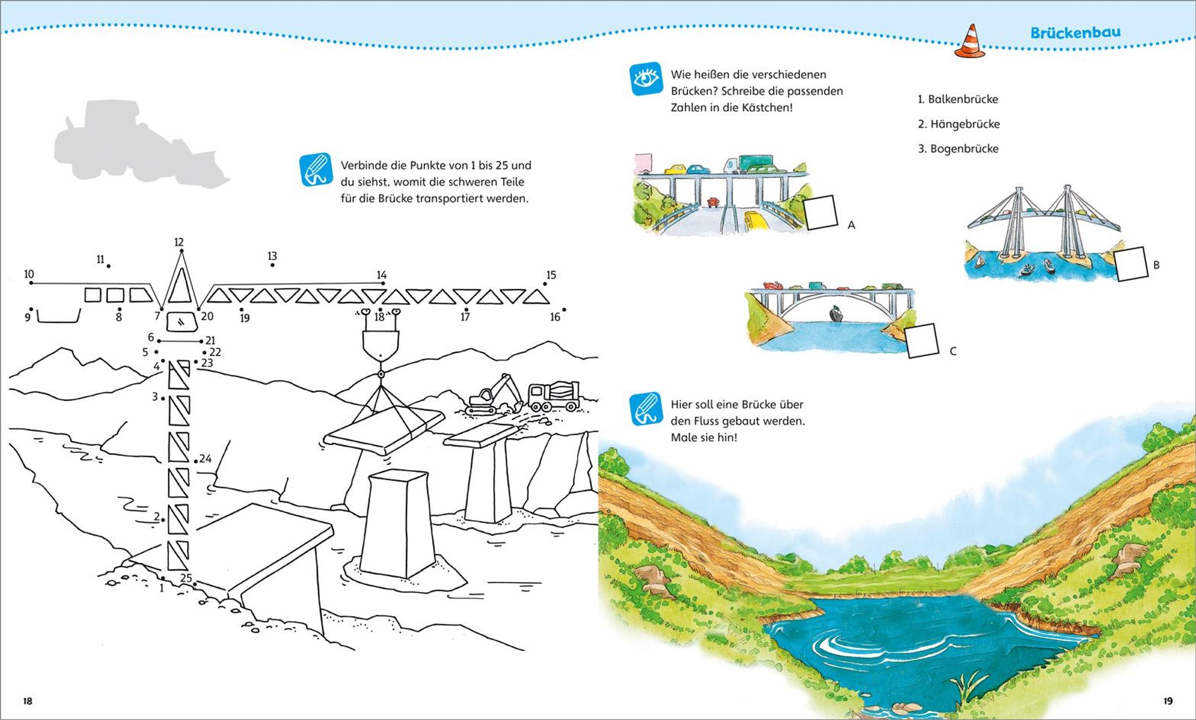 Hallo Baustellen-Experte! Fahre mit den großen Baufahrzeugen zur Baustelle und ordne den Bauarbeitern die richtigen Werkzeuge zu. Sei dabei, wenn ein Haus entsteht und hilf mit im Straßenbau. Ein bunter Mix aus tollen Ausmalbildern, spannenden Rätseln und Spielideen mit lustiger Erstlesegeschichte und wiederablösbaren Stickern lädt zum Mitmachen und Entdecken ein. Schon gewußt? Der zur Zeit längste Tunnel unter dem Meer führt von England nach Frankreich unter dem Ärmelkanal entlang. Insgesamt ist er 50, 5 Kilometer lang, 38 Kilometer davon liegen unter Wasser.