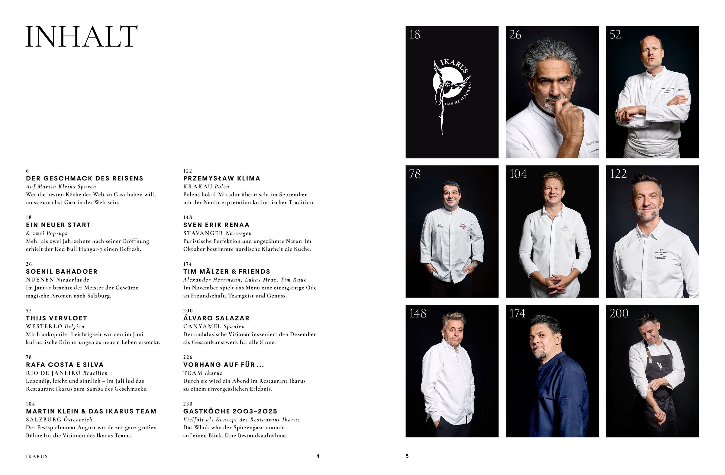 Gespräche mit den Gastköchen geben tiefe Einblicke in deren Geschichte und Arbeitsweise; Reisetipps der Protagonisten erwecken die jeweilige Heimatregion zum Leben. Darüber hinaus wird jeden Monat ein herausragendes Produkt vorgestellt, das als das Herzstück des Gastkoch-Menüs glänzt. Rezepte beeindrucken durch Finesse und kulinarische Perfektion - und laden dazu ein, tiefer in die Welt der Spitzengastronomie einzutauchen, denn dank eines QR-Codes erhalten Sie exklusiven Zugang zu einer umfangreichen Rezeptdatenbank, die das Gastkochwissen auch in Ihre Küche bringt. Auch steht Ihnen die digitale 'Ikarus Experience' mit den passenden TV-Sendungen, Weinempfehlungen und einem Blick hinter die Kulissen zur Verfügung.