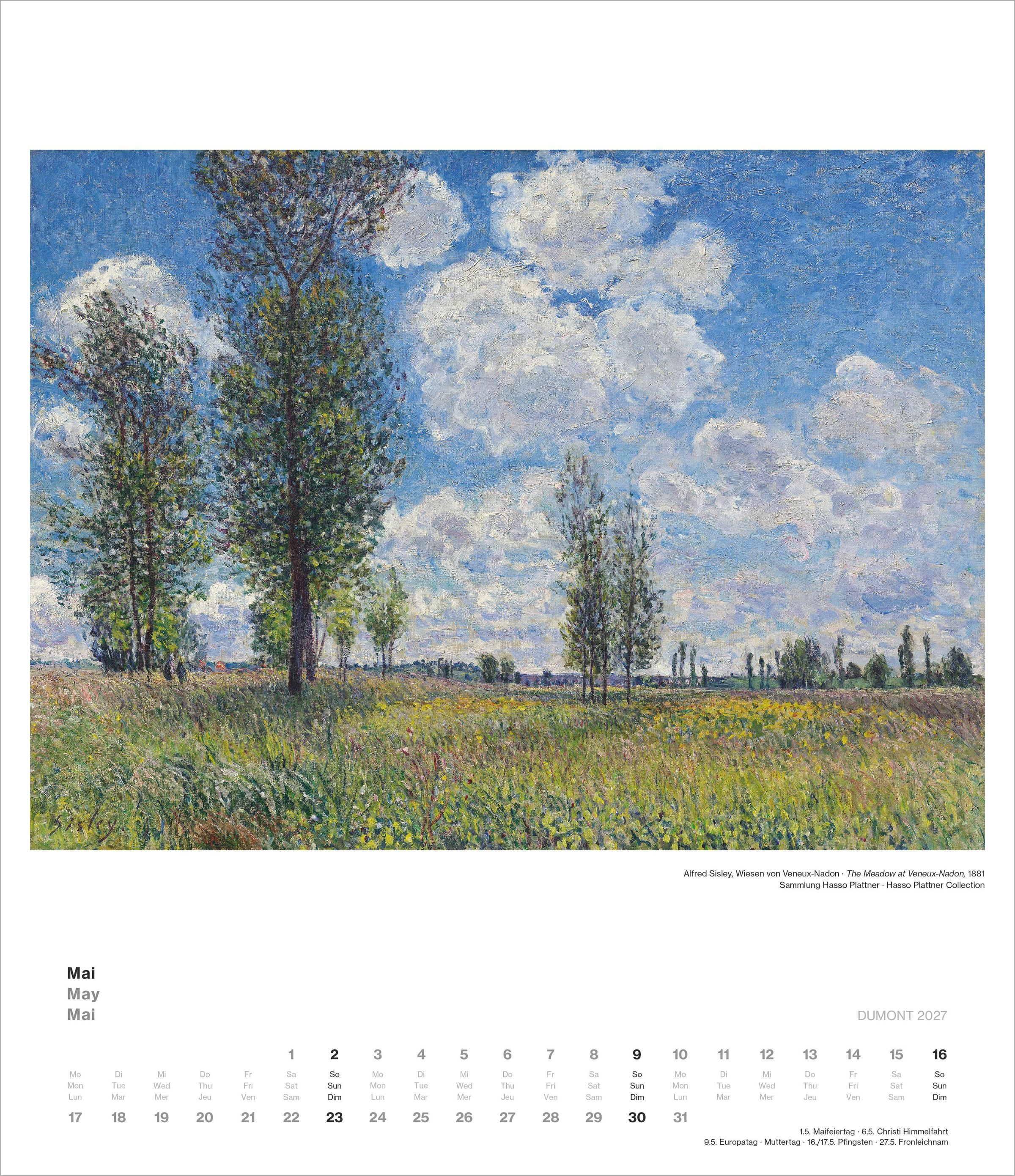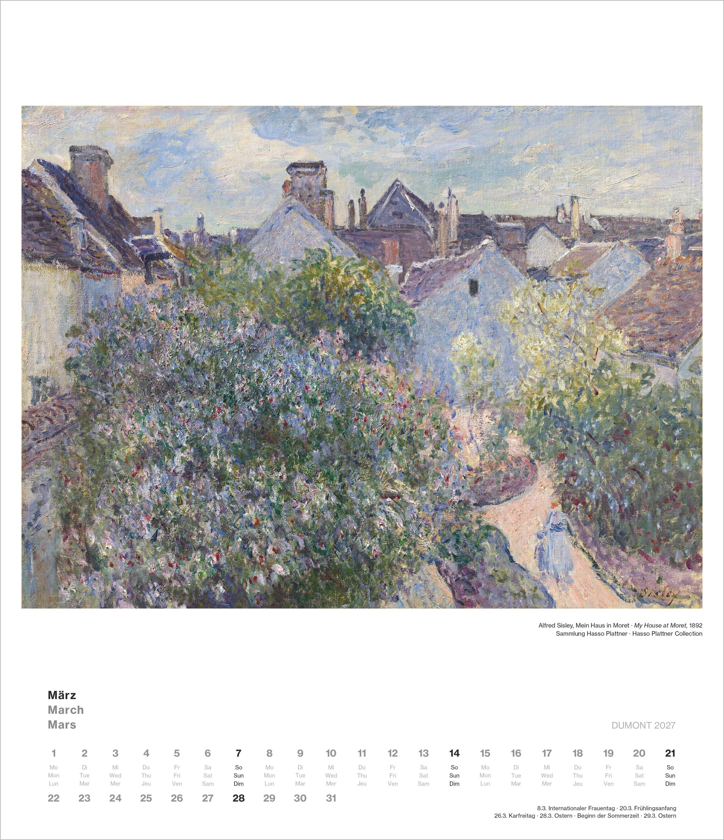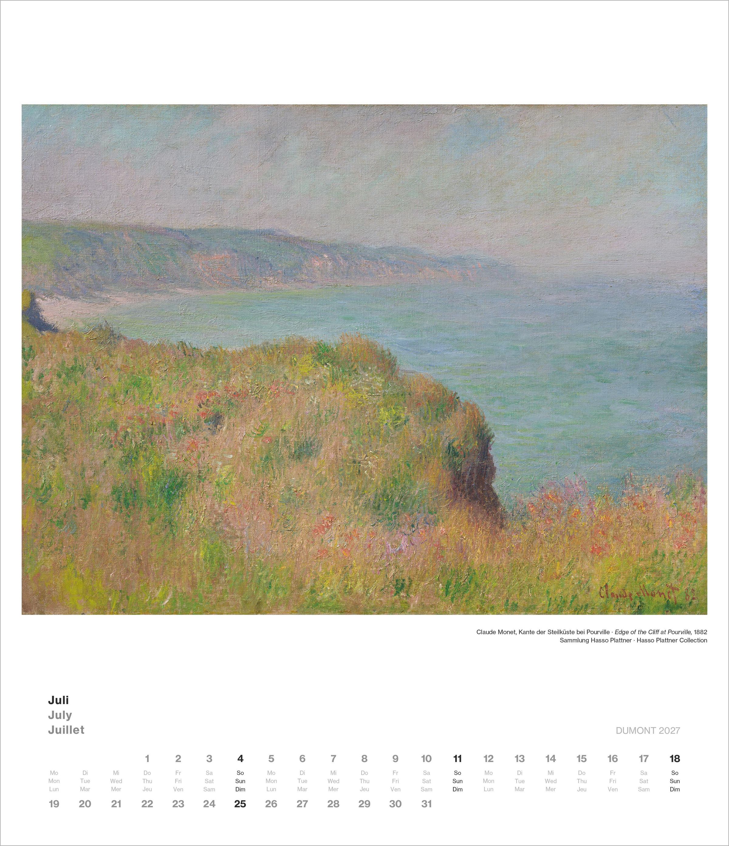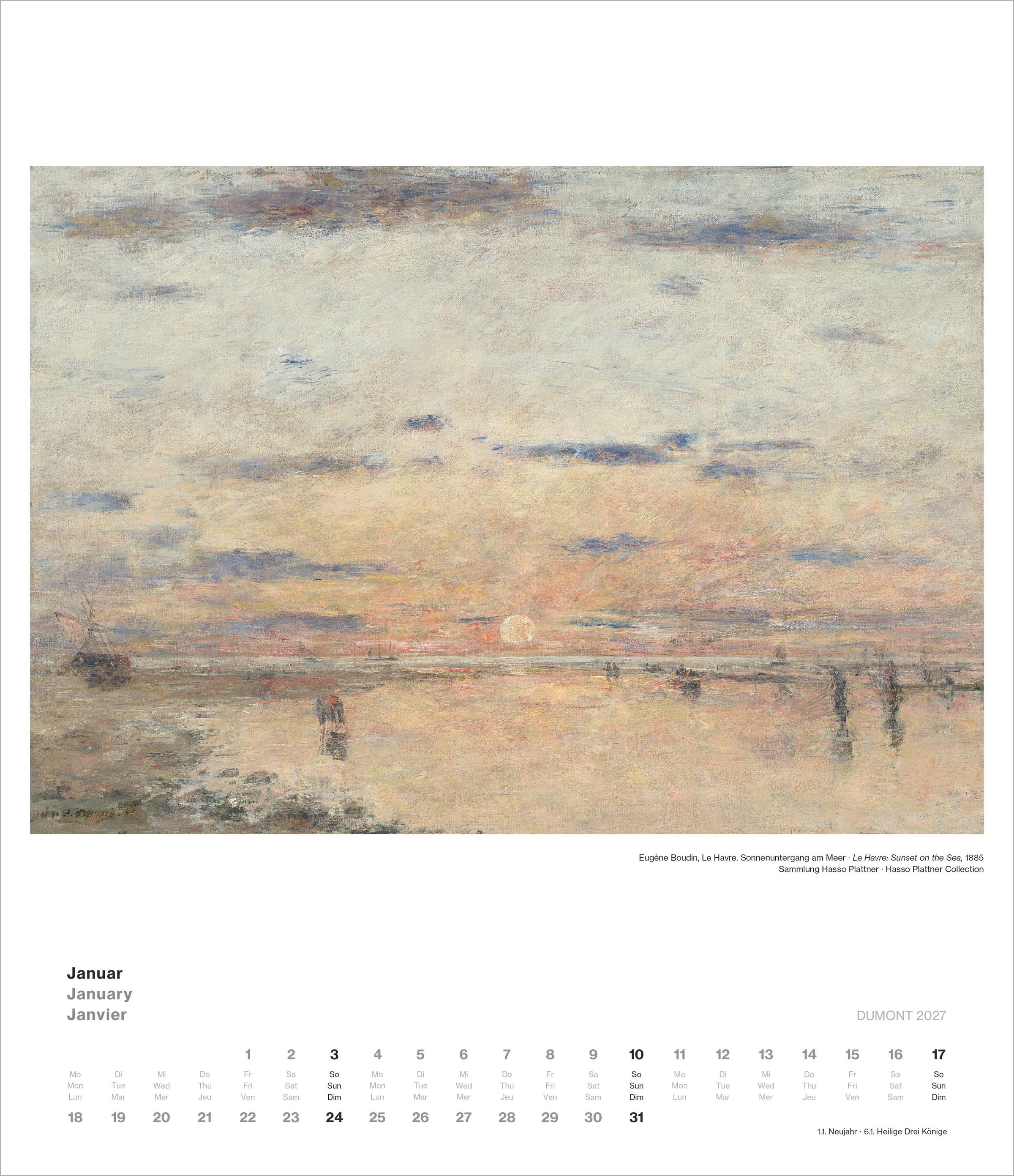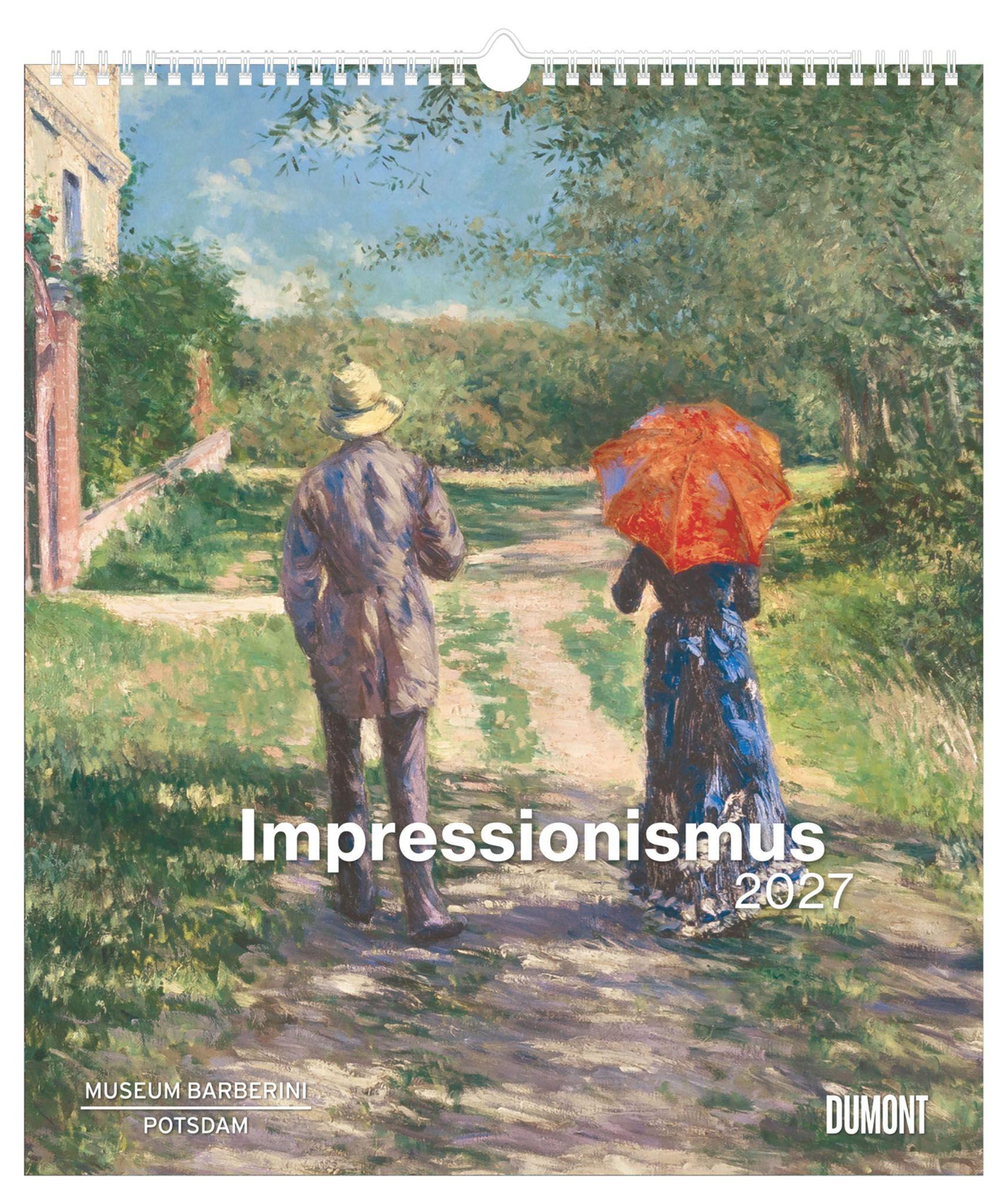 Der DUMONT Impressionismus Kalender 2027 zeigt zwölf herausragende Werke aus der bedeutenden Sammlung des Museum Barberini in Potsdam, darunter Gemälde von Monet, Boudin, Sisley, Pissarro und weiteren Meistern.