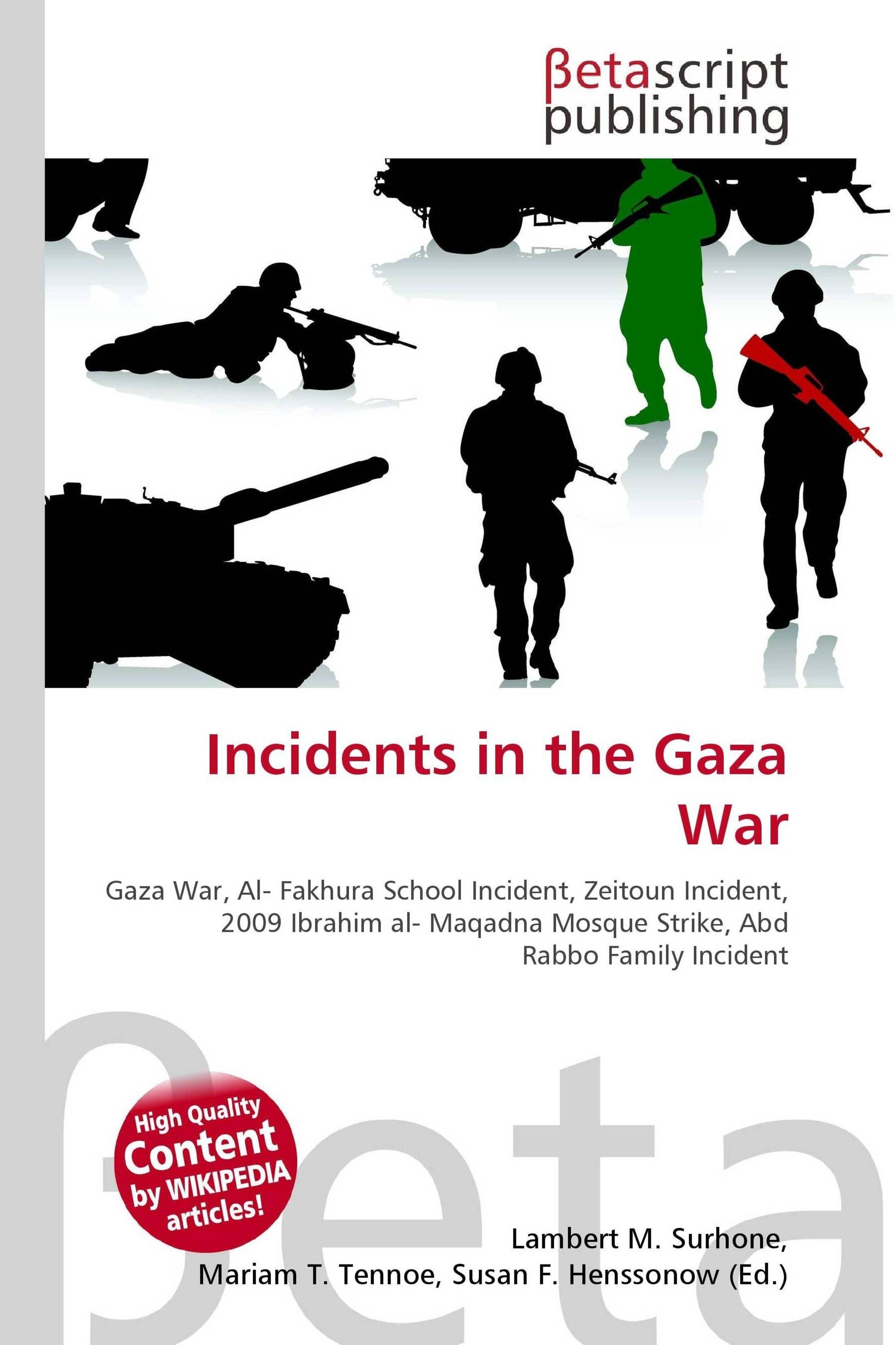 „Incidents in the Gaza War“, Silhouetten von Soldaten und Panzern in Schwarz, Rot und Grün, „betascript publishing“., Buch
