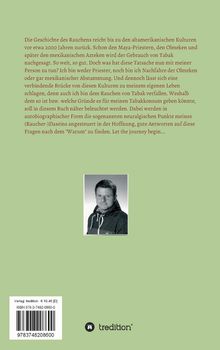 Die Geschichte des Rauchens reicht bis zu den altamerikanischen Kulturen vor etwa 2000 Jahren zurück. Schon den Maya-Priestern, den Olmeken und später den mexikanischen Azteken wird der Gebrauch von Tabak nachgesagt. So weit, so gut. Doch was hat diese Tatsache nun mit meiner Person zu tun? Ich bin weder Priester, noch bin ich Nachfahre der Olmeken oder gar mexikanischer Abstammung. Und dennoch lässt sich eine verbindende Brücke von diesen Kulturen zu meinem eigenen Leben schlagen, denn auch ich bin dem Rauchen von Tabak verfallen. Weshalb dem so ist bzw. welche Gründe es für meinen Tabakkonsum geben könnte, soll in diesem Buch näher beleuchtet werden. Dabei werden in autobiographischer Form die sogenannten neuralgischen Punkte meines (Raucher-)Daseins angesteuert in der Hoffnung, gute Antworten auf diese Fragen nach dem "Warum" zu finden. Let the journey begin...