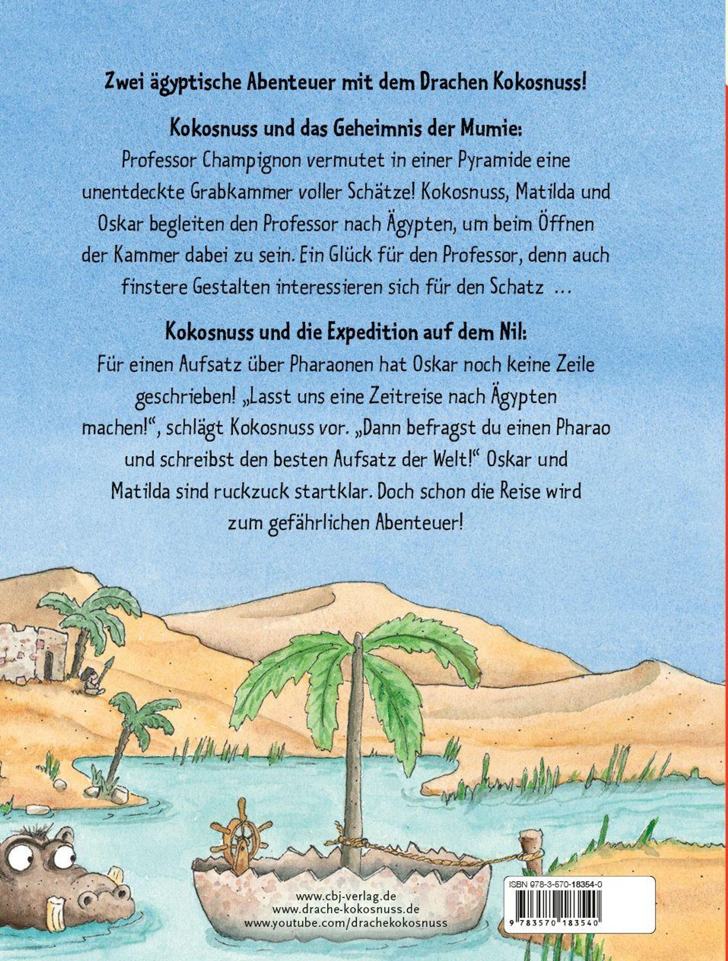 In diesem Doppelband erleben der kleine Drache Kokosnuss und seine Freunde zwei spannende Abenteuer in Ägypten: Zuerst helfen sie dem berühmten Professor Champignon, ein geheimes Pharaonengrab zu finden, dann vertreiben sie habgierige Grabräuber und finden heraus, wie die Ägypter ohne Bagger und Kran ihre Pyramiden gebaut haben.