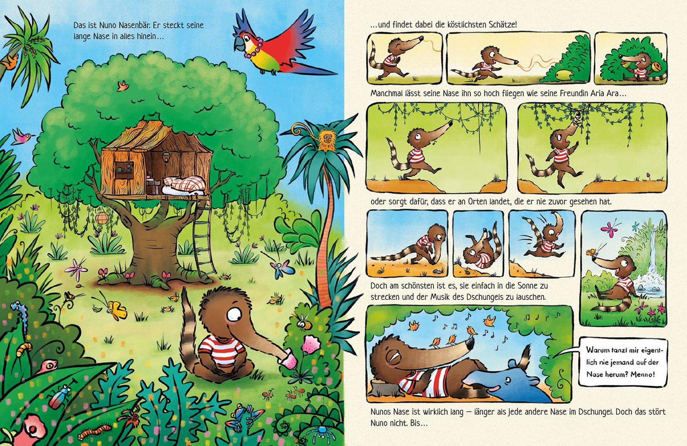 Nuno Nasenbär mag seine lange Nase - meistens jedenfalls. Mit ihr erschnüffelt er die besten Leckereien und oft führt sie ihn an neue, spannende Orte. Doch dann kommt ein Tag, der alles verändert: Nuno verheddert sich mit seiner Nase, stolpert und bringt schließlich sein geliebtes Baumhaus zum Einsturz! Das stellt Nunos Selbstbild gehörig auf den Kopf. Während für ihn von da an ein Nasen-Missgeschick auf das andere folgt, sehen seine Freundinnen und Freunde einen ganz anderen Nuno - und bauen heimlich ein neues Zuhause für ihn. Kann die Wahrnehmung der anderen Nuno mit seiner Nase versöhnen?