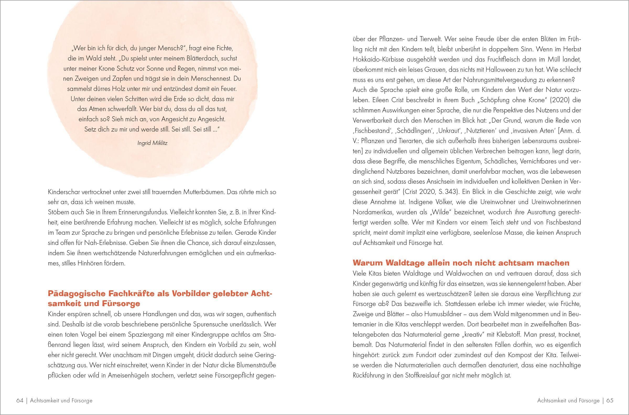Eine nachhaltige, mitweltsensible Pädagogik auf der Grundlage des lebenspraktischen Ansatzes, einer gemeinwohlorientierten Tätigkeitspädagogik, ermöglicht Kindern positive Selbstwirksamkeitserlebnisse und fördert damit ihre Fähigkeit zur Selbstregulierung und ihr Vertrauen in die Zukunft. Kinder brauchen in dieser Zeit multipler Krisen ein von Zuversicht und Heiterkeit geprägtes pädagogisches Umfeld. Das hilft ihnen Vertrauenspolster zu bilden und auch angesichts größerer Probleme handlungsfähig zu bleiben.