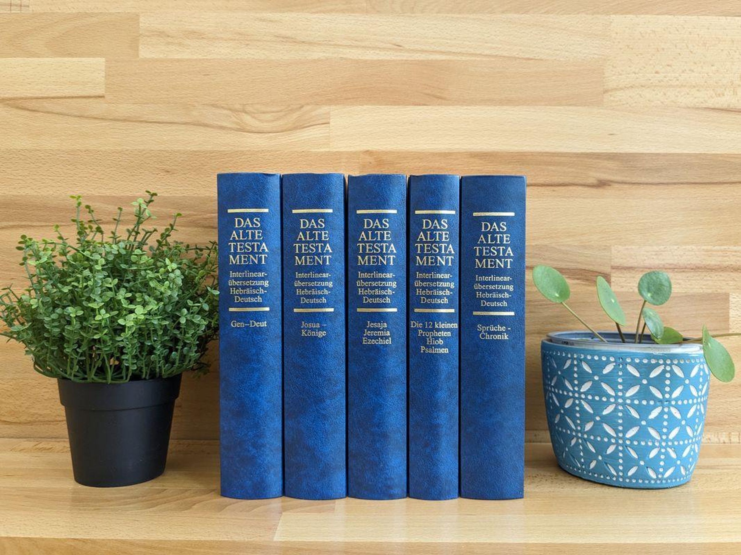 Der erste Band der Interlinearübersetzung Altes Testament mit der Transkription des hebräischen Grundtextes beinhaltet die biblischen Bücher Genesis (1. Mose), Exodus (2. Mose), Leviticus (3. Mose), Numeri (4. Mose) und Deuteronomium (5. Mose). Band 2 beinhaltet die biblischen Bücher Josua, Richter, 1. Samuel, 2. Samuel, 1. Könige und 2. Könige. Band 3 umfasst die biblischen Bücher Jesaja, Jeremia und Ezechiel. Im vierten Band finden Sie die 12 kleinen Propheten (Hosea, Joel, Amos, Obadja, Jona, Micha, Nahum, Habakuk, Zefanja, Haggai, Sacharja, Maleachi), Hiob und die Psalmen. Der fünfte Band zum Alten Testament bietet die Interlinearübersetzung zu Sprichwörter, Ruth, Hohelied, Prediger, Klagelieder, Esther, Daniel, Esra, Nehemia, 1. Chronik und 2. Chronik.