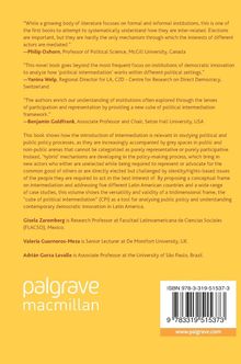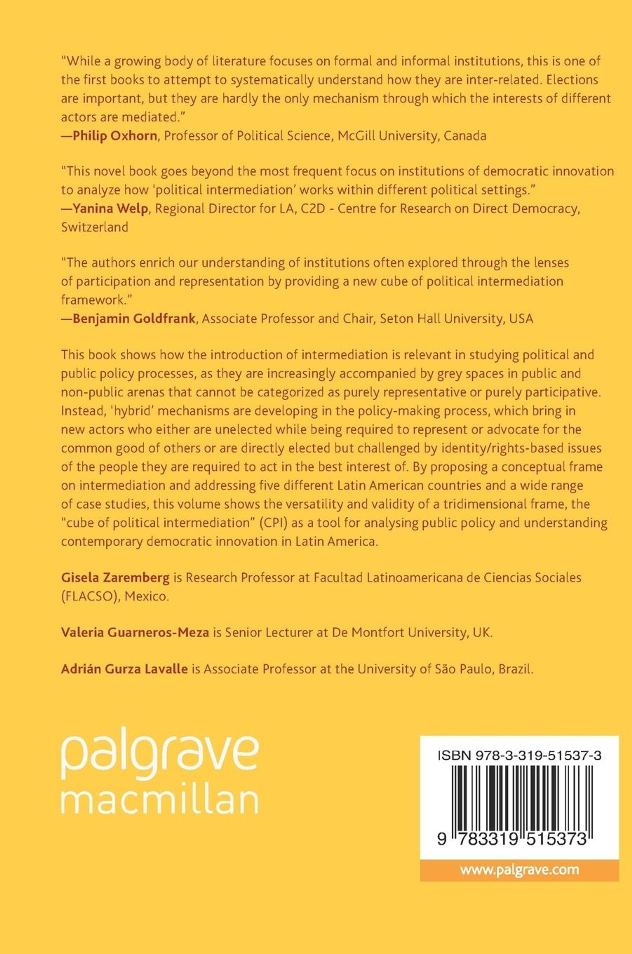 This book shows how the introduction of intermediation is relevant in studying political and public policy processes, as they are increasingly accompanied by grey spaces in public and non-public arenas that cannot be categorized as purely representative or purely participative. Instead, 'hybrid' mechanisms are developing in the policy-making process, which bring in new actors who either are unelected while being required to represent or advocate for the common good of others or are directly elected but challenged by identity / rights-based issues of the people they are required to act in the best interest of. By proposing a conceptual frame on intermediation and addressing five different Latin American countries and a wide range of case studies -from human rights, labour relations, neighbourhood management, municipal bureaucracies, social accountability, to complex national systems of citizen participation-this volume shows the versatility and validity of a tridimensional frame, the "cube of political intermediation" (CPI) as a tool for analysing public policy and understanding contemporary democratic innovation in Latin America.