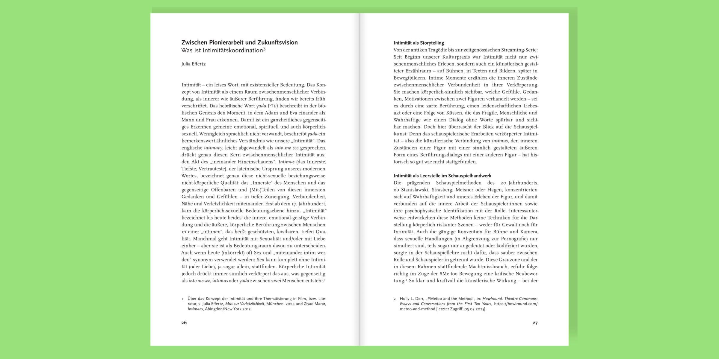 Dieses Buch zeigt auf, warum professionelle Intimitätskoordination unerlässlich ist: Sie ermöglicht sichere Rahmenbedingungen für alle Beteiligten einer Theater-, Opern- oder Filmproduktion und schafft einen künstlerischen Freiraum, der intime Szenen überzeugend werden lässt. Das Buch liefert unverzichtbares Wissen für alle Intimitätskoodinator: innen, Schauspieler: innen, Regisseur: innen, Produzent: innen und Intendant: innen.