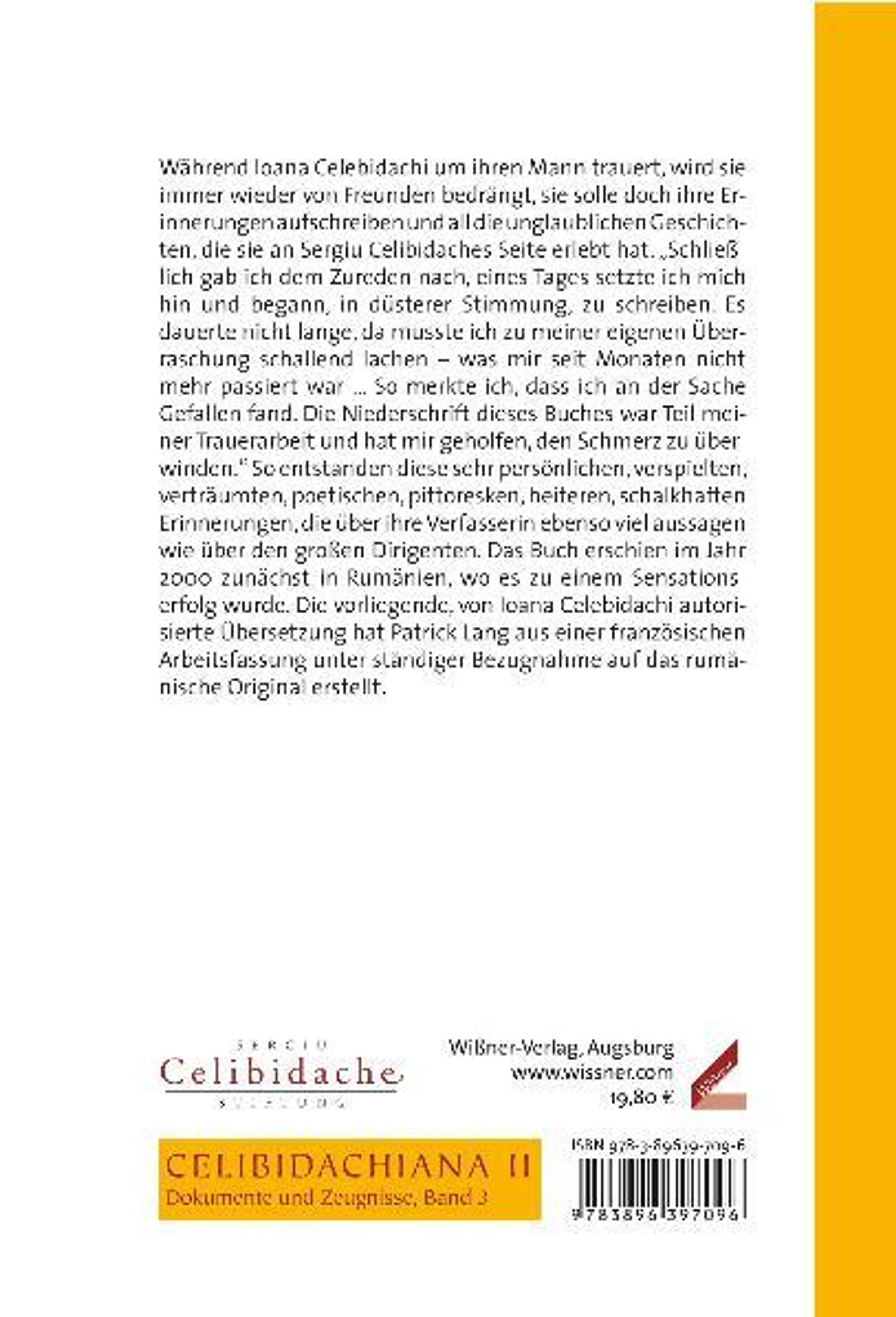 Während Ioana Celebidachi um ihren Mann trauert, wird sie immer wieder von Freunden bedrängt, sie solle doch ihre Erinnerungen aufschreiben und all die unglaublichen Geschichten, die sie an Sergiu Celibidaches Seite erlebt hat. "Schließlich gab ich dem Zureden nach, eines Tages setzte ich mich hin und begann, in düsterer Stimmung, zu schreiben. Es dauerte nicht lange, da musste ich zu meiner eigenen Überraschung schallend lachen - was mir seit Monaten nicht mehr passiert war. So merkte ich, dass ich an der Sache Gefallen fand. Die Niederschrift dieses Buches war Teil meiner Trauerarbeit und hat mir geholfen, den Schmerz zu überwinden." So entstanden diese sehr persönlichen, verspielten, verträumten, poetischen, pittoresken, heiteren, witzigen Erinnerungen, die über ihre Verfasserin ebenso viel aussagen wie über den großen Dirigenten. Das Buch erschien zunächst im Jahre 2000 in Rumänien, wo es zu einem Sensationserfolg wurde. Die vorliegende, von Ioana Celebidachi autorisierte Übersetzung hat Patrick Lang aus einer französischen Arbeitsfassung unter ständiger Bezugnahme auf das rumänische Original erstellt. (Kadja Grönke, DIE TONKUNST, Juli 2011) Celibidaches Witwe, die rumänische Malerin Ioana geb. Procopie Dhnitrescu, hat ihre Trauer um den Ehemann in kurzen Erinnerungsskizzen verarbeitet, die teils nur für Eingeweihte verständlich sind, teils auf sehr sympathische Weise den Menschen Celibidache neu beleuchten. Die 120 kleinen Seiten zeigen nach und nach einen Weg heraus aus der Trauer und sind zugleich ein liebevolles, manchmal skurriles Bild einer großen Liebe.