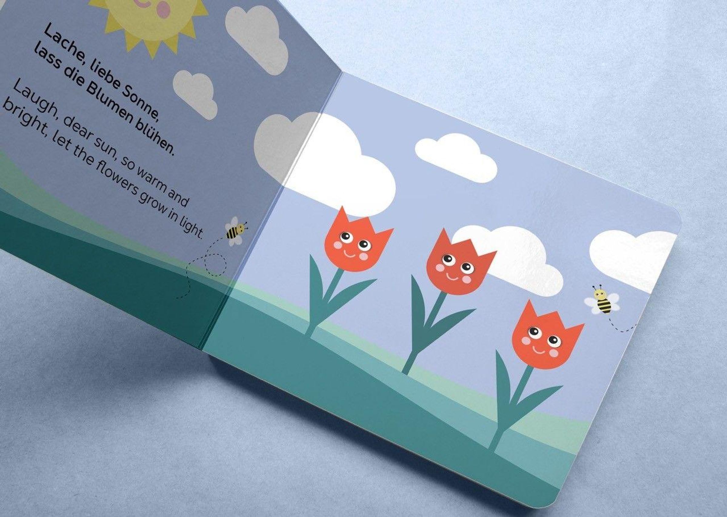 Lache liebe Sonne / Laugh Dear Sun ist ein zweisprachiges Pappbilderbuch, das Babys und Kleinkinder spielerisch an Sprache heranführt.
