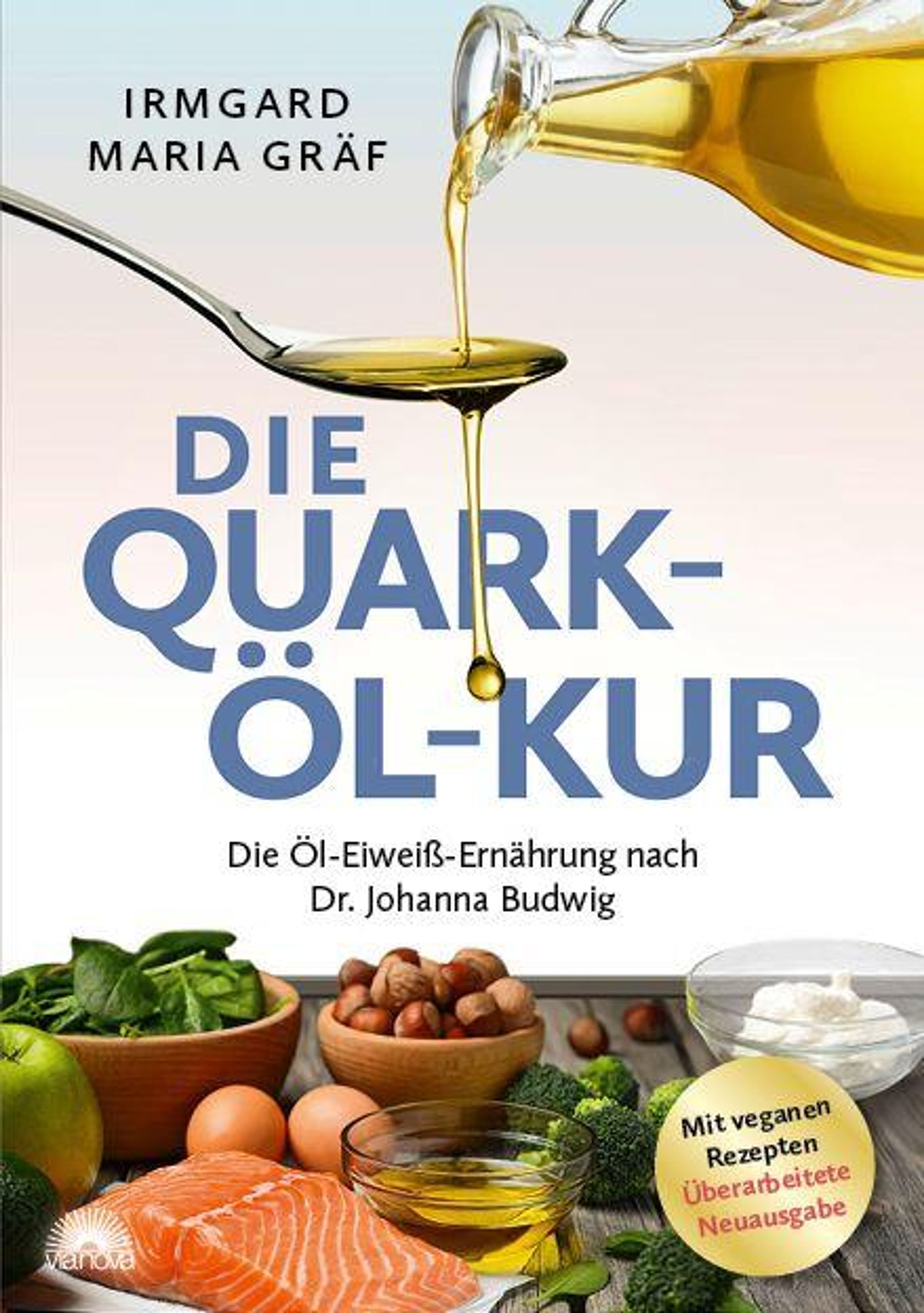 "Die Quark-Öl-Kur" von Irmgard Maria Gräf. Zutaten wie Spinat, Nüsse und Öl werden gezeigt., Buch
