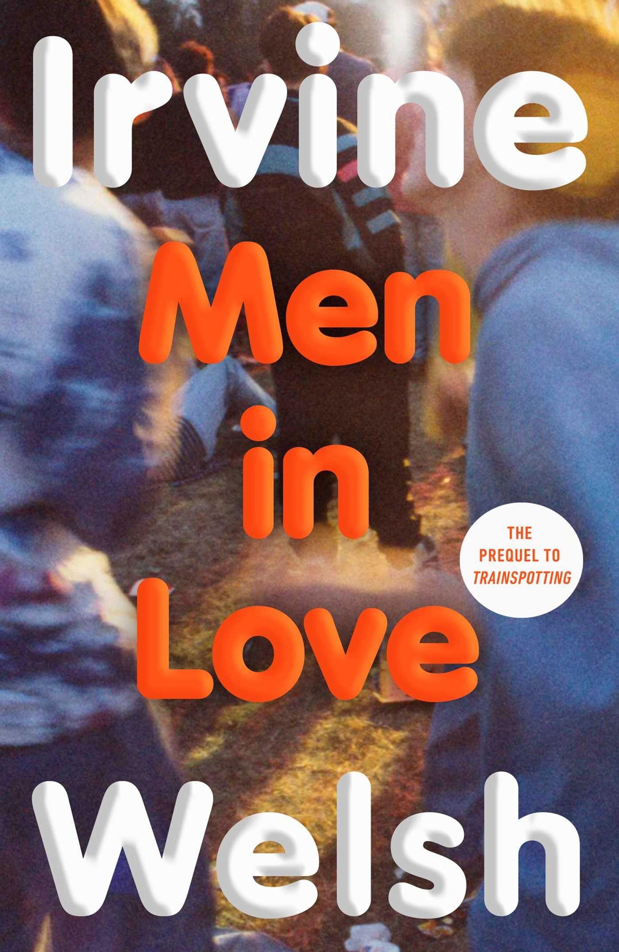 Text: "Irvine Welsh Men in Love" und "The prequel to Trainspotting". Menschen in einer unscharfen, lebhaften Szene., Buch