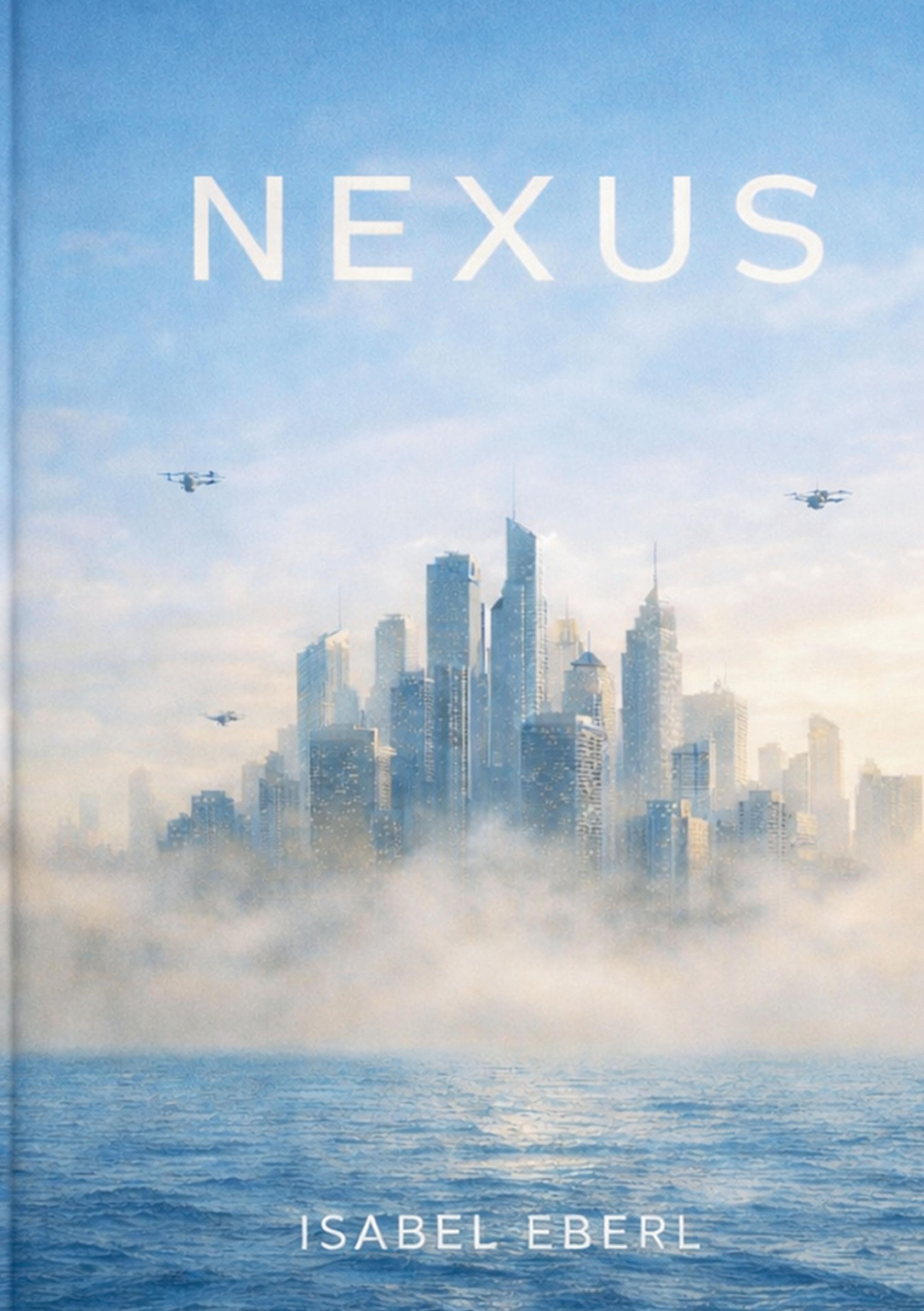 „NEXUS“, „ISABEL EBERL“. Drohnen fliegen über nebelverhüllter futuristischer Stadt und Wasser., Buch